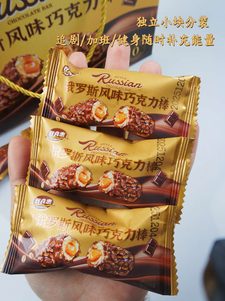 【品名】俄罗斯风味巧克力棒 【规格】230g/箱*1箱 【储存条件】阴凉干燥处常温保存 【保质期】6个月 【生产日期】最新(随批次更新) 【发货地】福建省漳州市 【生产地】福建省漳州市 【发货时效】72小时内 【快递公司】邮政 【不发货地区】新疆、西藏、青海、甘肃、宁夏、内蒙古、港澳台 【加运费地区】北京、上海+1元/件 【售后规则】 1:食品类不支持7天无理由退换货,礼盒类不支持拦截拒收,介意慎拍 2:若收到产品有质量问题或者破损少件,请签收24小时内对产品拍照+快递箱面单照片联系售后处理 3:个人口味/喜好问题不在售后范围内