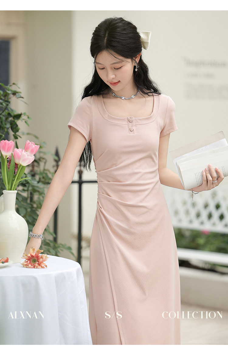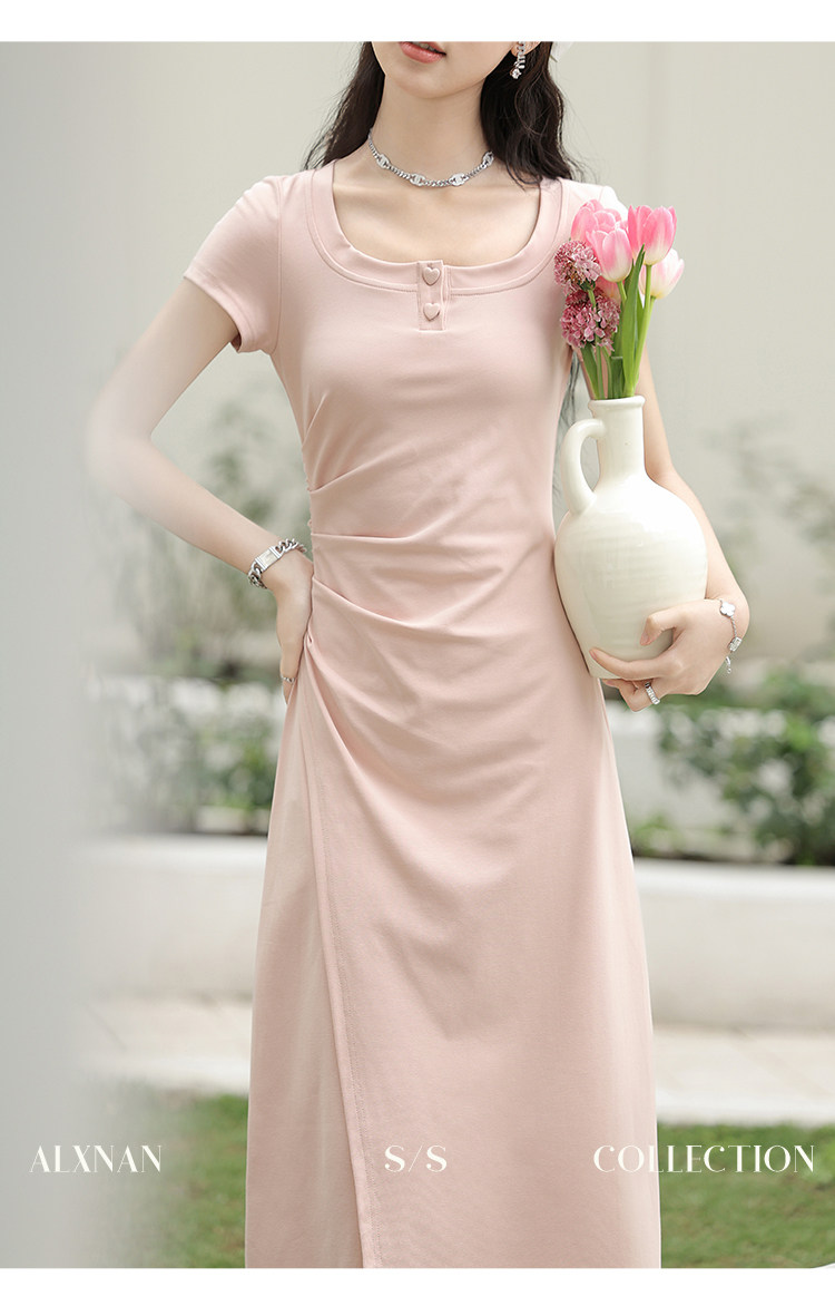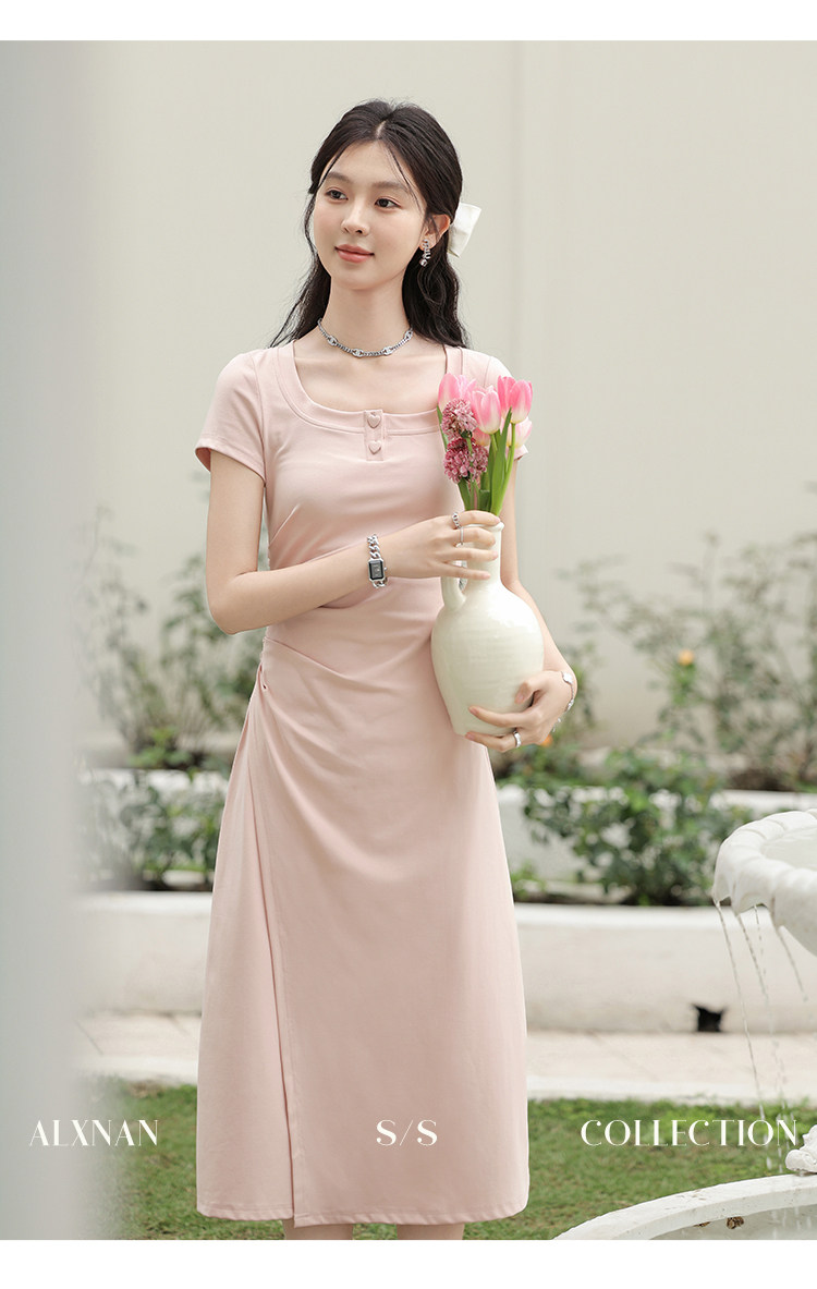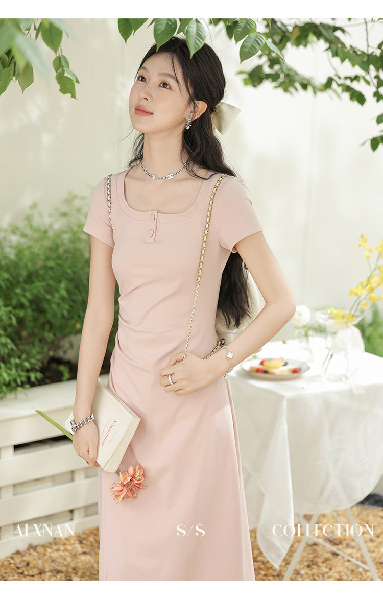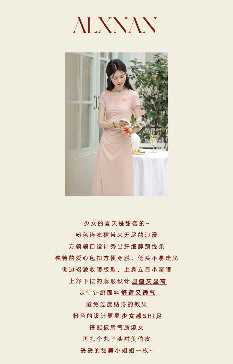 鹿向南「草莓生巧」粉色短袖连衣裙2026新款女夏季法式气质长裙子
