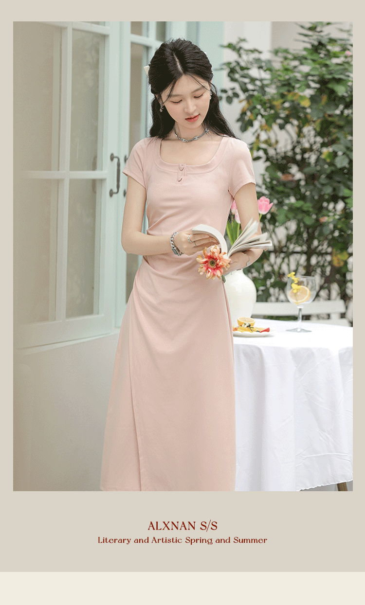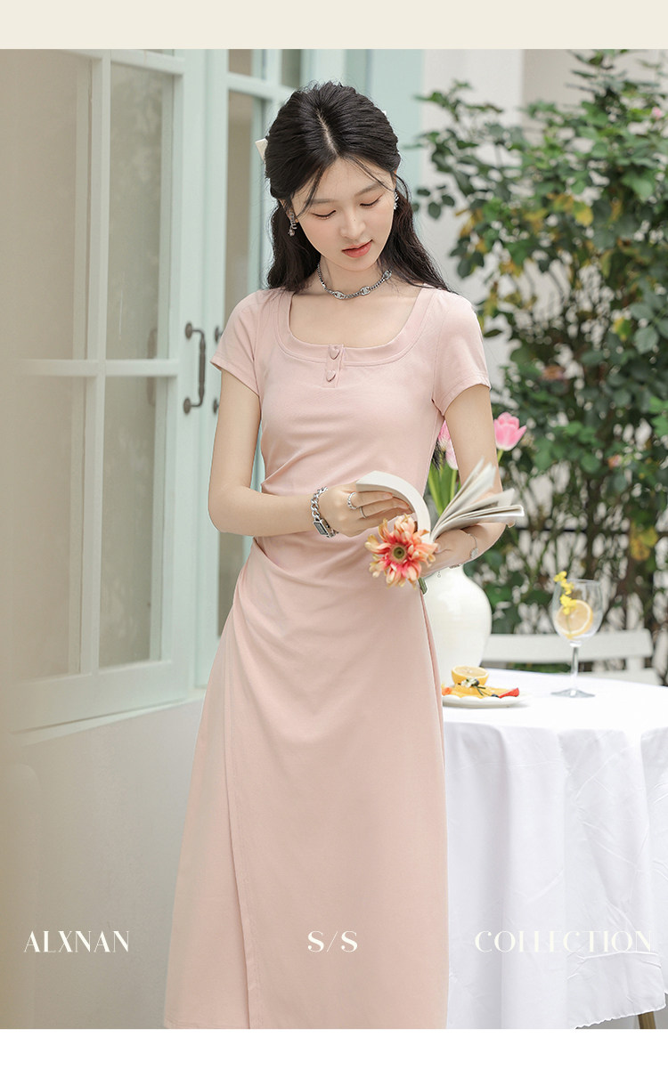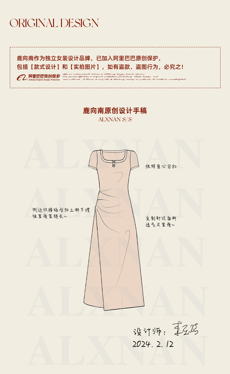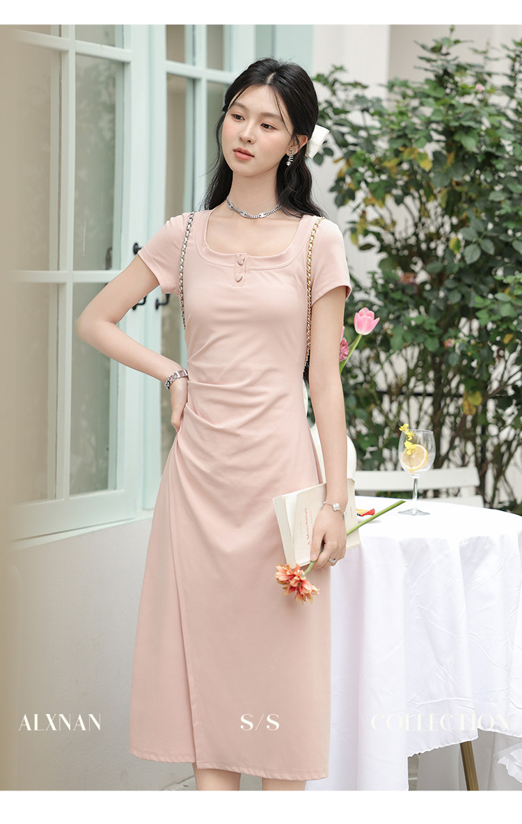 鹿向南「草莓生巧」粉色短袖连衣裙2026新款女夏季法式气质长裙子