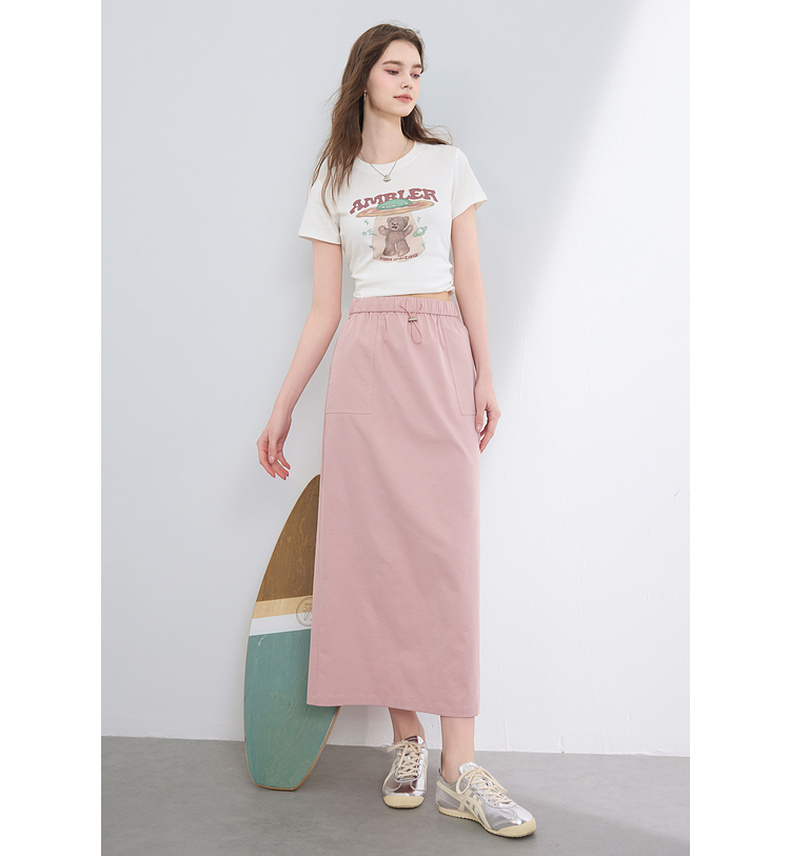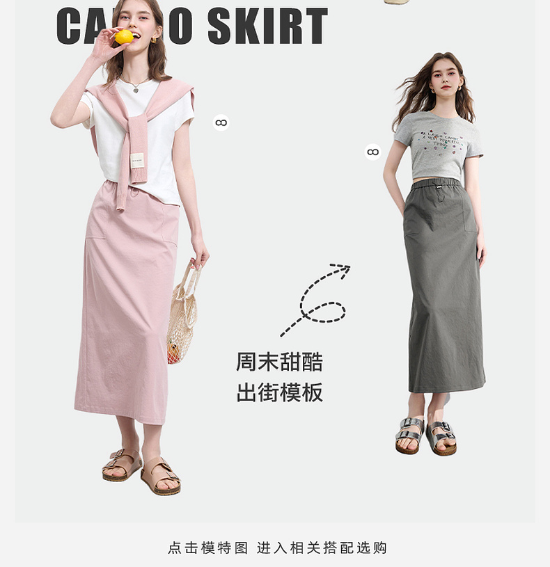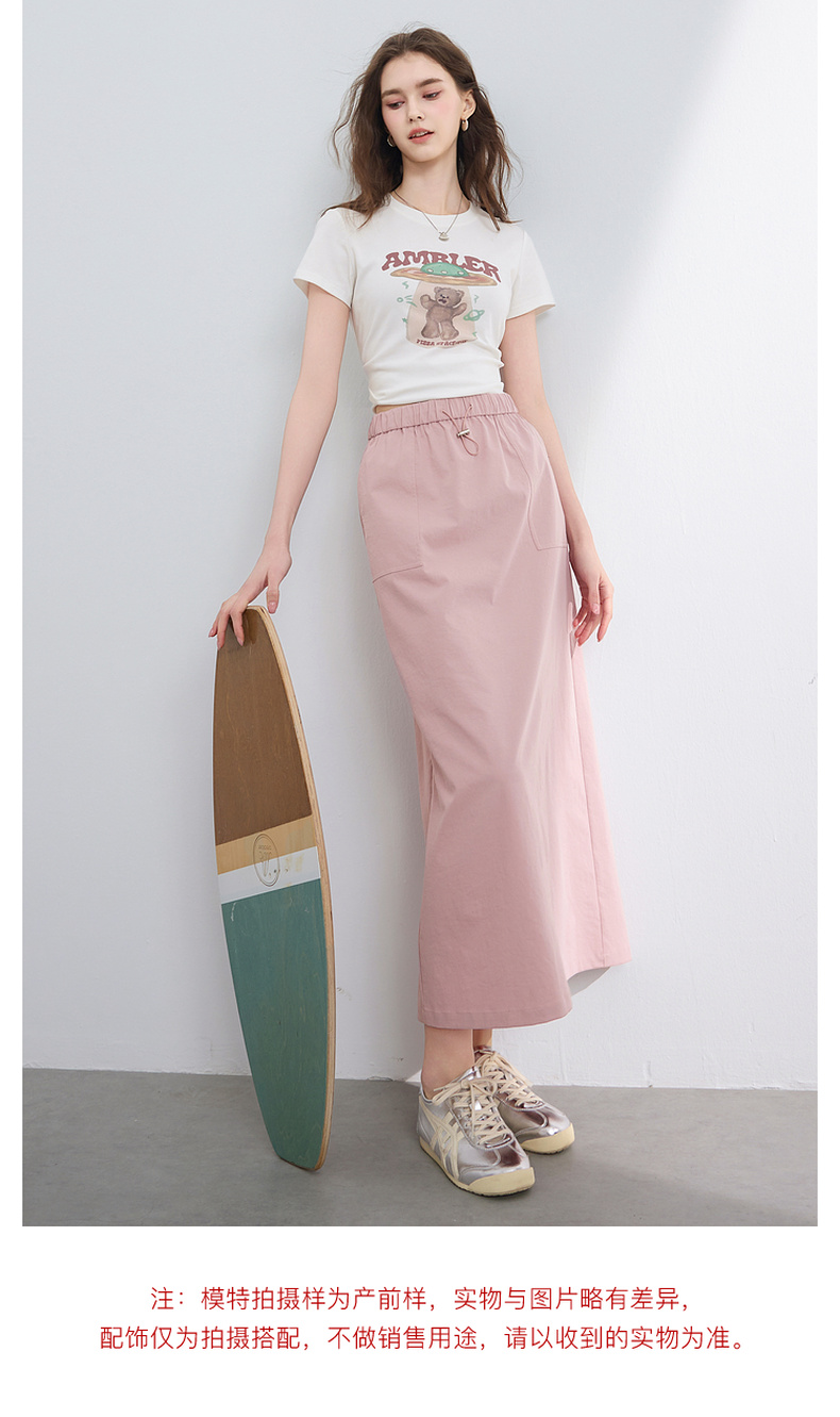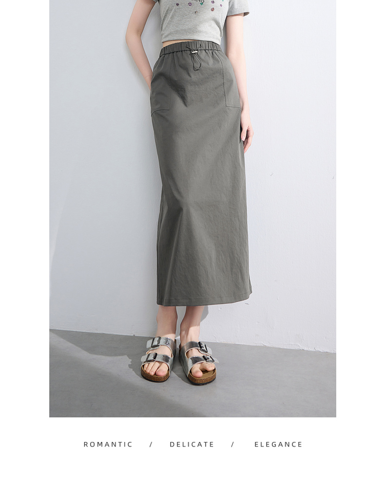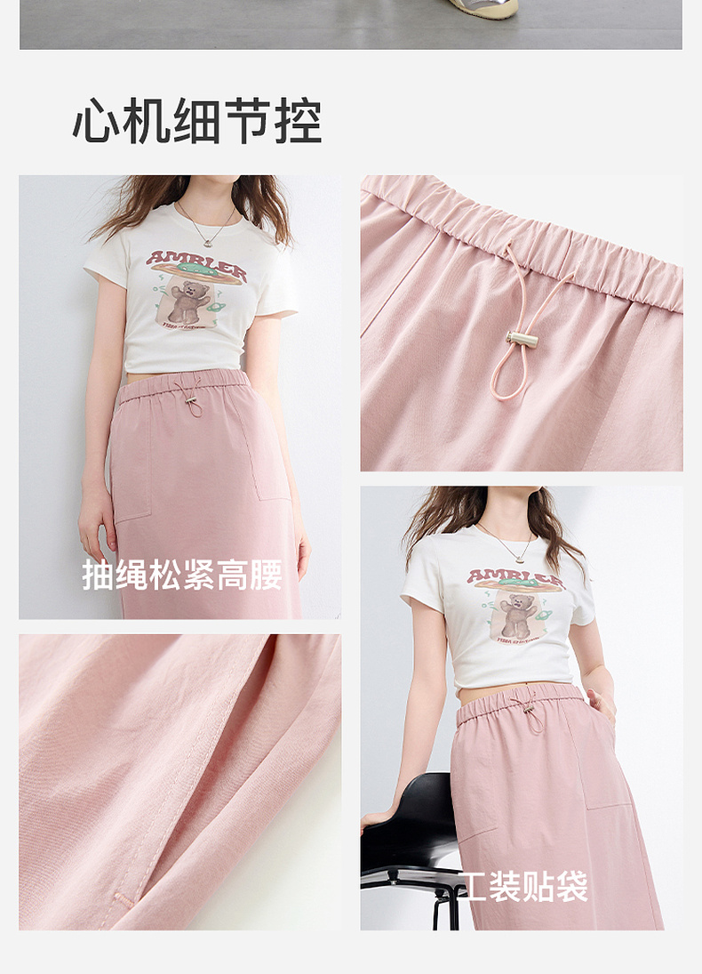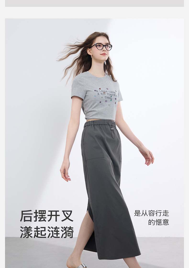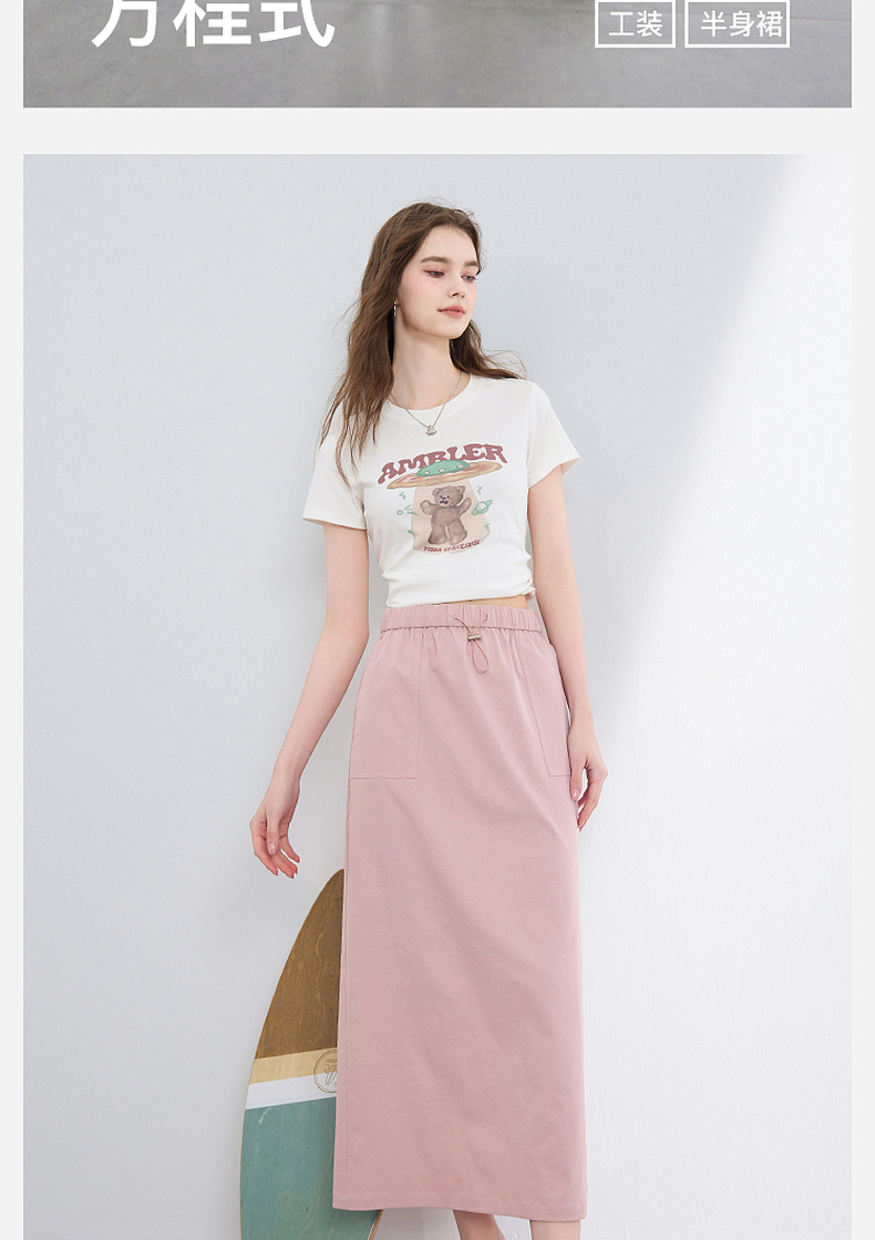 三彩2025夏季新款户外工装风半身裙松紧高腰直筒裙开叉长裙M