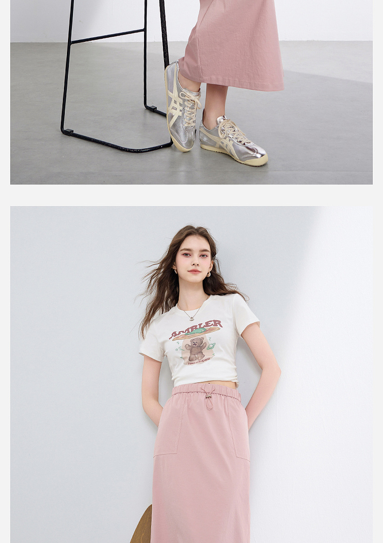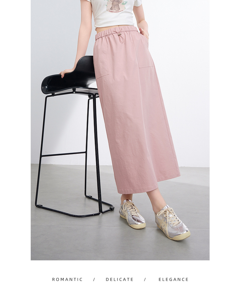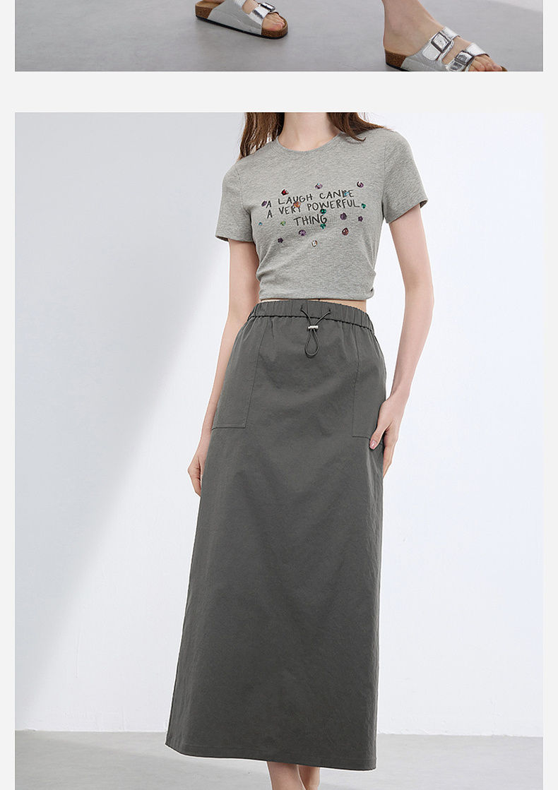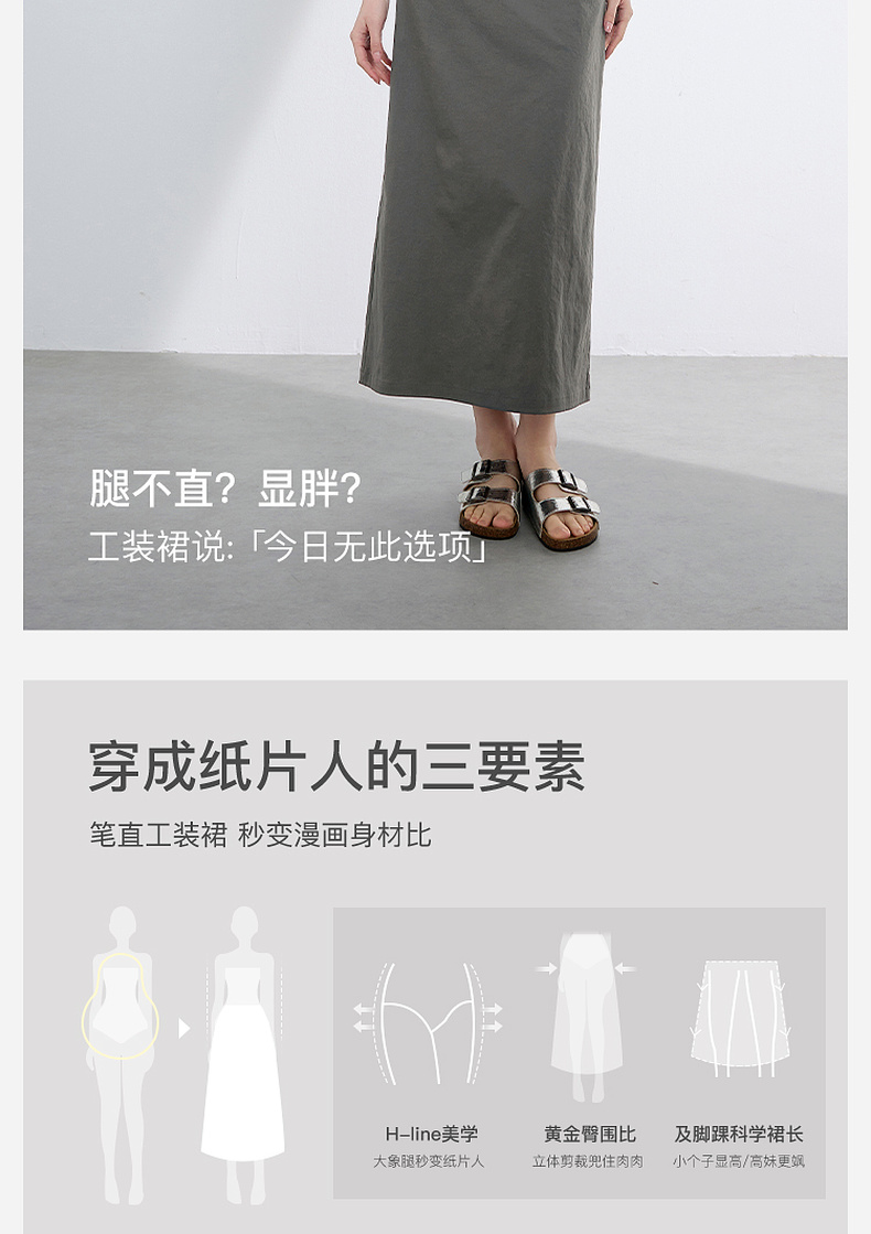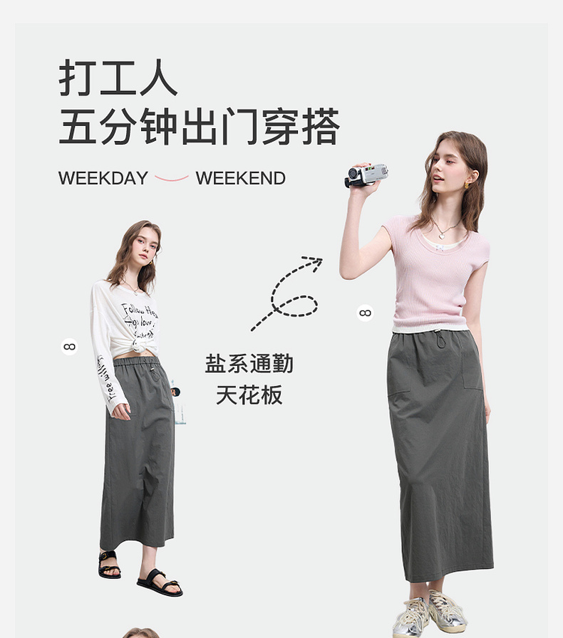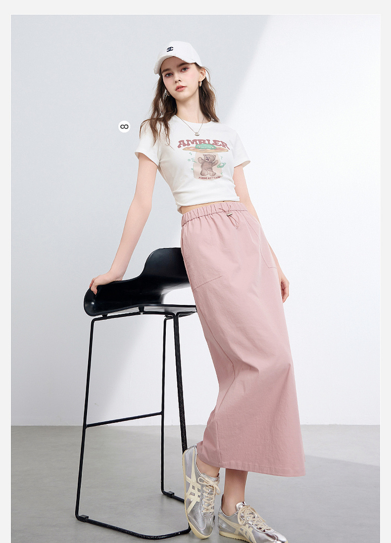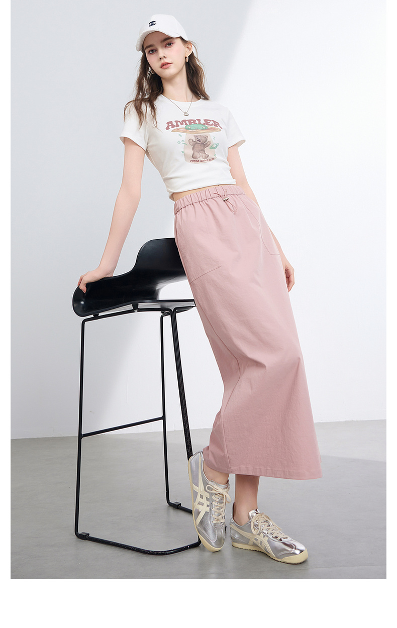 三彩2025夏季新款户外工装风半身裙松紧高腰直筒裙开叉长裙M