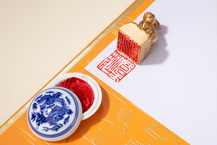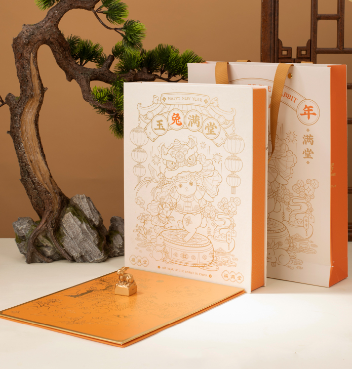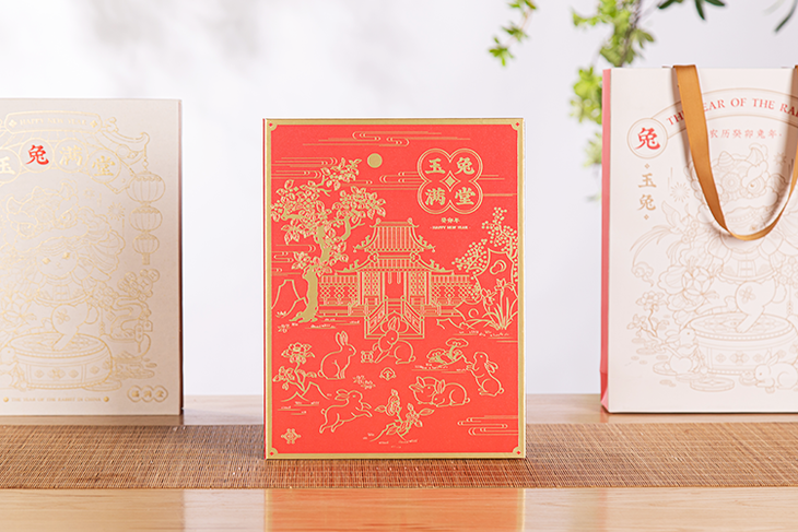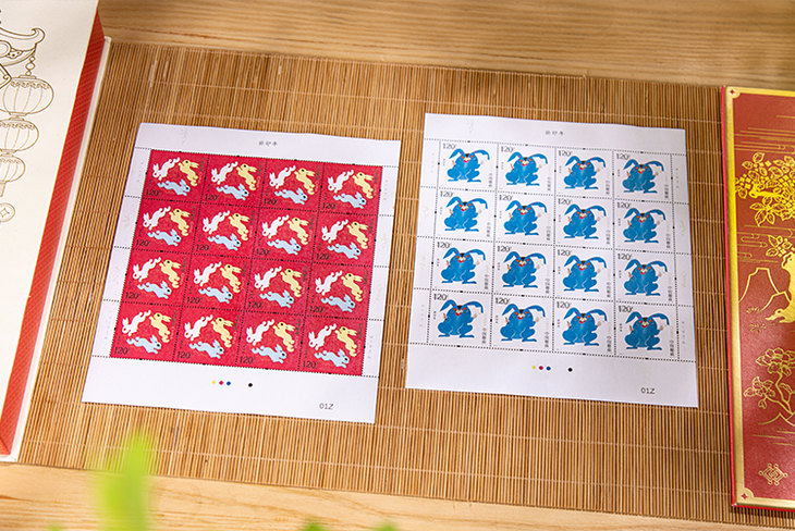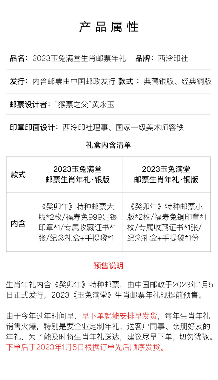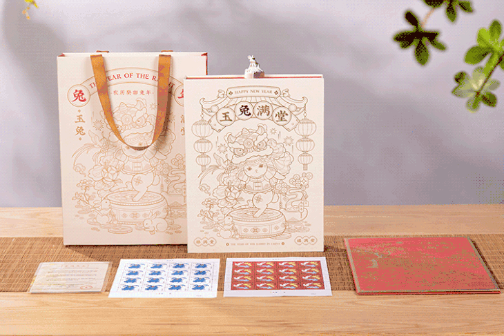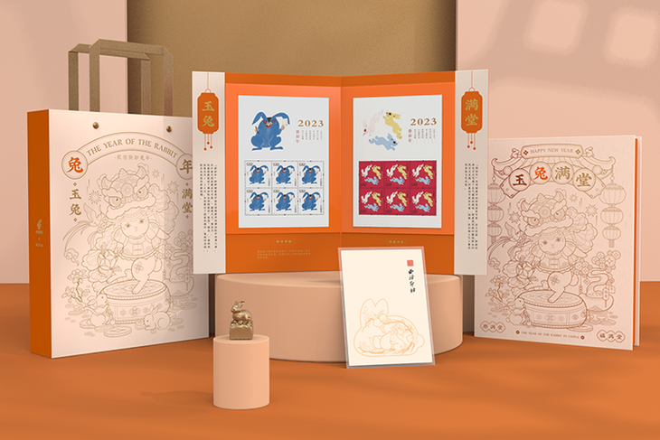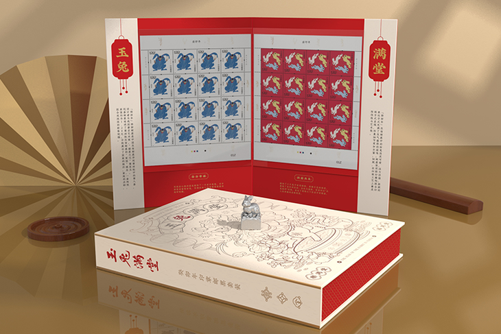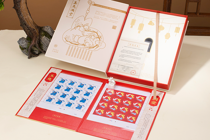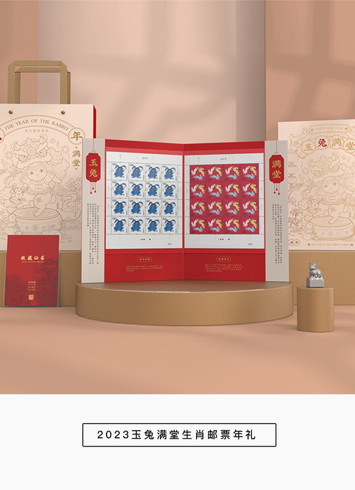 于是,我们联手西泠印社,向中国邮政预定了少量大小版《癸卯年》兔年生肖邮票,打造了这套2023《玉兔满堂》生肖印章邮票年礼 。