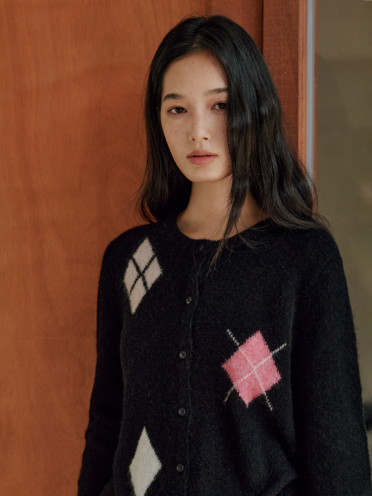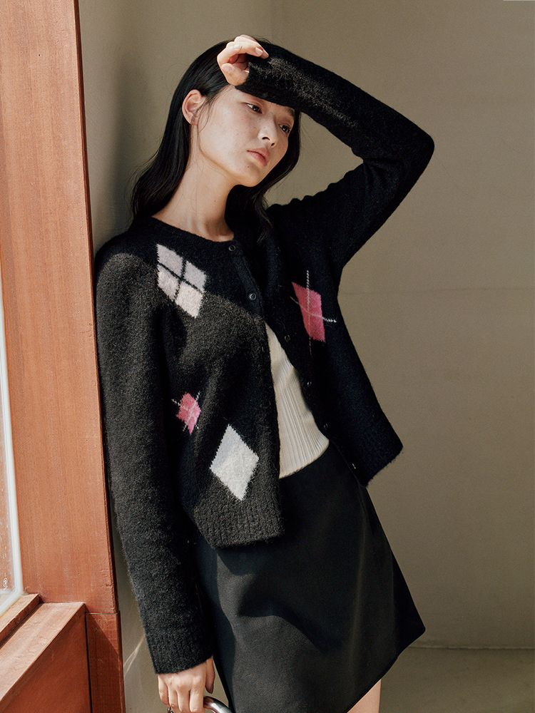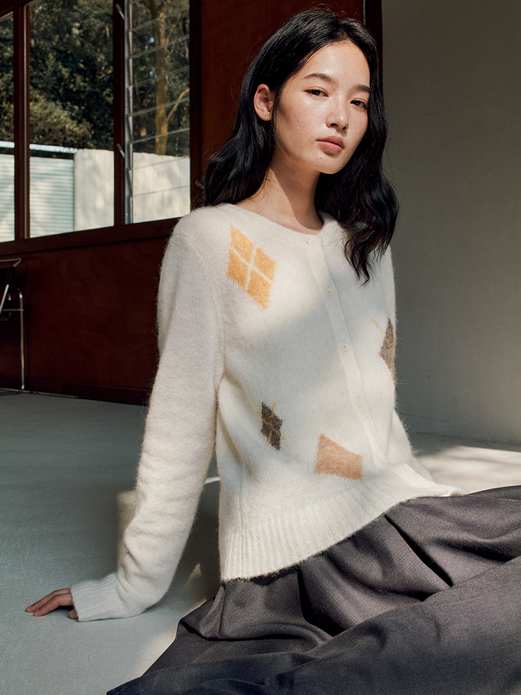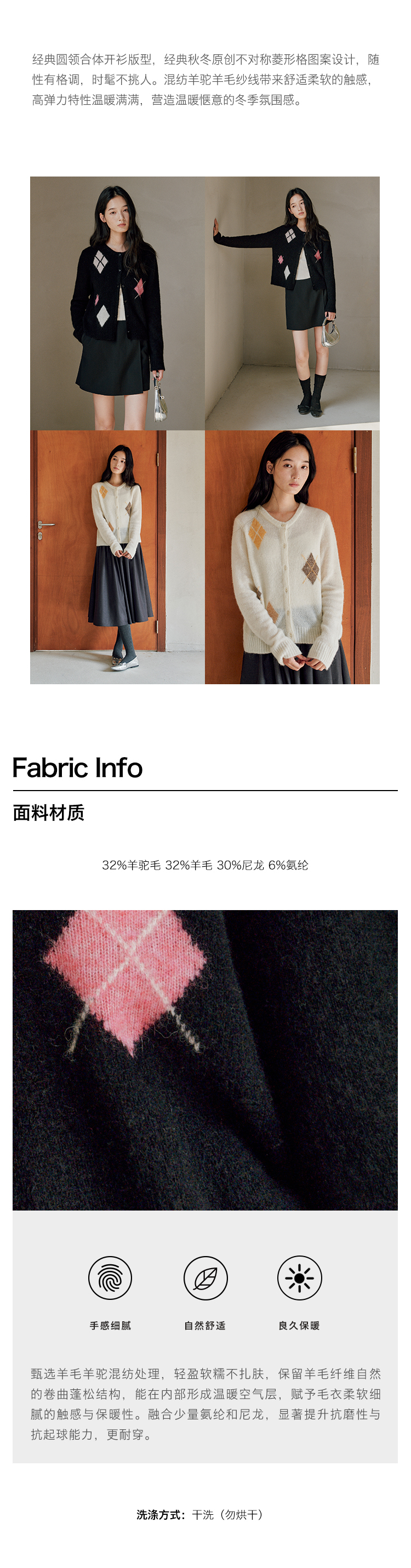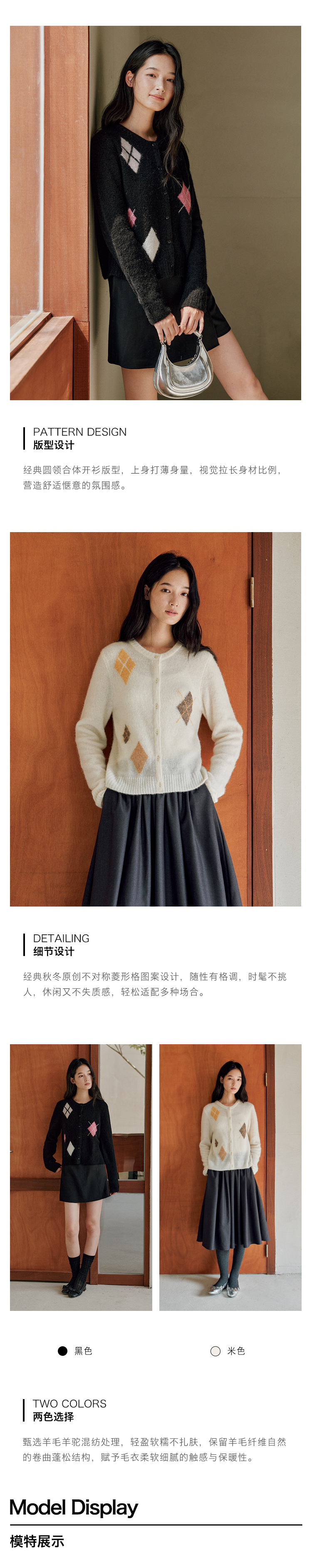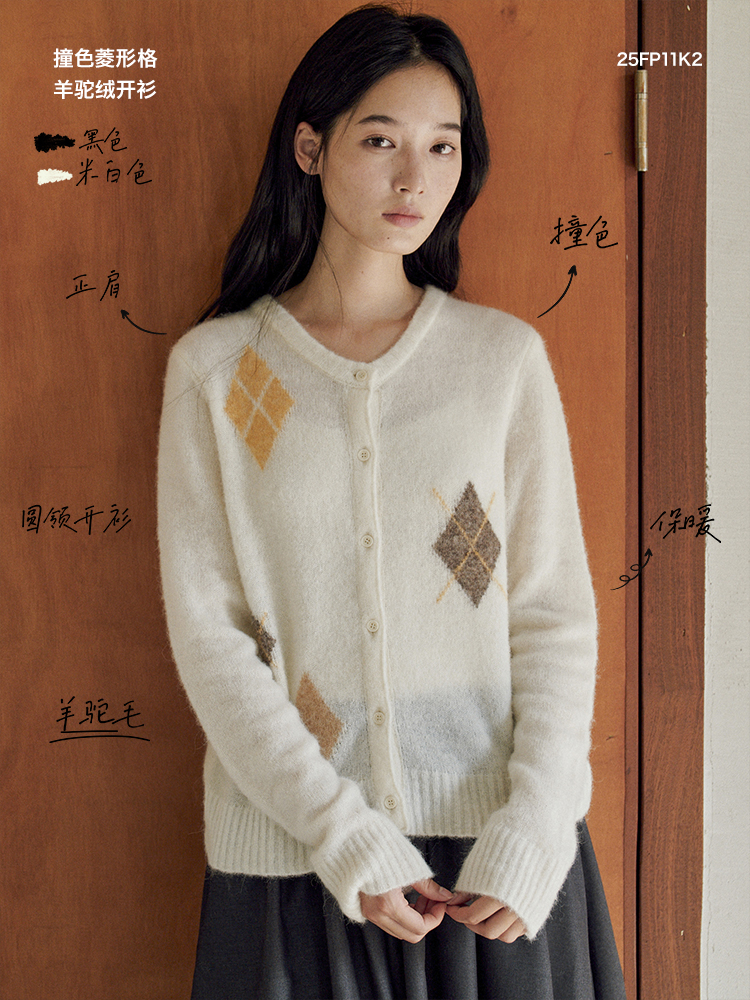 ForPoem 25/FW 原创设计撞色菱形格羊驼毛羊毛针织开衫外套女秋冬