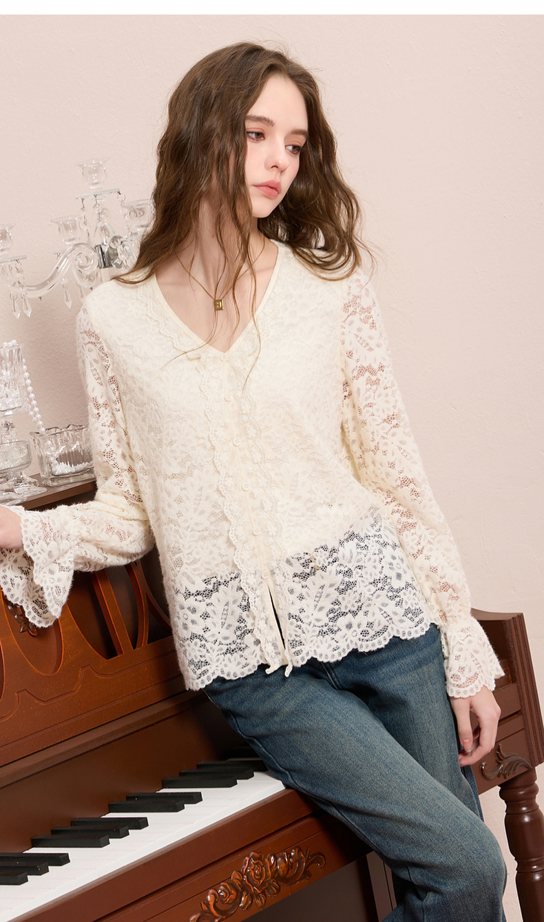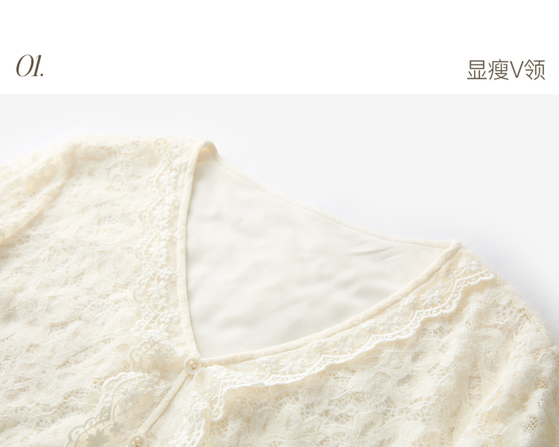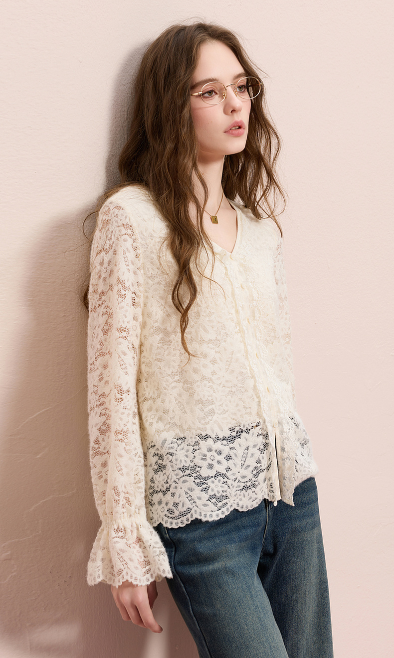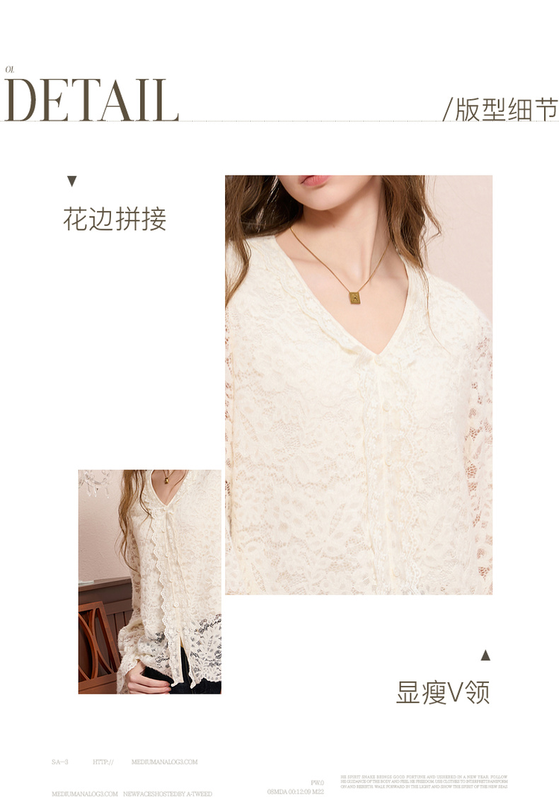 三彩2025冬季新款蕾丝衫V领小衫喇叭袖拼接套头优雅M