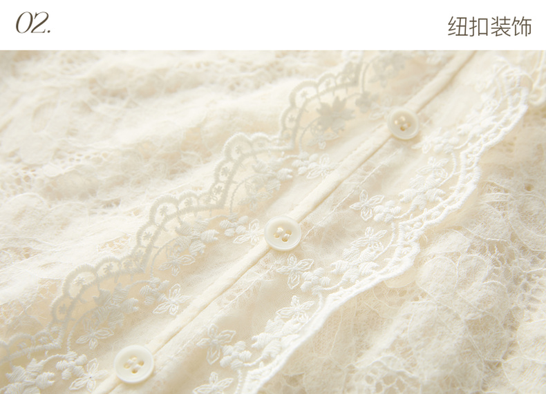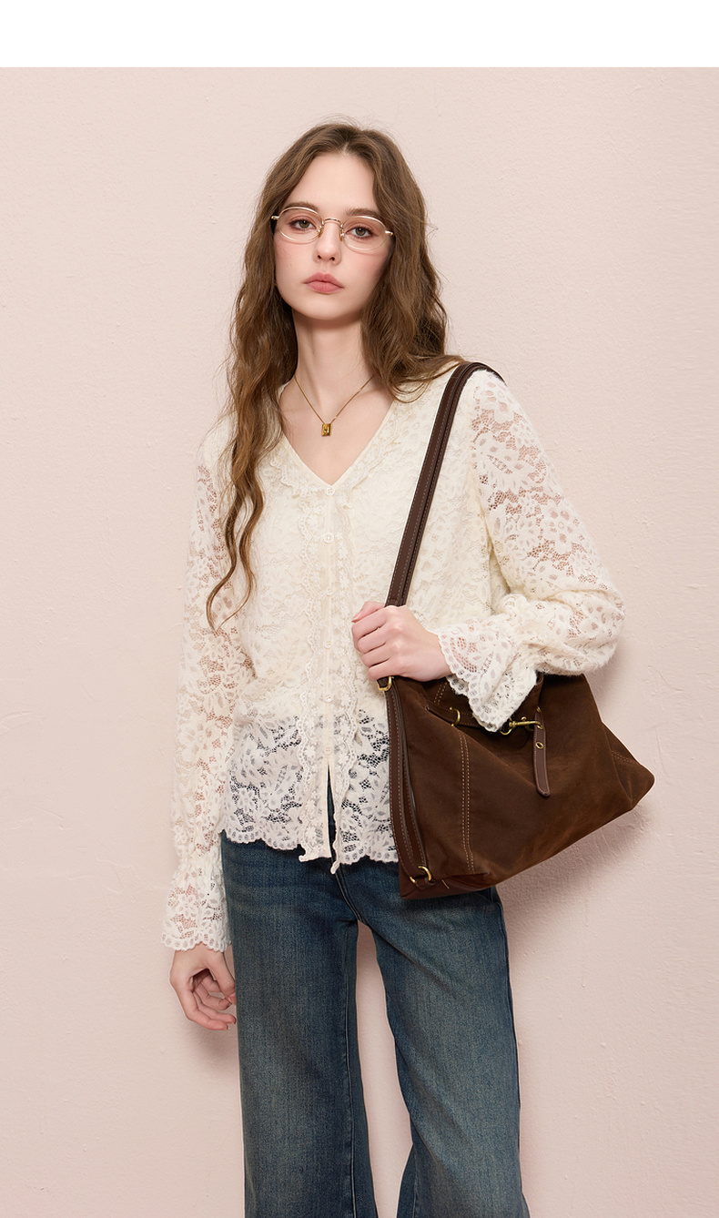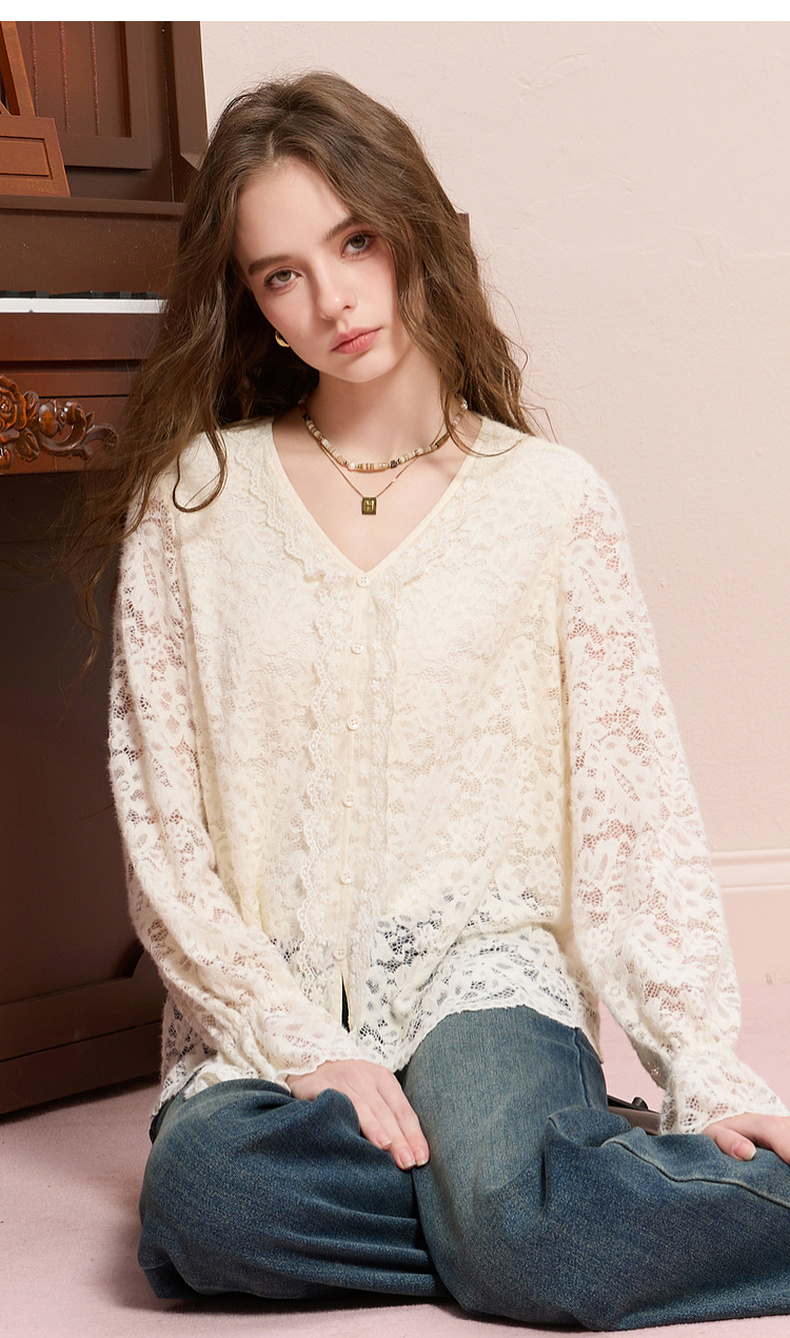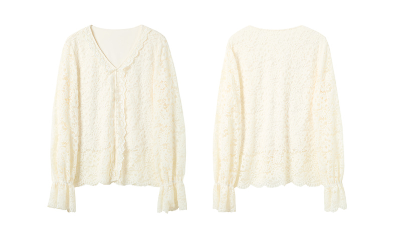 三彩2025冬季新款蕾丝衫V领小衫喇叭袖拼接套头优雅M
