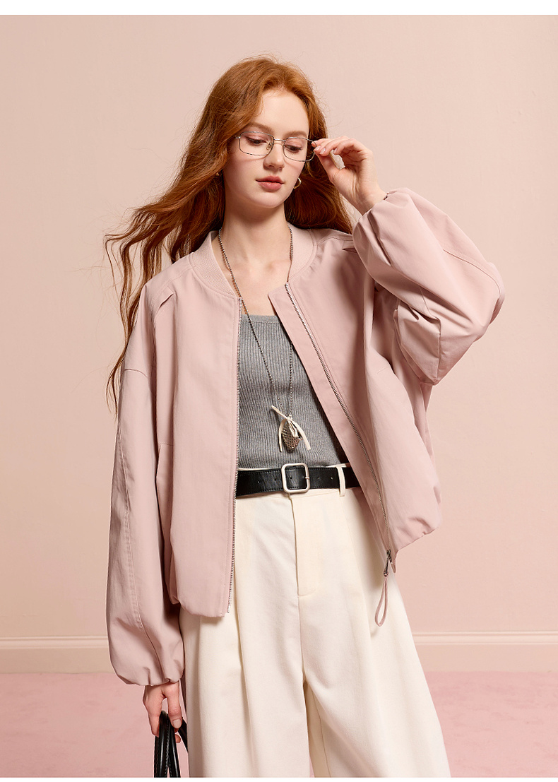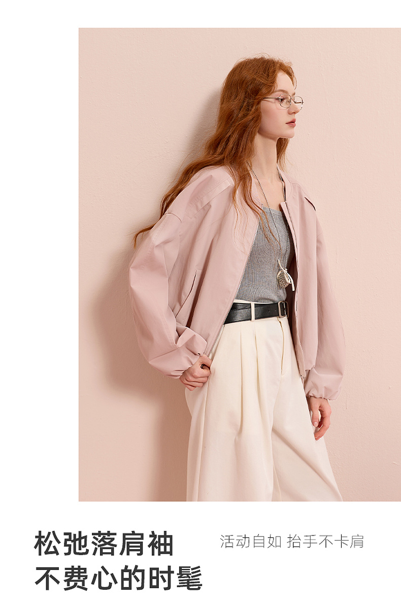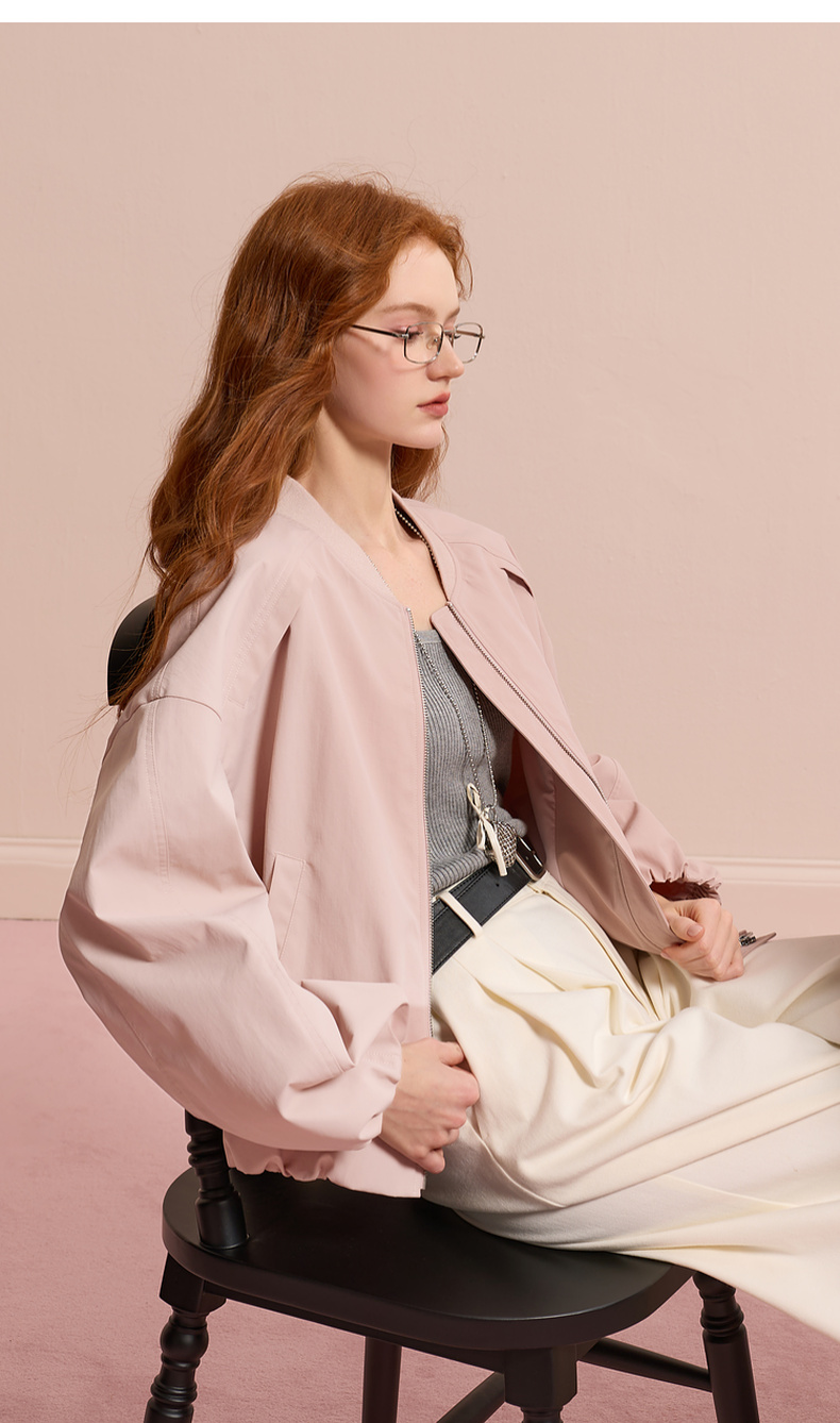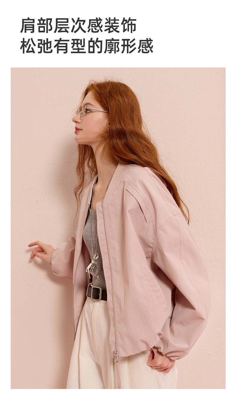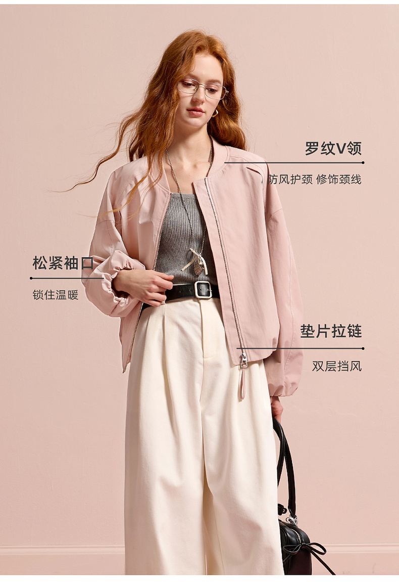 三彩2026春季新款休闲V领拉链外套宽松廓形开衫简约粉色M