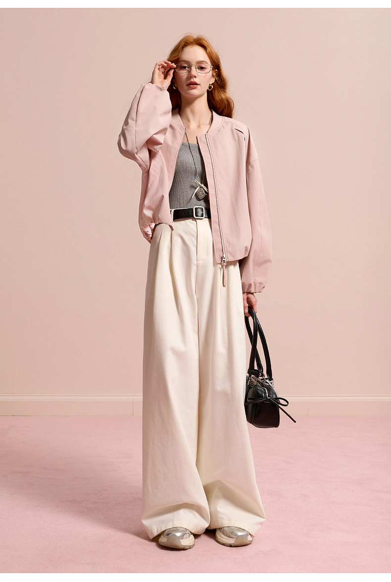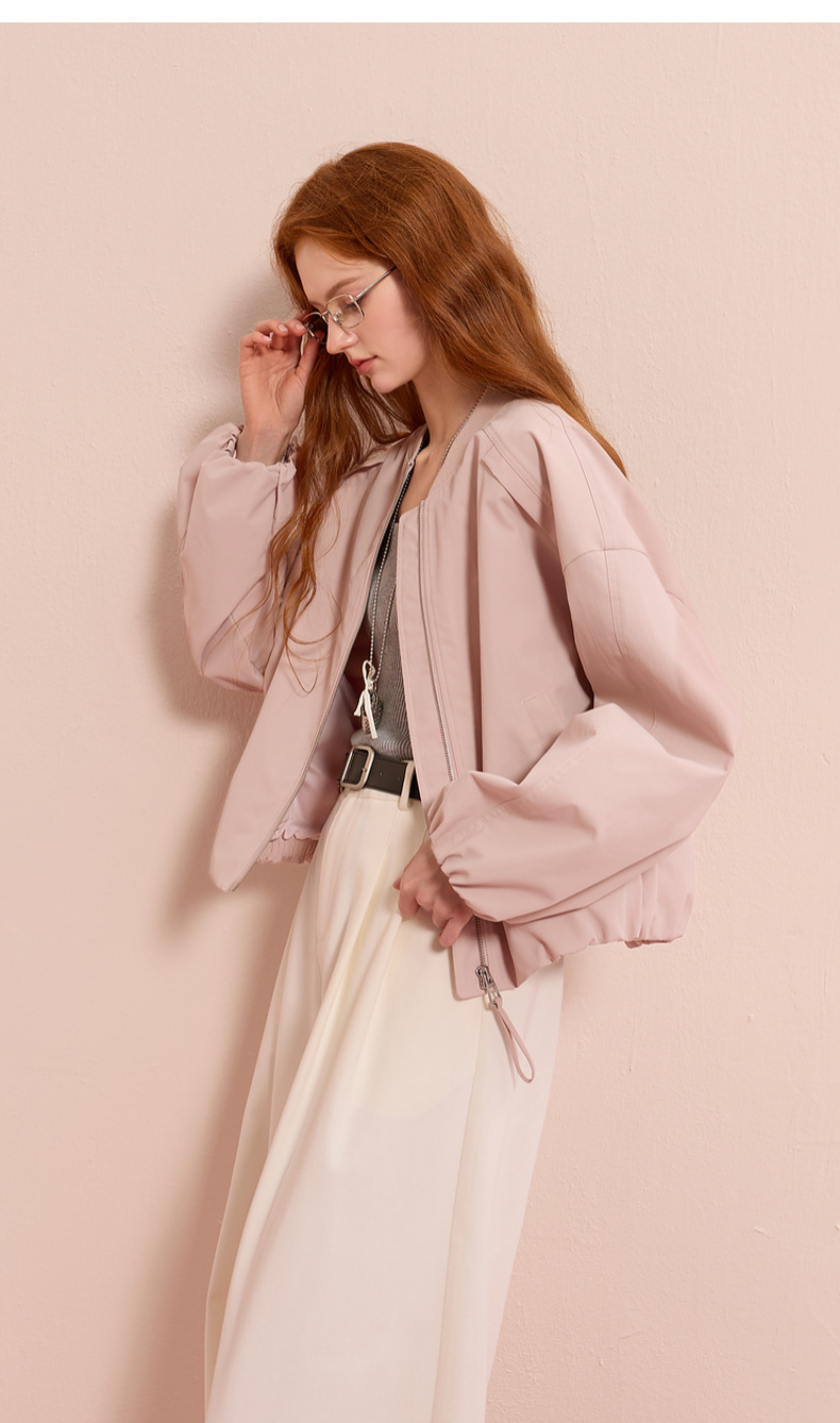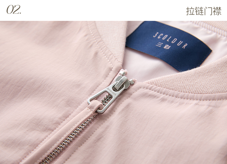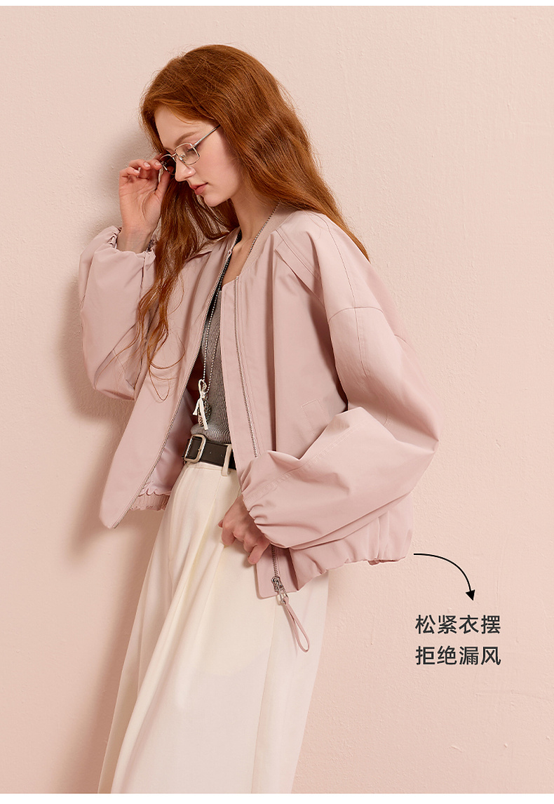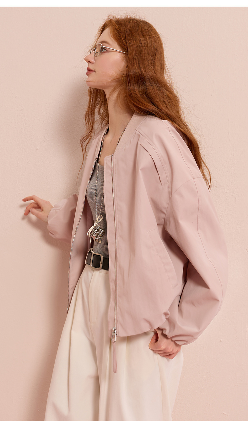 三彩2026春季新款休闲V领拉链外套宽松廓形开衫简约粉色M
