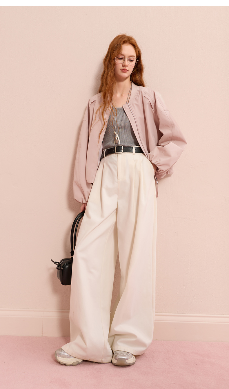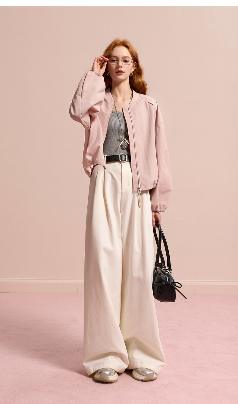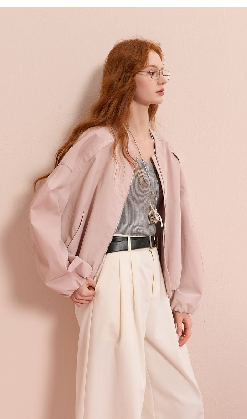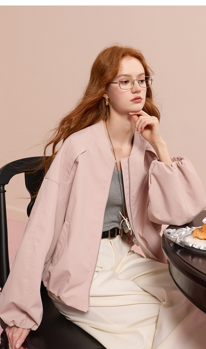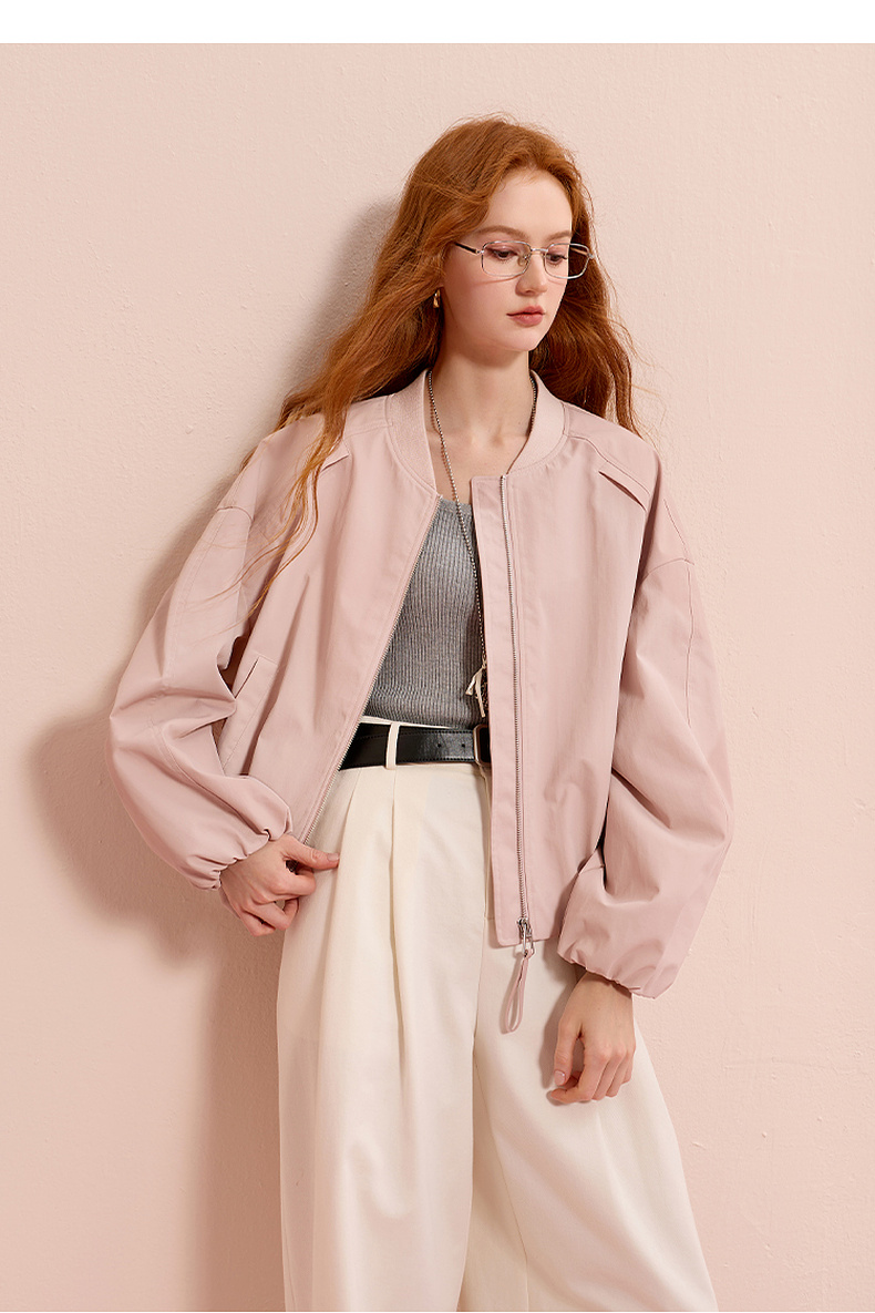 三彩2026春季新款休闲V领拉链外套宽松廓形开衫简约粉色M