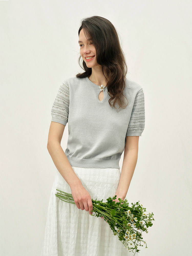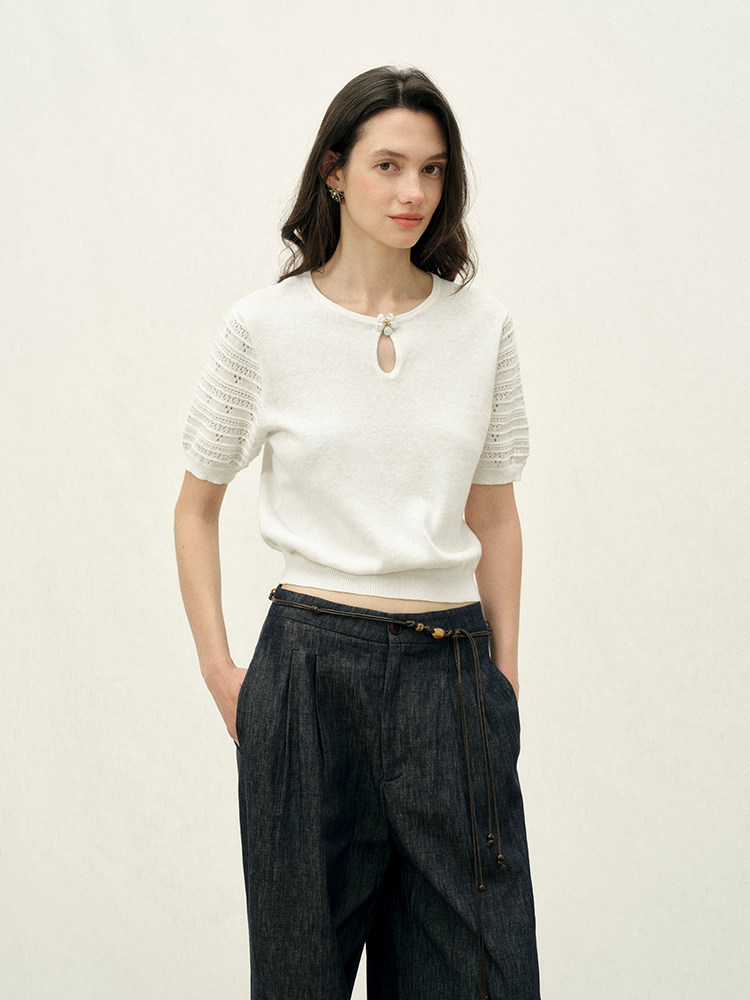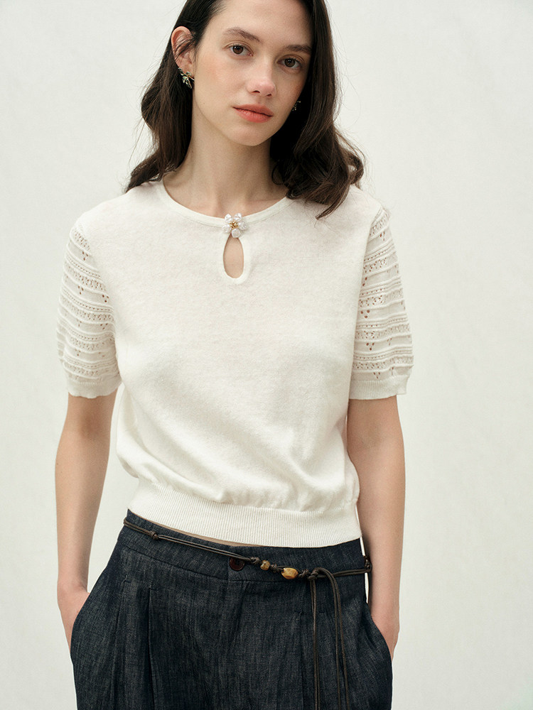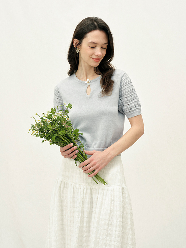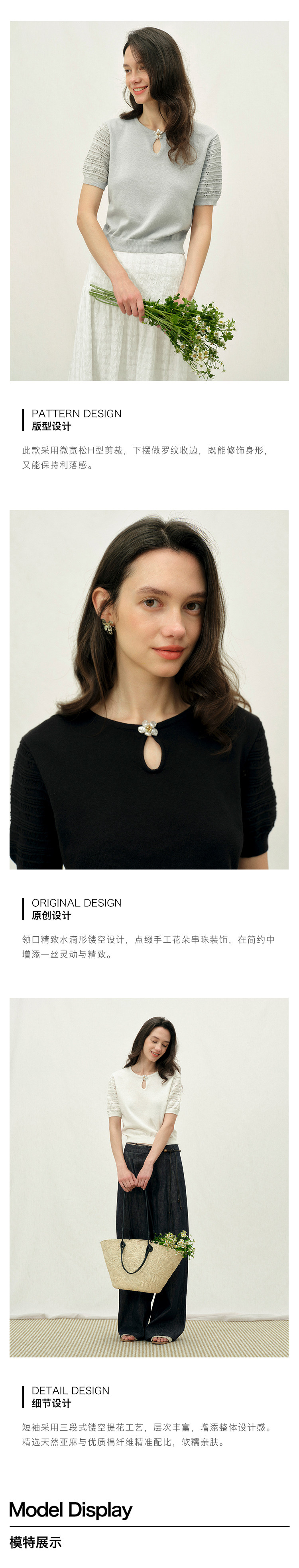 ForPoem 26/SS 原创设计棉麻混纺水滴领花朵针织上衣宽松H型短袖