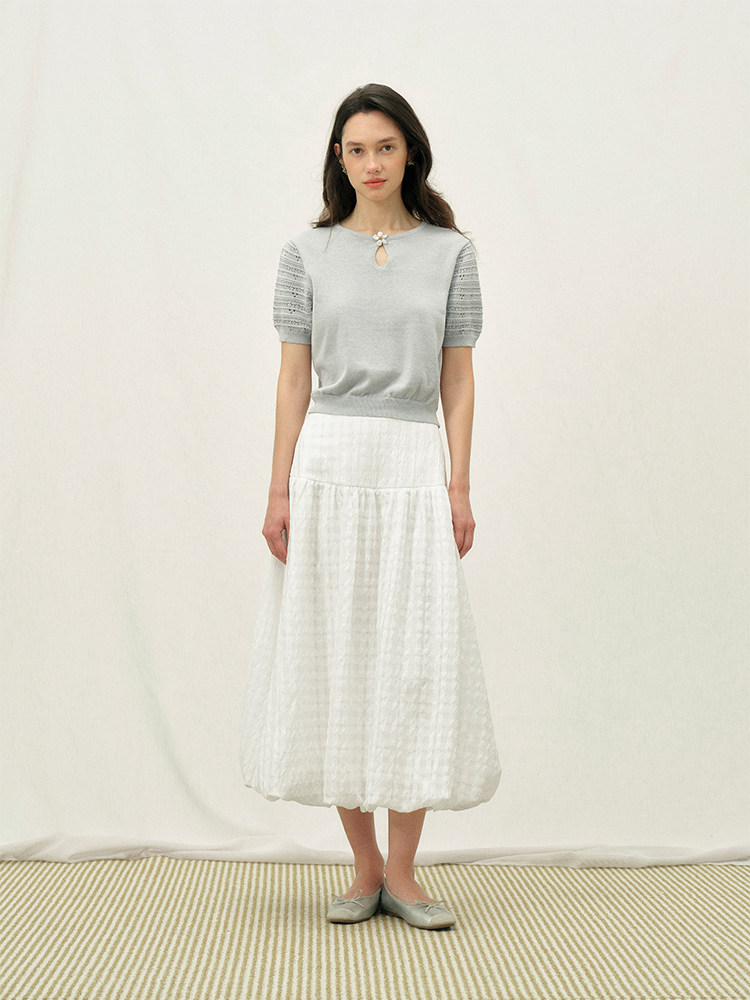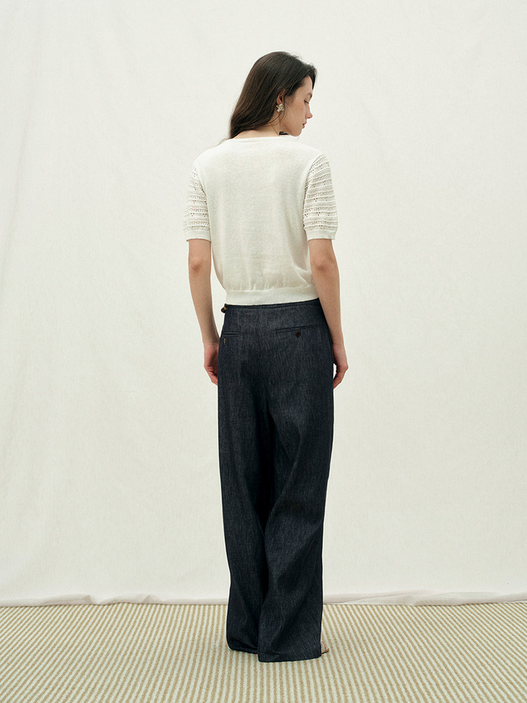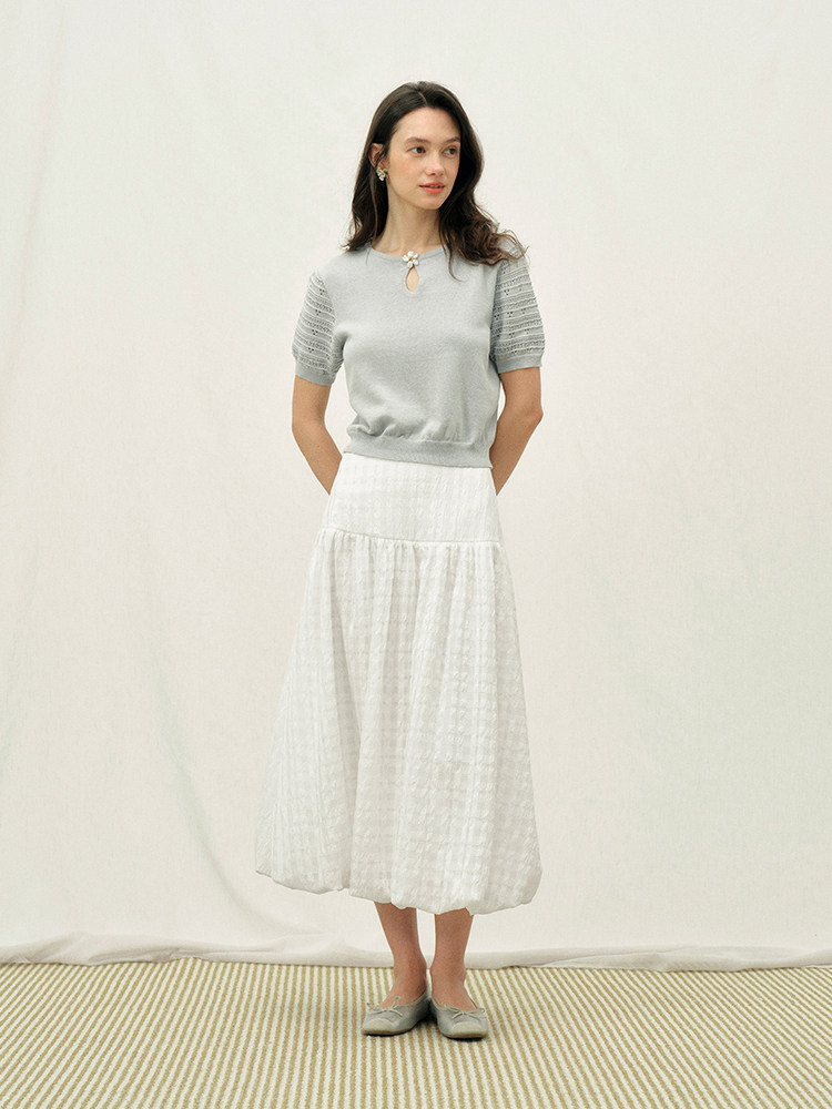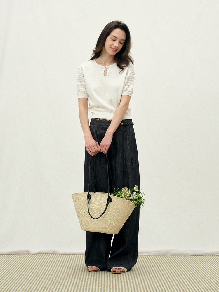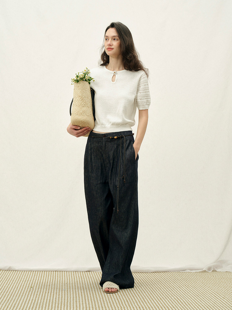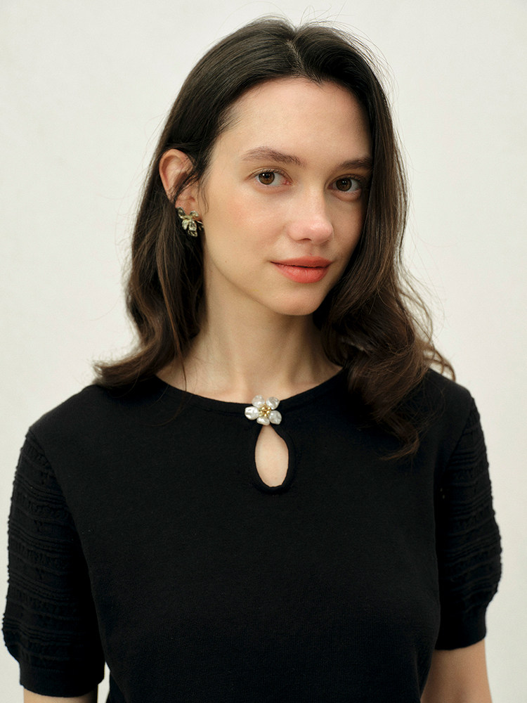 ForPoem 26/SS 原创设计棉麻混纺水滴领花朵针织上衣宽松H型短袖