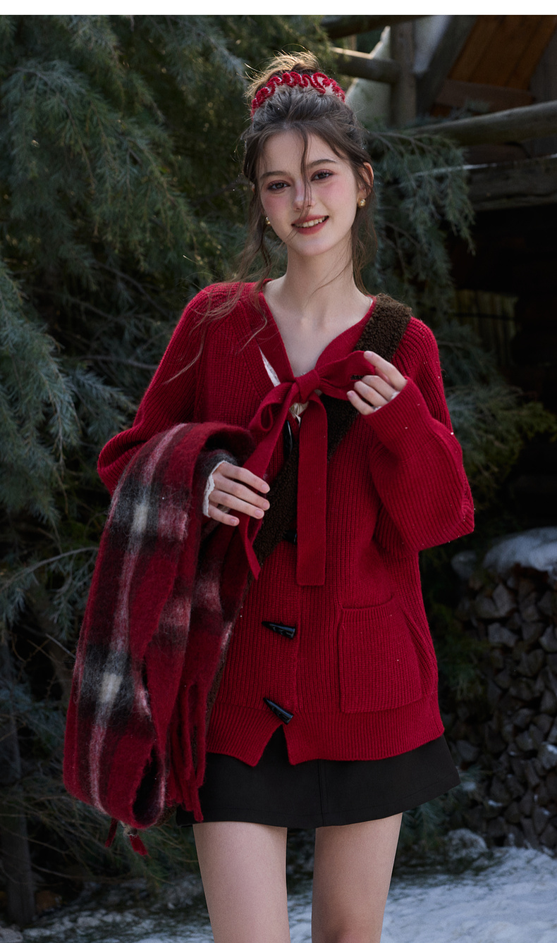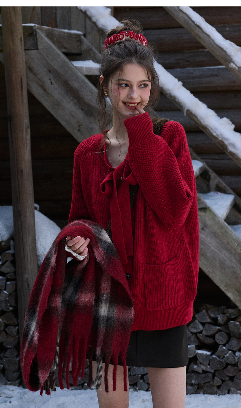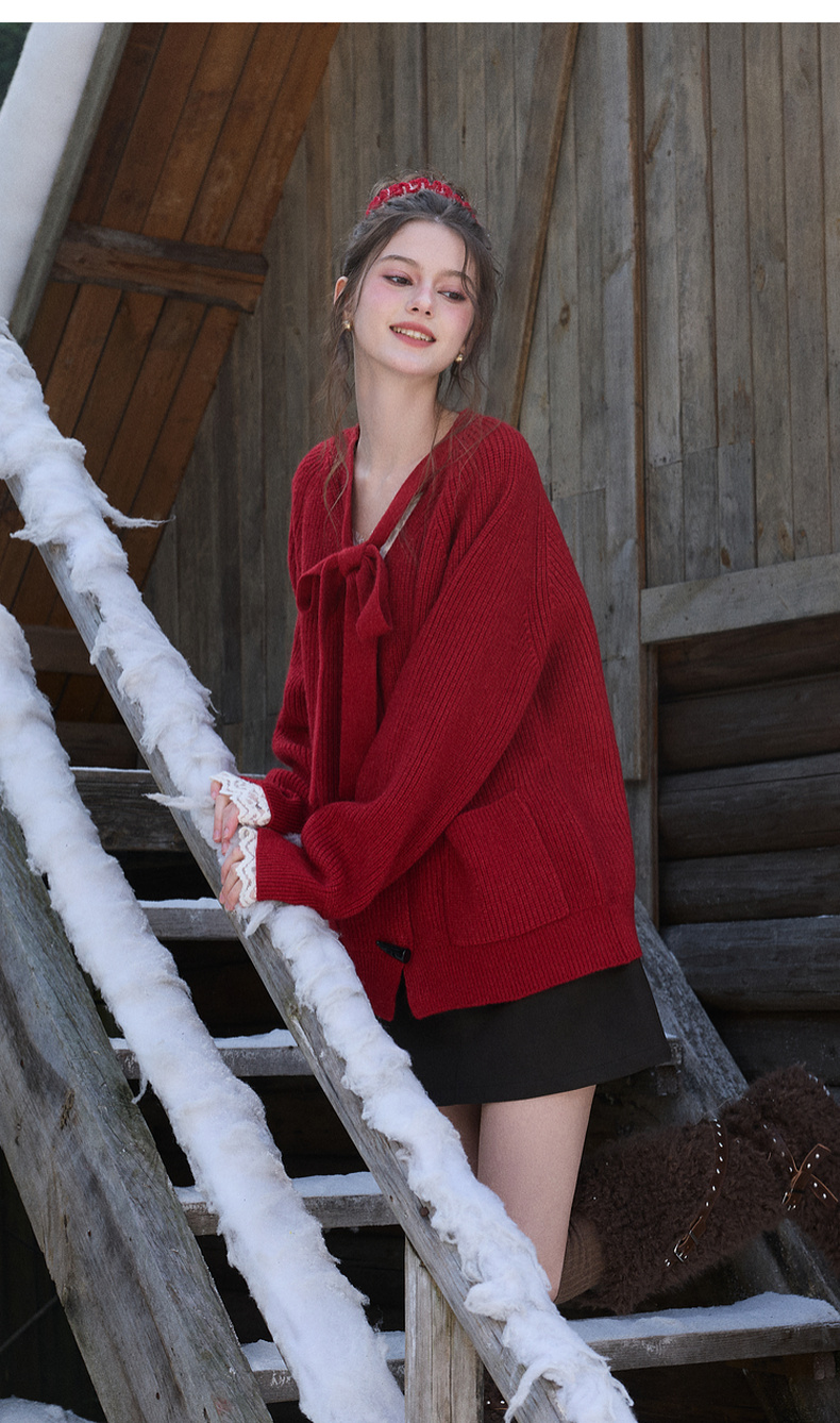 三彩独醒2026春季新款宽松毛衣新年毛衫V领系带长袖开衫F
