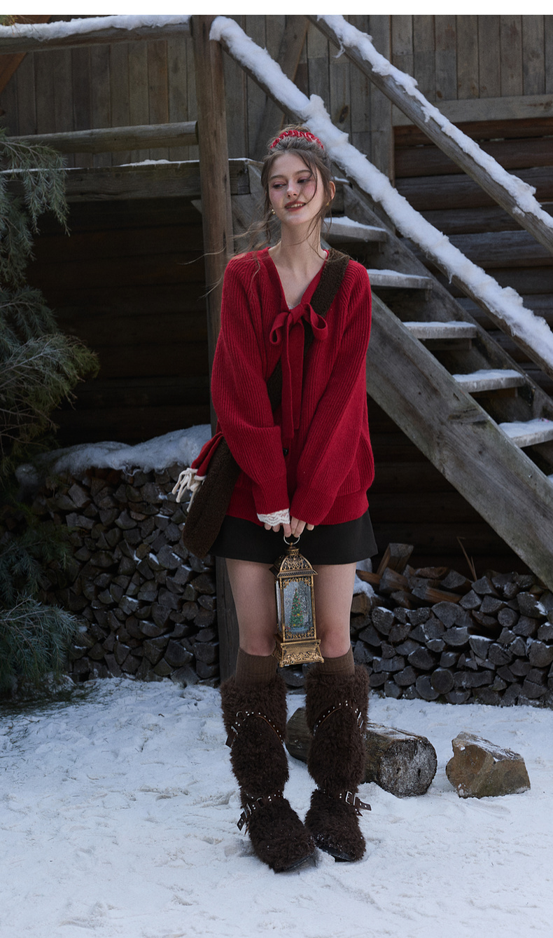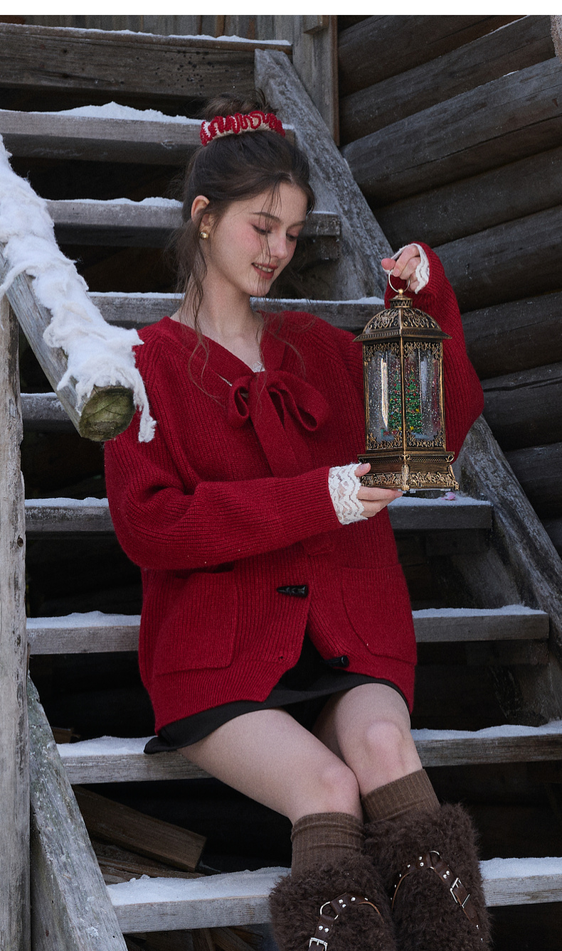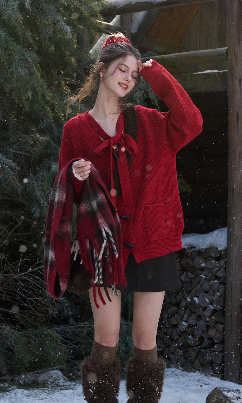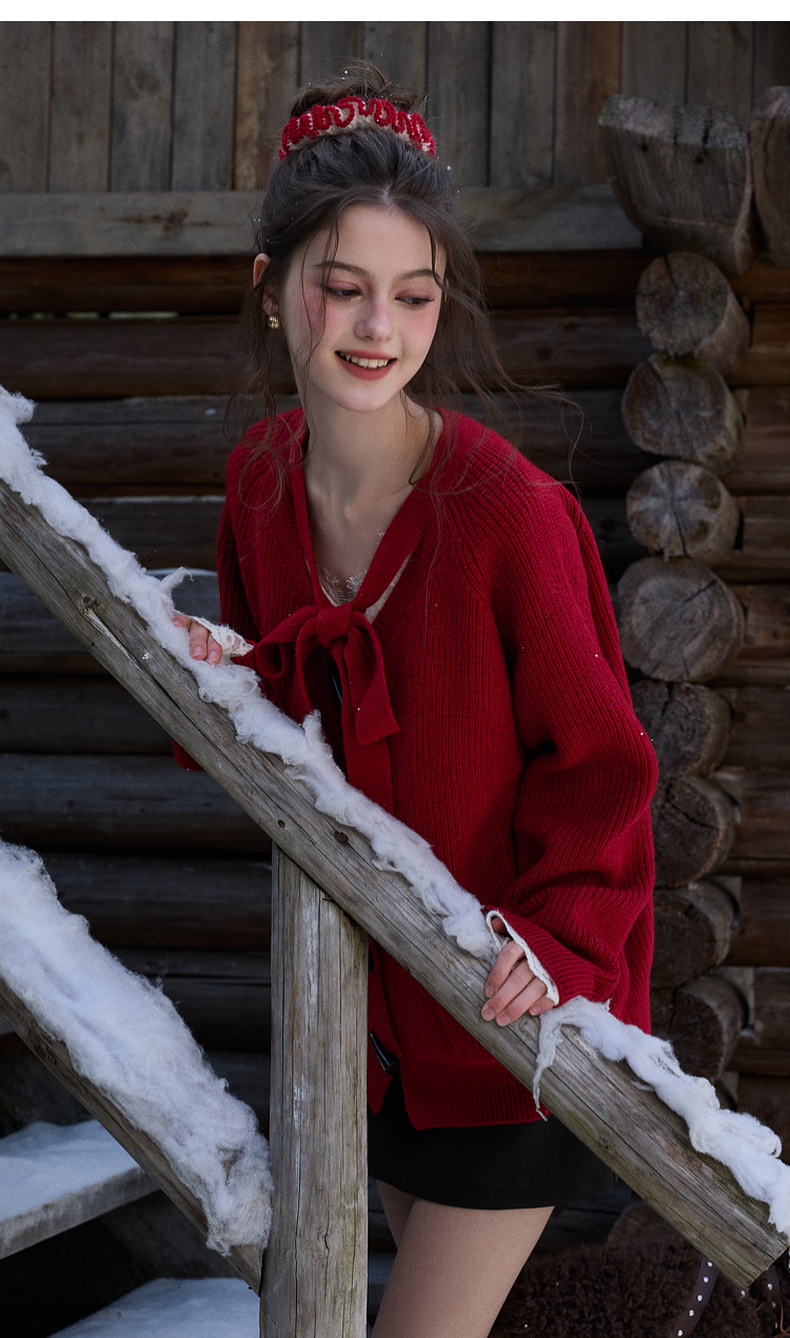 三彩独醒2026春季新款宽松毛衣新年毛衫V领系带长袖开衫F