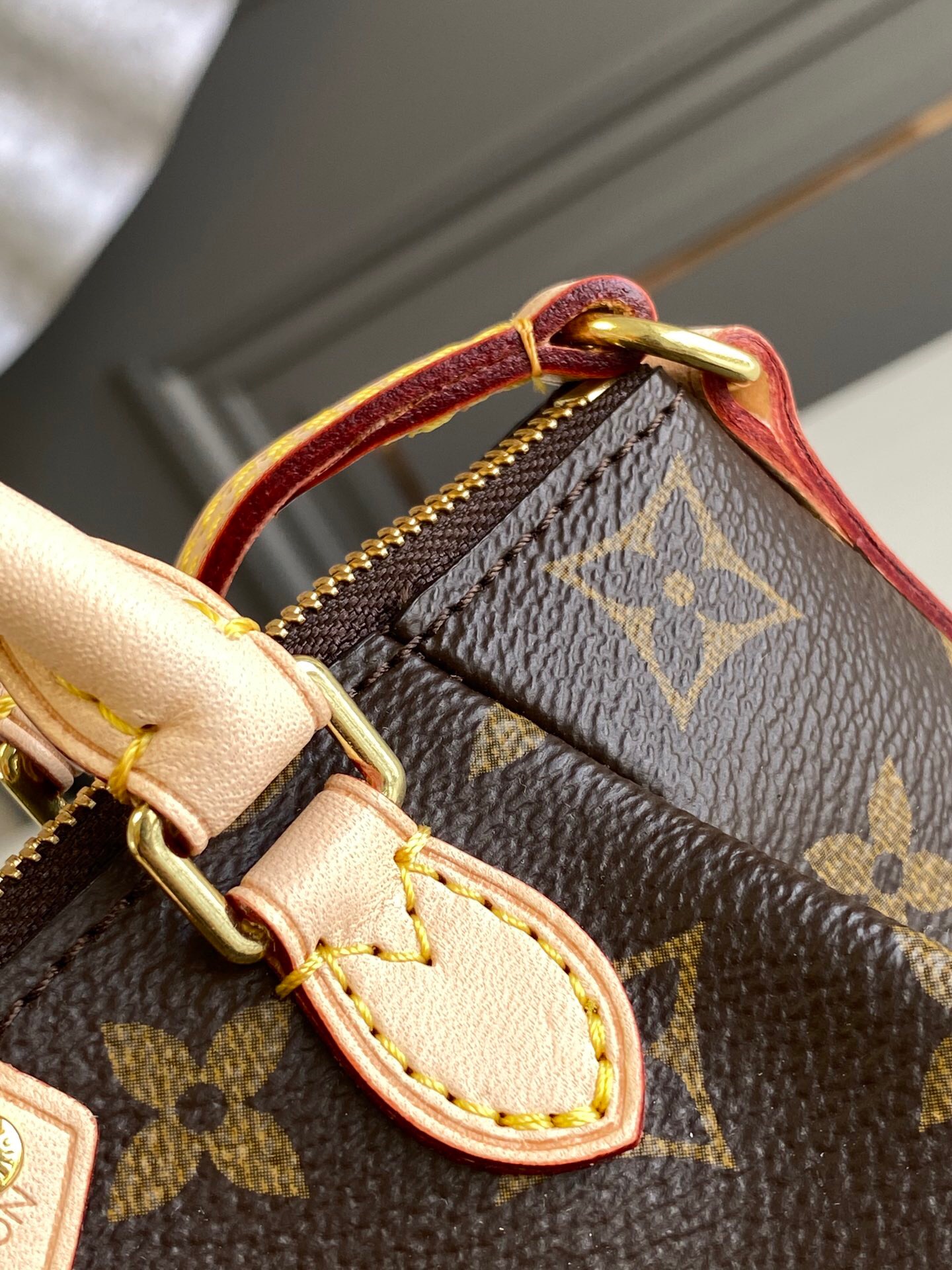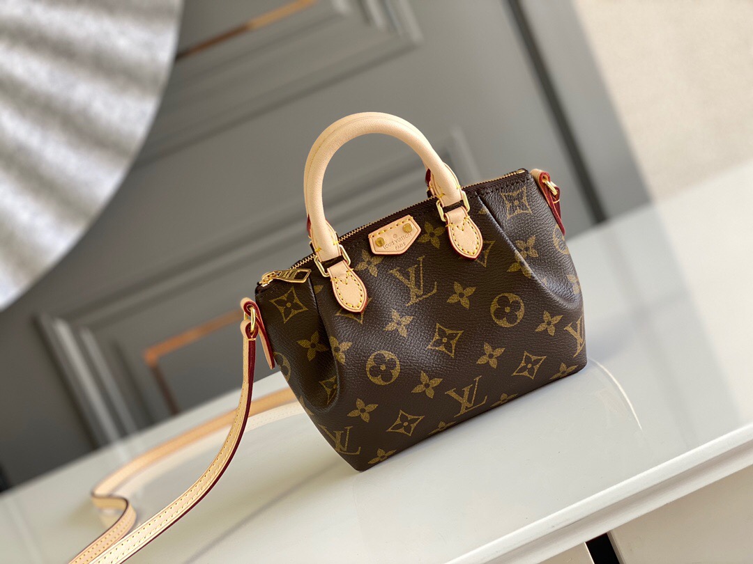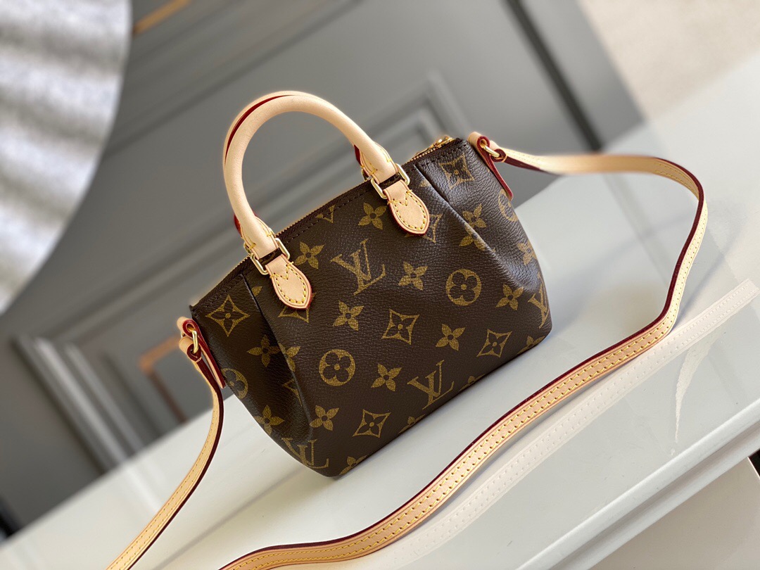 以经典的monogram帆布制成的nano turenne手袋 散发极致女人味 是您携带日常用品的理想之选 这款手袋是原型turenne手袋的完美迷你版 缝线精致 轻盈无比 可轻松容纳您的智能手机 信用卡和钥匙 size 17x 11x 6cm (长 x 高 x 宽) - 长肩带便于肩背或斜背- 2个手柄- 安全的拉链开合- 织物内衬- 天然牛皮饰边- 闪亮的金色金属配件