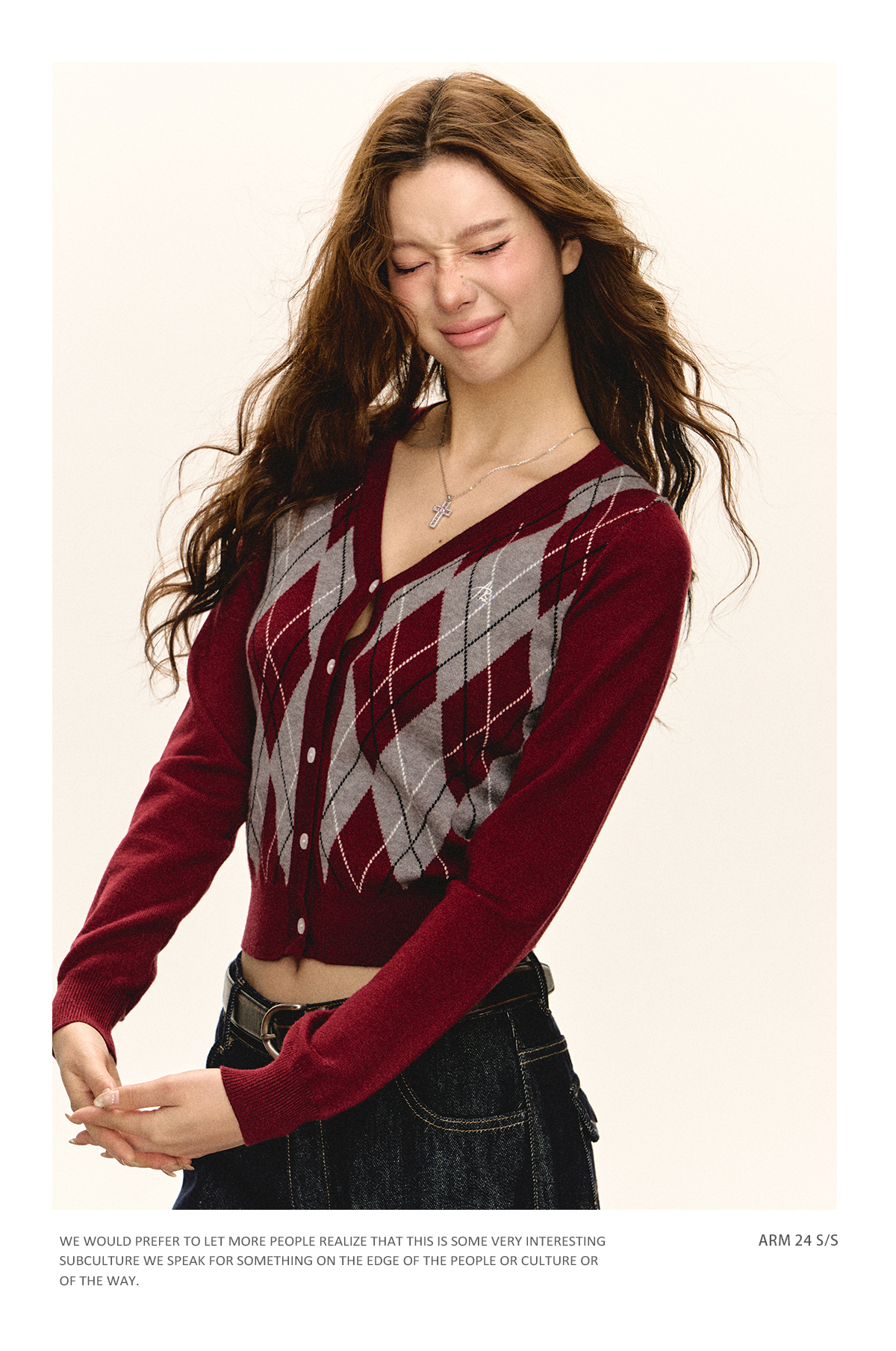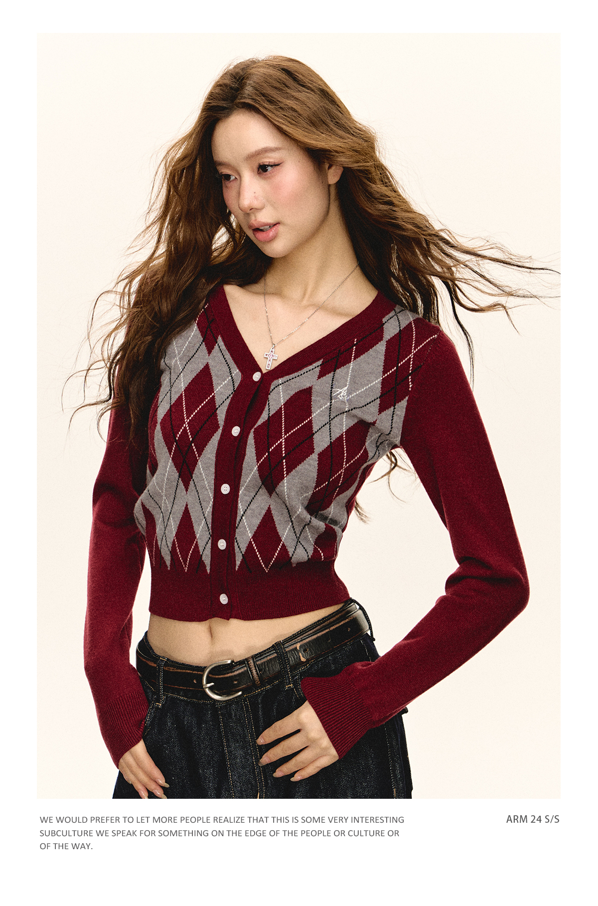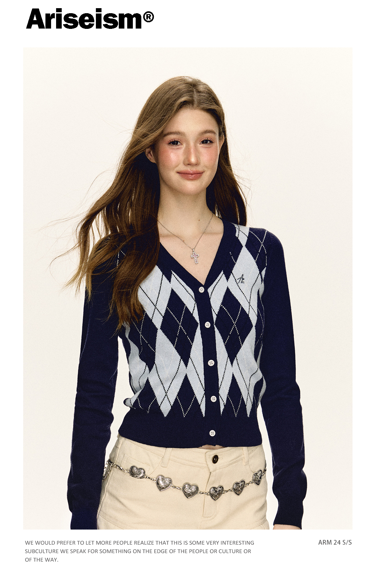 Ariseism 美式复古设计感格纹短款修身针织衫女春季新款修身上衣