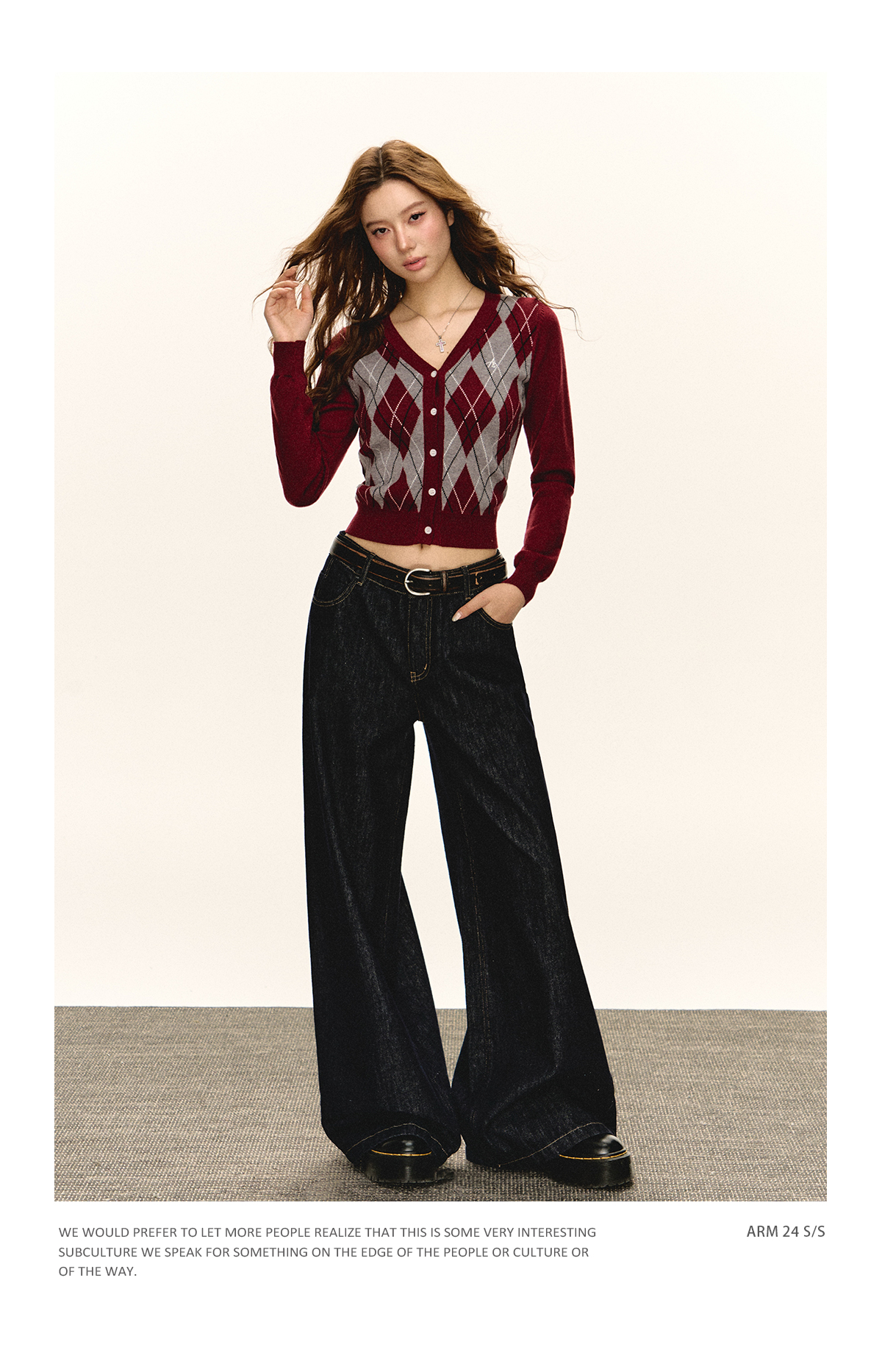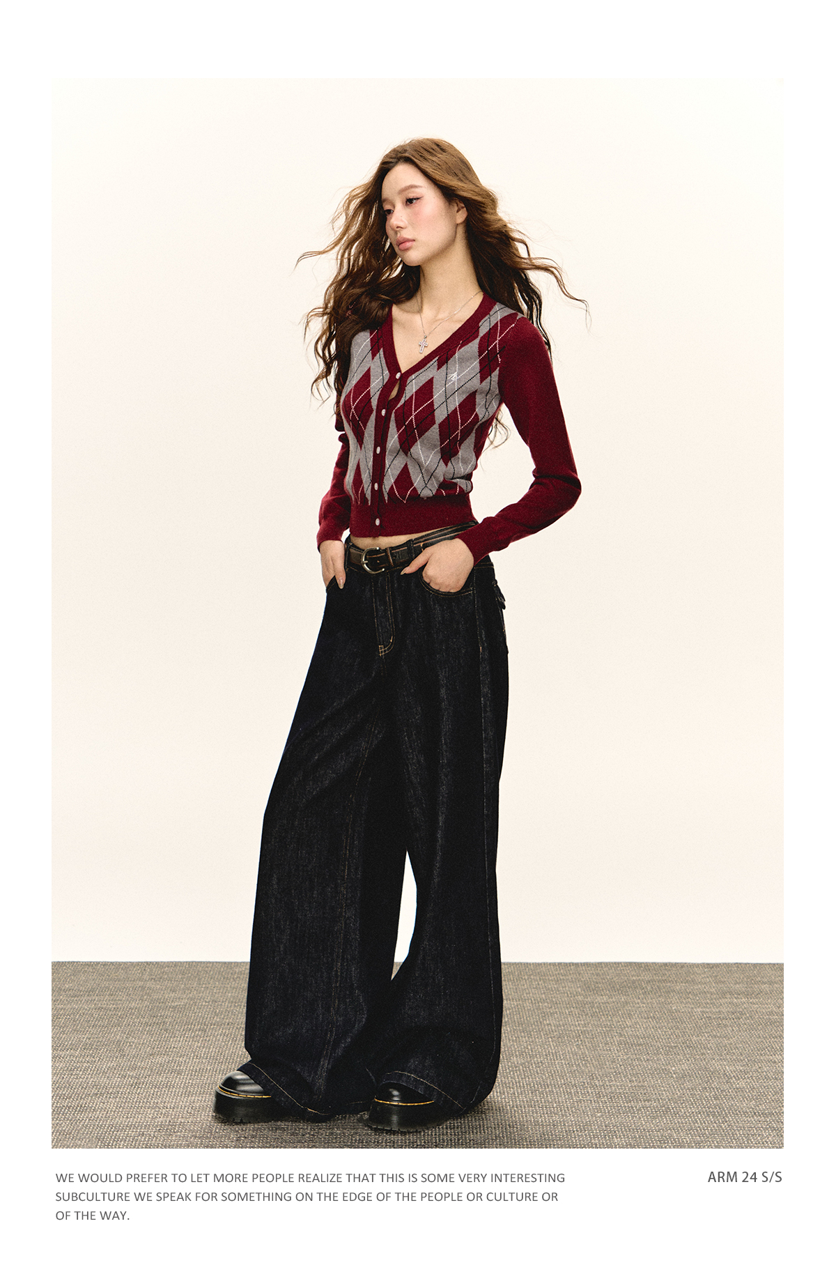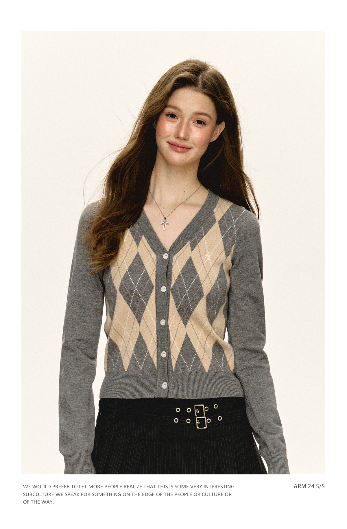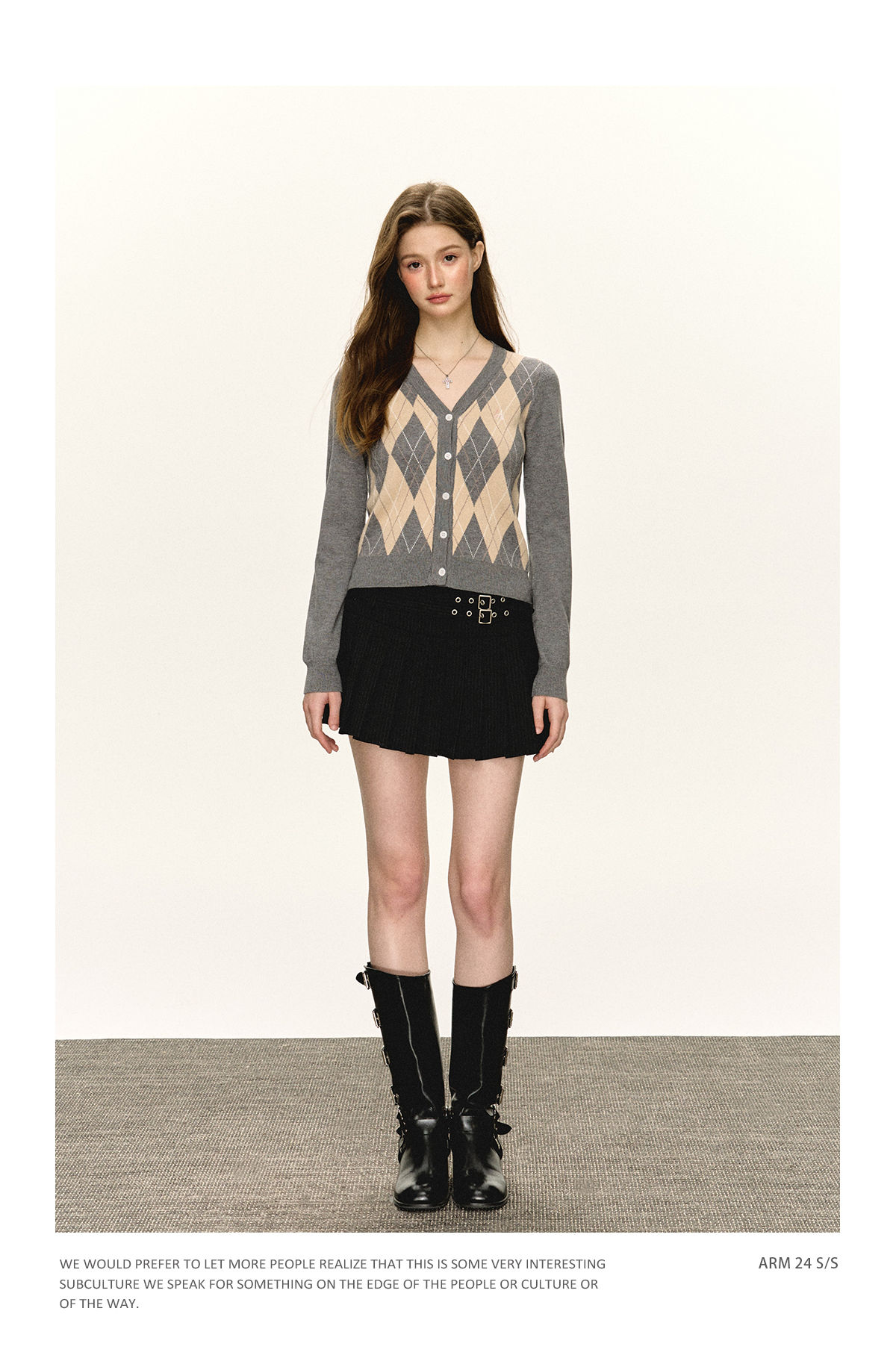 Ariseism 美式复古设计感格纹短款修身针织衫女春季新款修身上衣