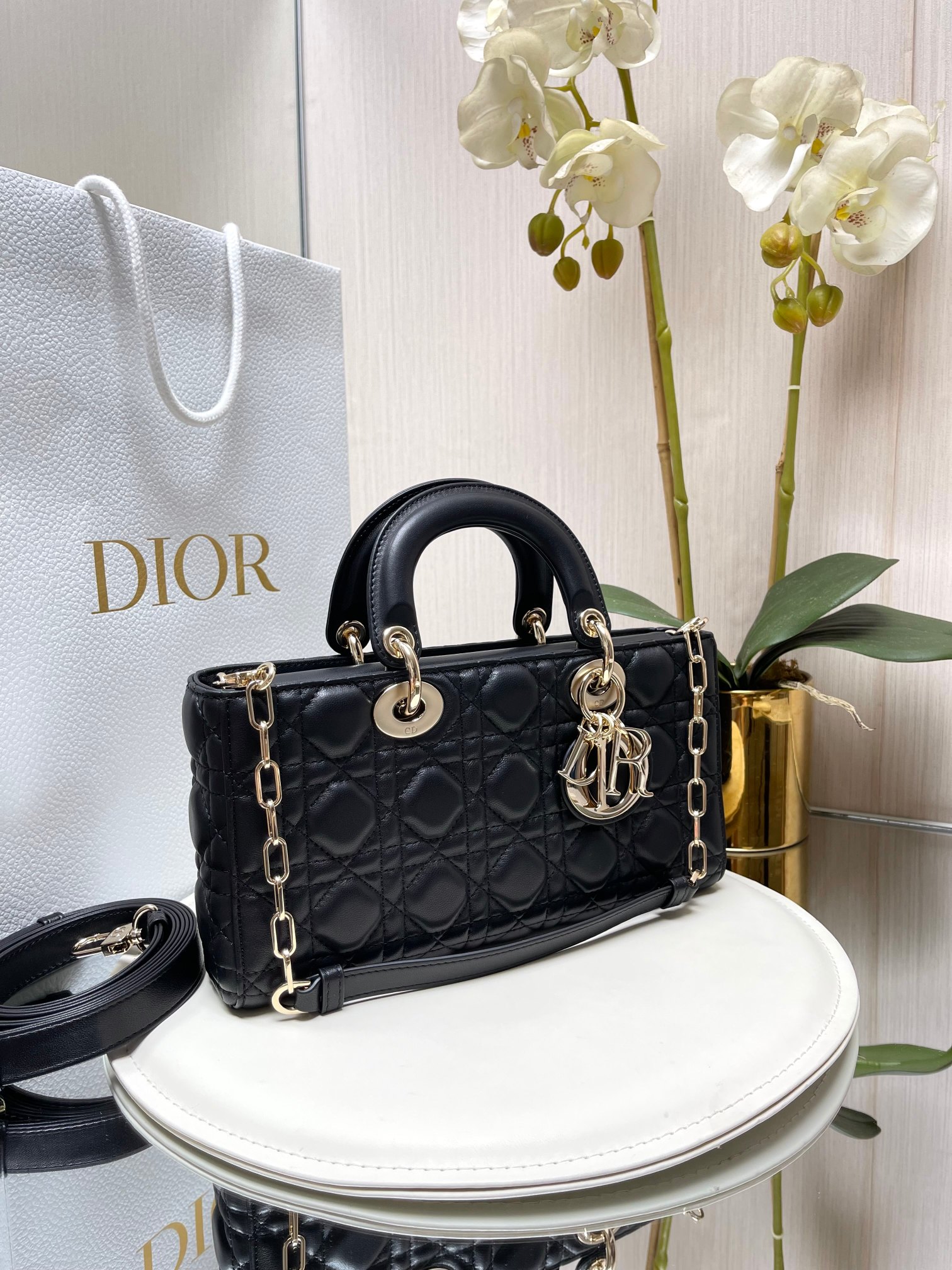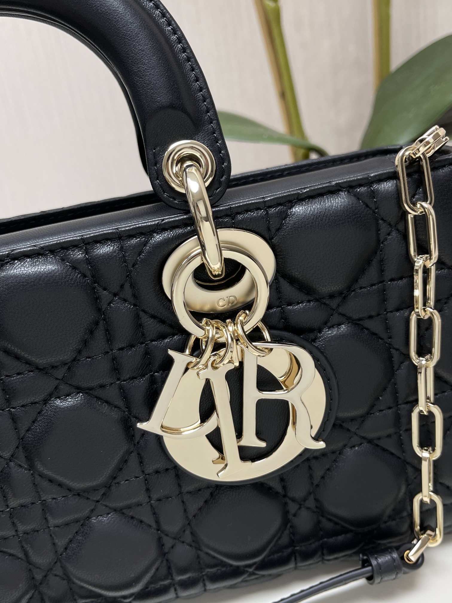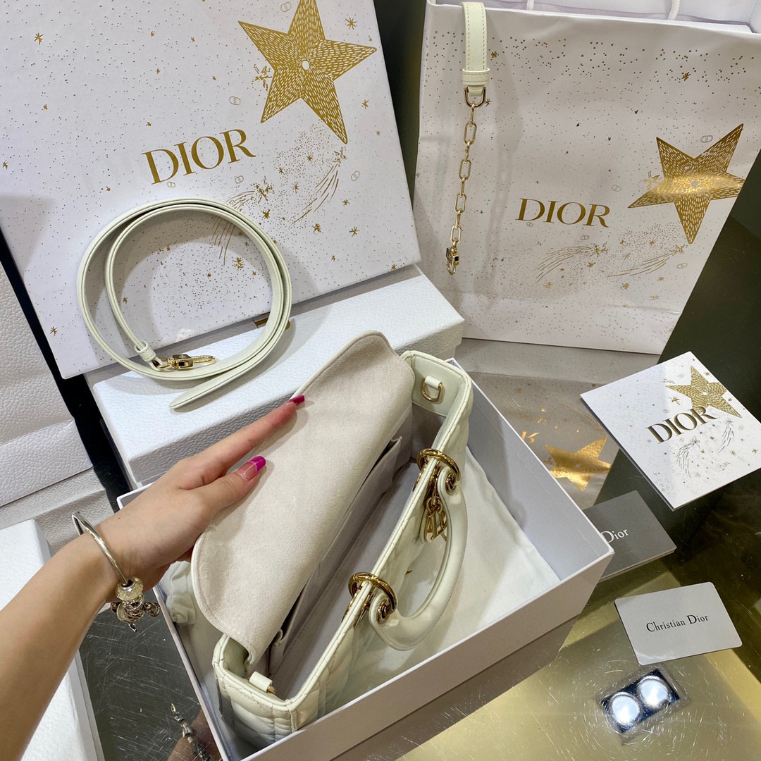 ?LADY D-JOY 手袋? 【羊皮藤格纹】 这款 Lady D-Joy 手袋集中体现了 Dior 对优雅和美丽的深刻洞见。时髦典雅的设计经久不衰,彰显 Lady Dior 系列的简约美学。采用进口胎羊皮精心制作,饰以藤格纹缉面线,搭配浅金色饰面金属D.I.O.R.吊饰提升格调,为精美的轮廓增添一分灵动。搭配一条可拆卸的链条肩带和一条可调节、可拆卸的皮革肩带,可手提或斜挎,是日常造型的理想之选。