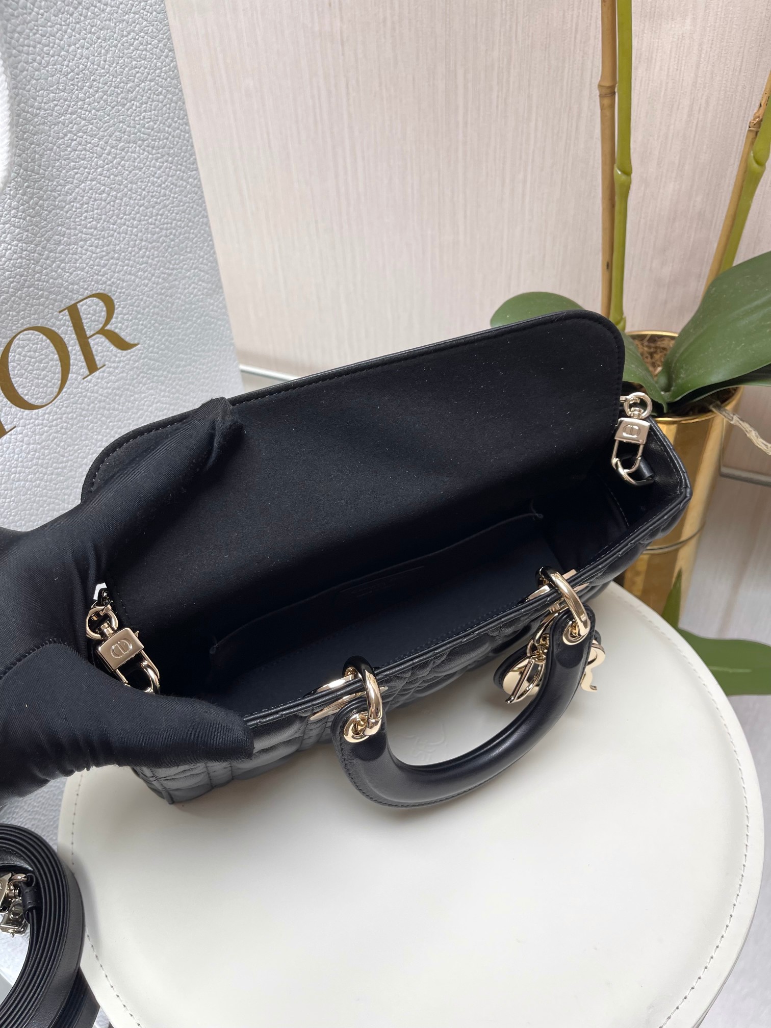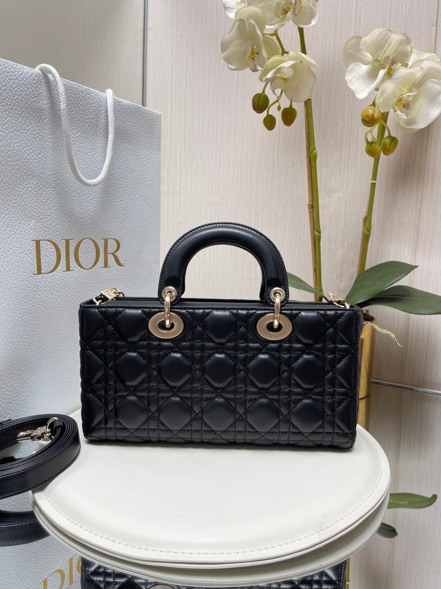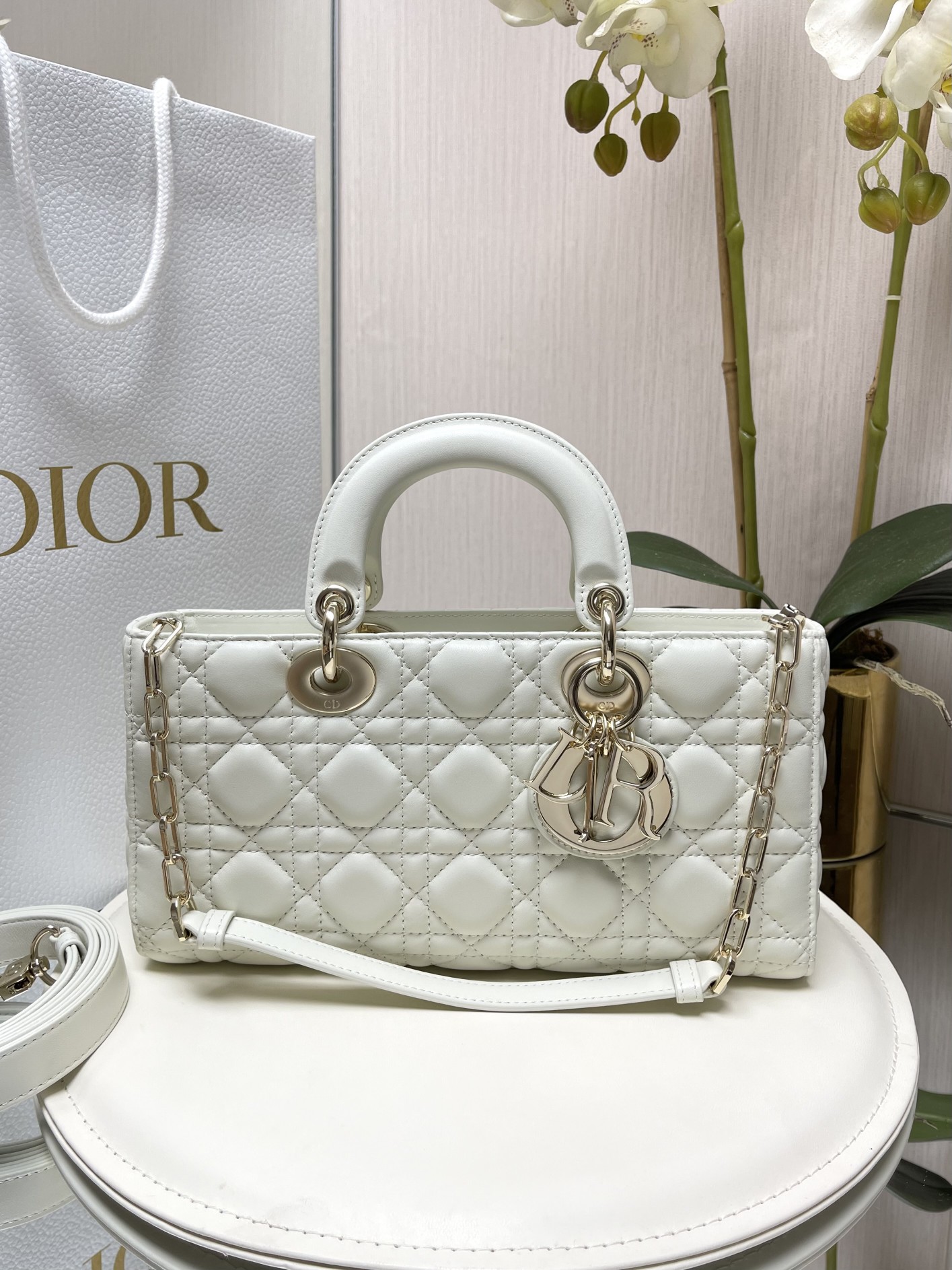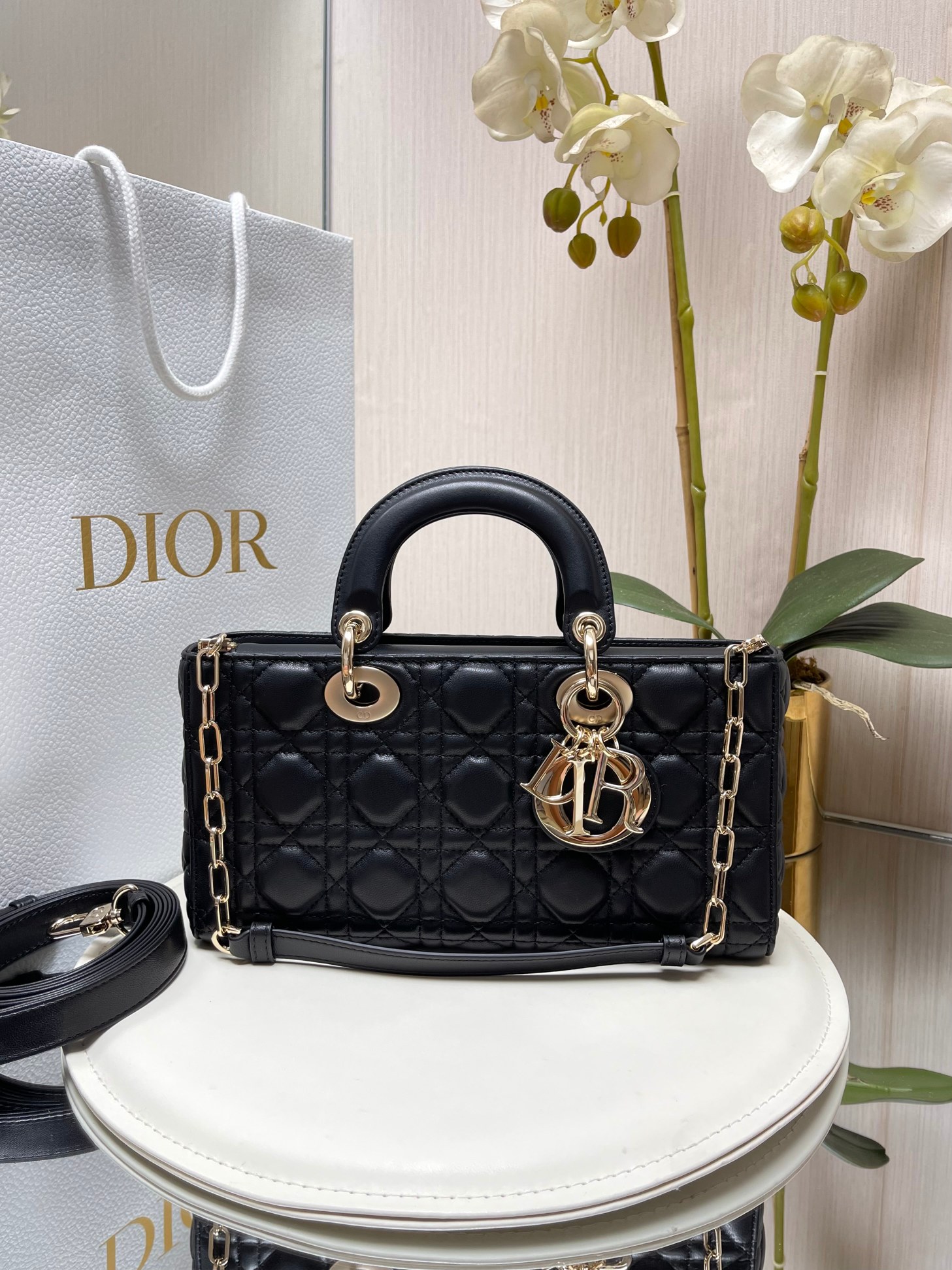?LADY D-JOY 手袋? 【羊皮藤格纹】 这款 Lady D-Joy 手袋集中体现了 Dior 对优雅和美丽的深刻洞见。时髦典雅的设计经久不衰,彰显 Lady Dior 系列的简约美学。采用进口胎羊皮精心制作,饰以藤格纹缉面线,搭配浅金色饰面金属D.I.O.R.吊饰提升格调,为精美的轮廓增添一分灵动。搭配一条可拆卸的链条肩带和一条可调节、可拆卸的皮革肩带,可手提或斜挎,是日常造型的理想之选。