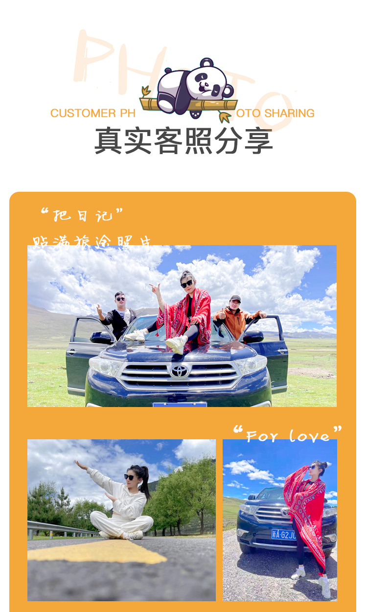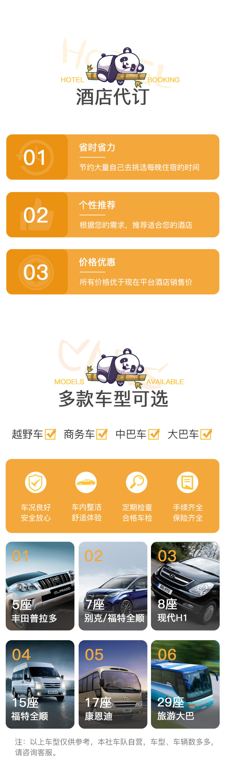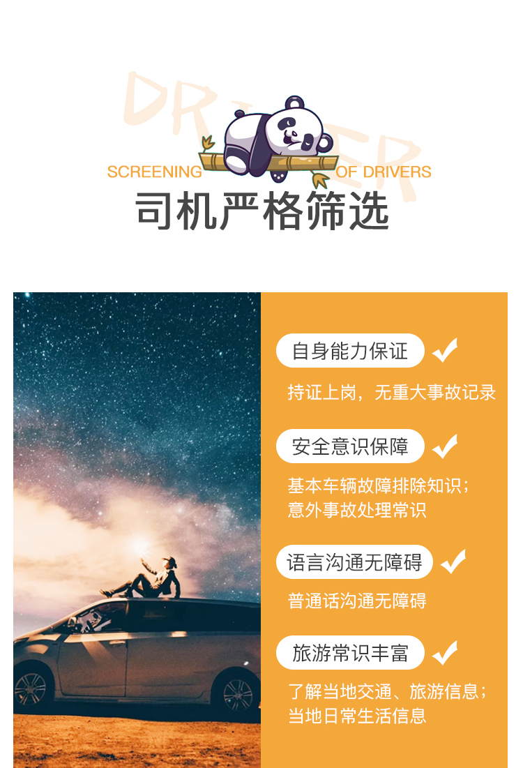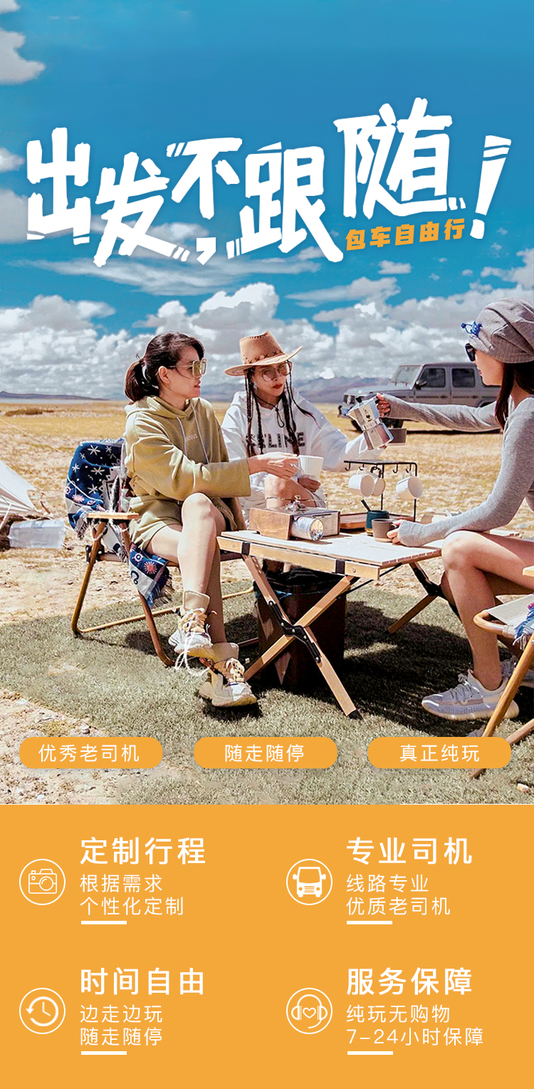 5. 所走行程同预定时沟通的行程一致,不收取任何超时超公里费(如不想要固定行程,可按公里数计费,客人行程第1天上车后开始计算公里数至最后1天行程下车为结束)。