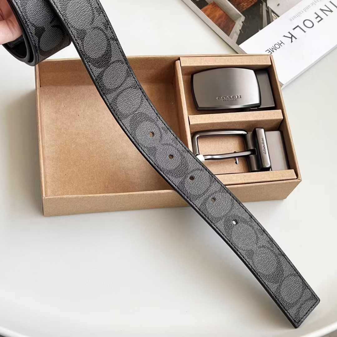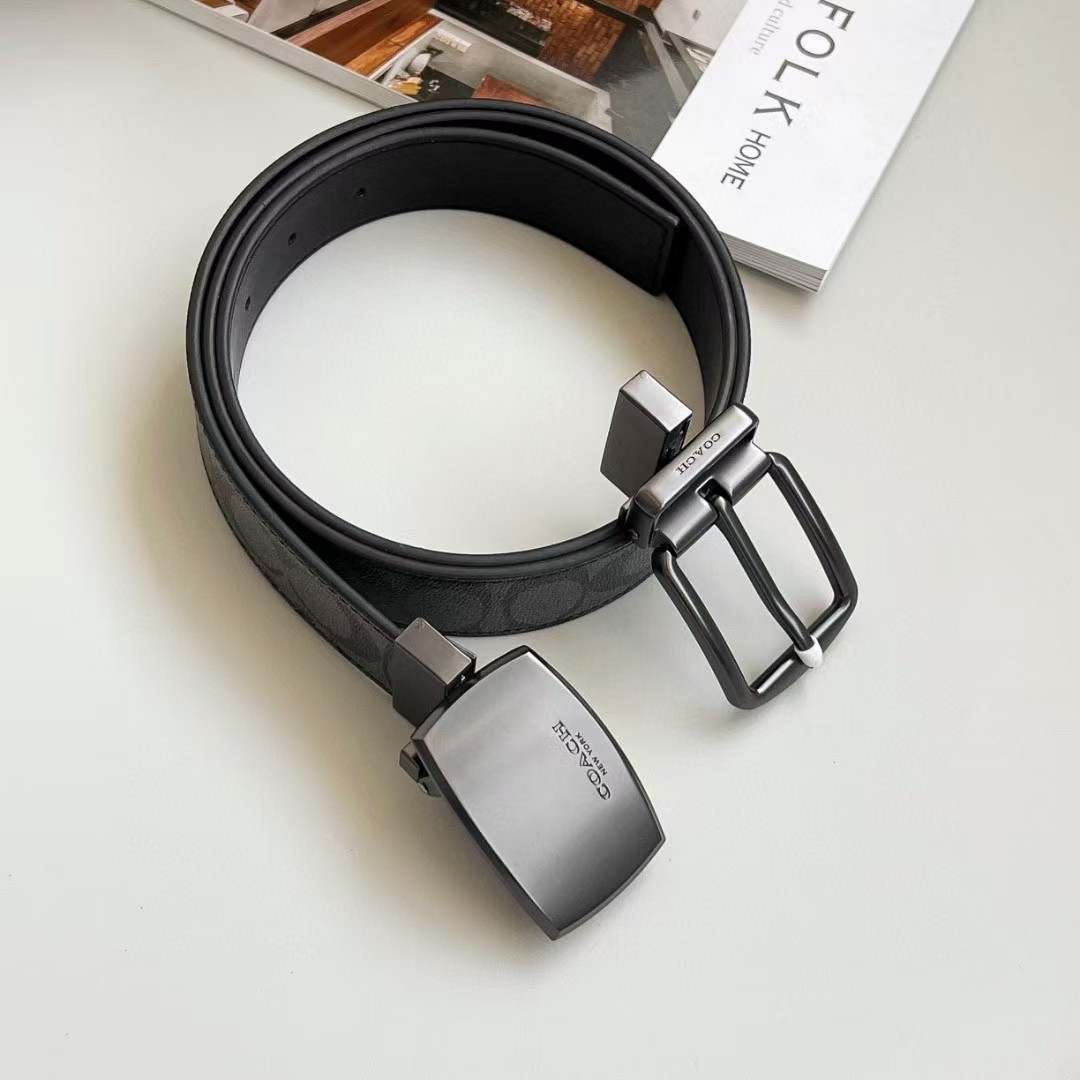 coach 黑拼亮枪色扣头经典老花元素(底面-黑色-荔枝纹)皮质柔软,自由裁剪,设计两面用,可旋转现货供应,男士精品皮带送礼自用绝对高大上