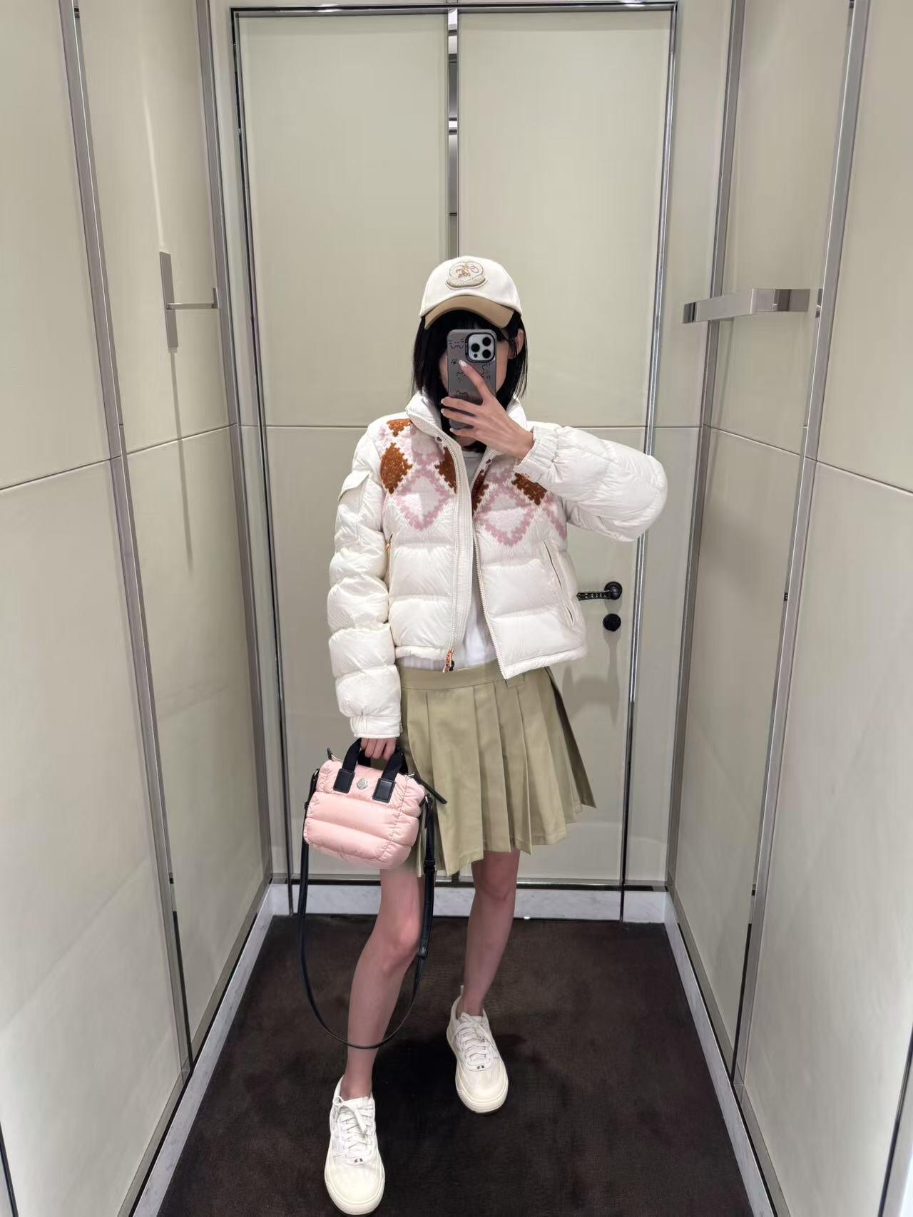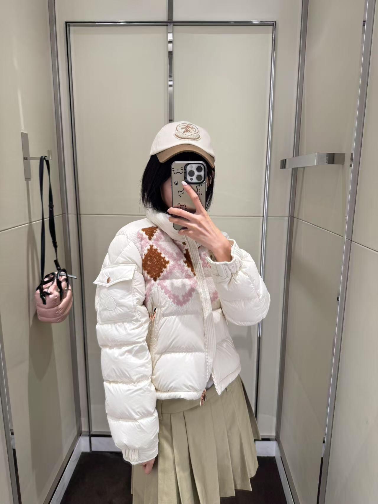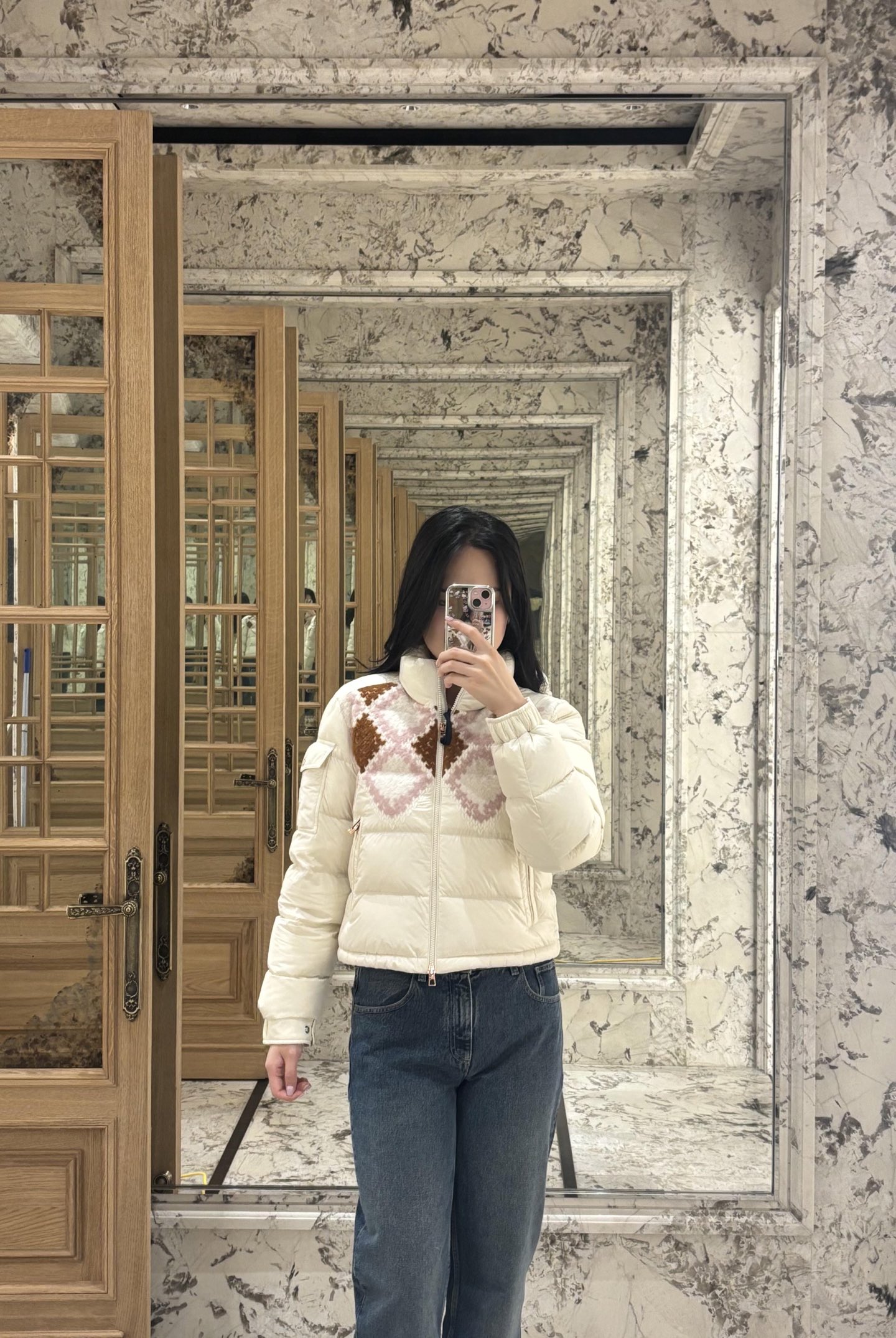 Moncl*r 25Fw秋冬新款 Megara毛线刺绣面包服短羽绒服丨⚠独家yb开发!高版出品!奶油白哑光羽绒面料塑造饱满面包服廓形,蓬松却不臃肿,短款剪裁轻松优化身材比例;胸前粉棕菱格毛线刺绣是点睛之笔,将复古学院风与法式浪漫感糅合,金属拉链与功能性口袋延续品牌实用美学,标志性徽标低调彰显身份。无论是搭配百褶裙打造甜酷学院风!