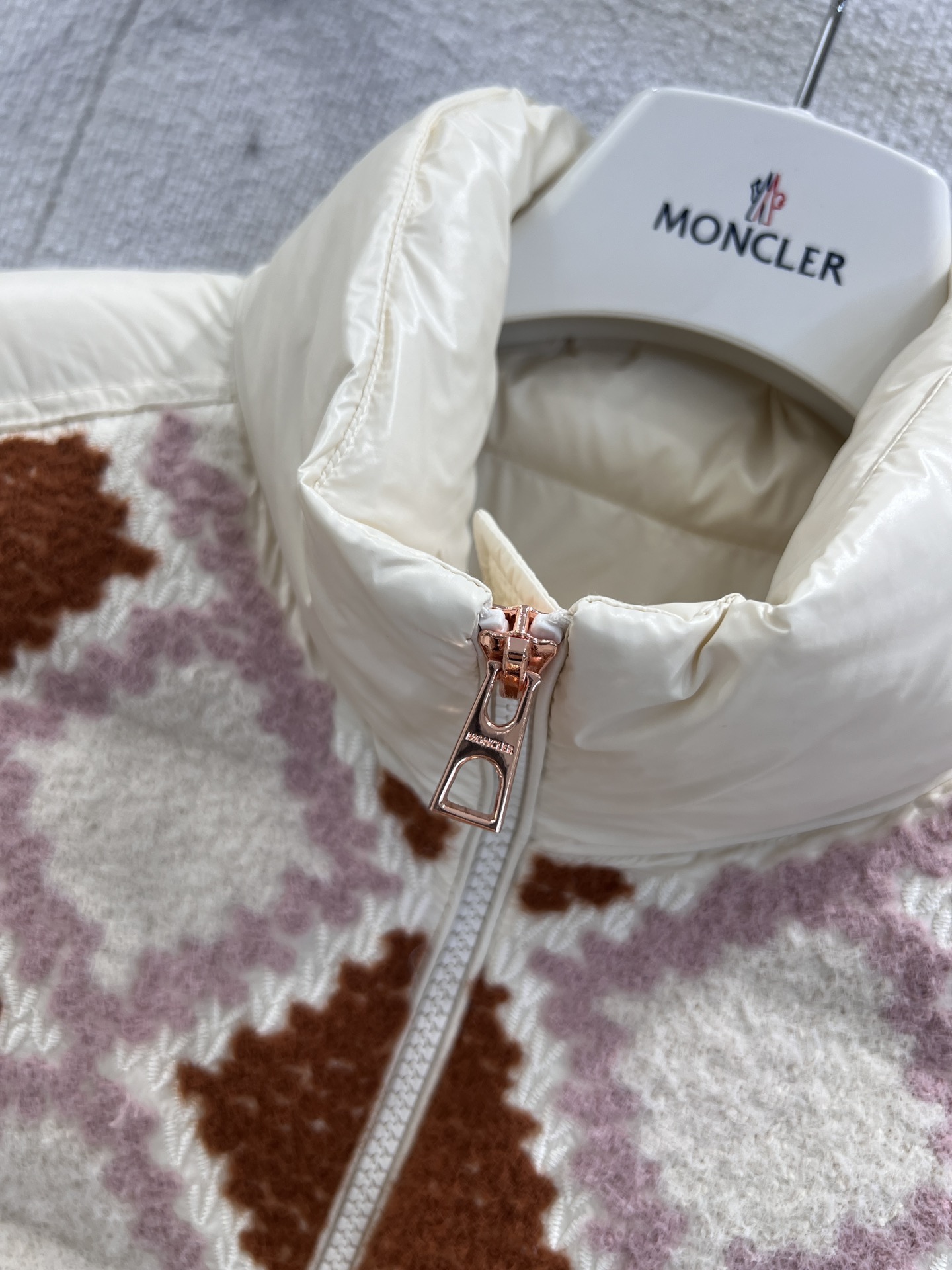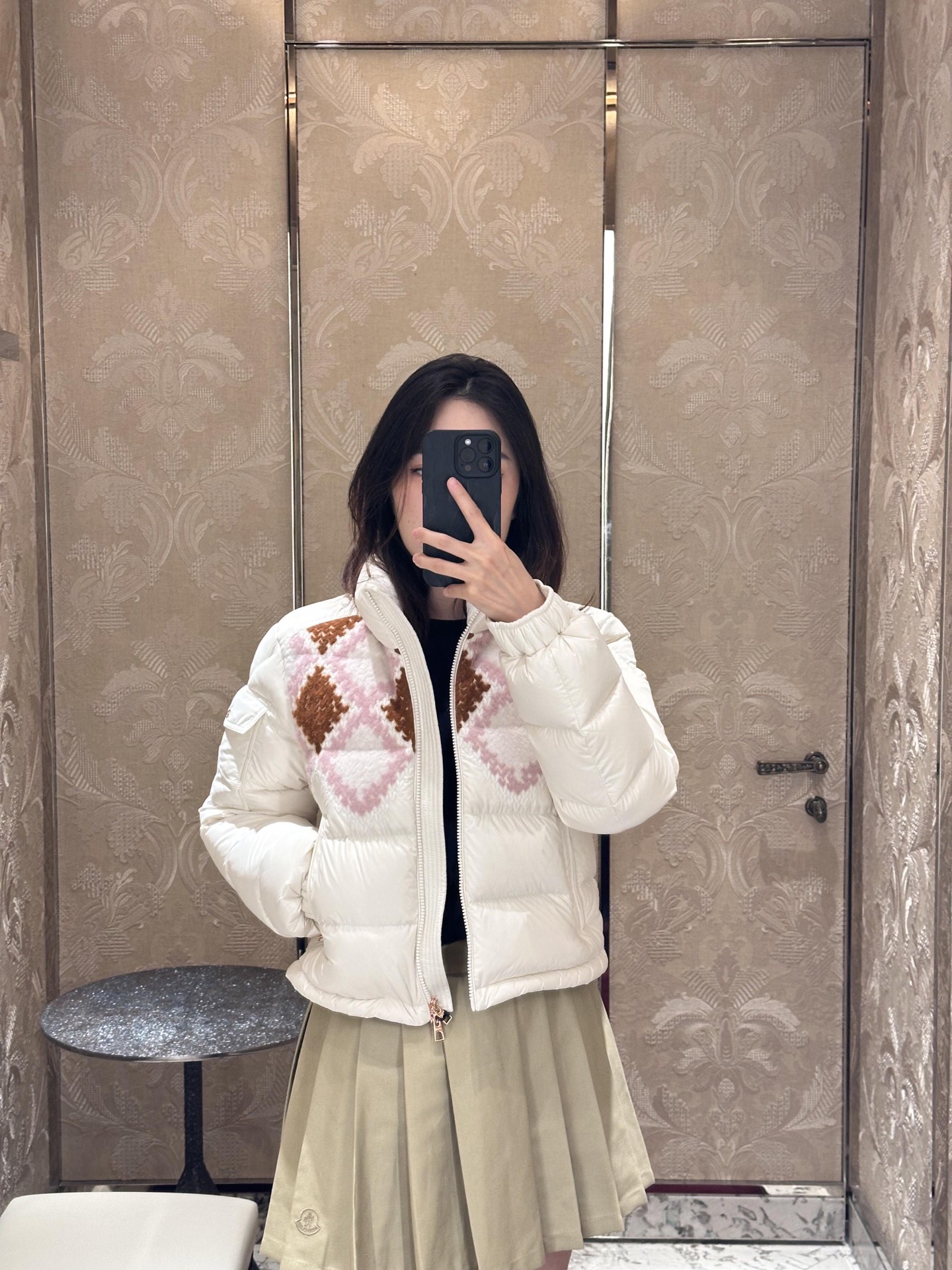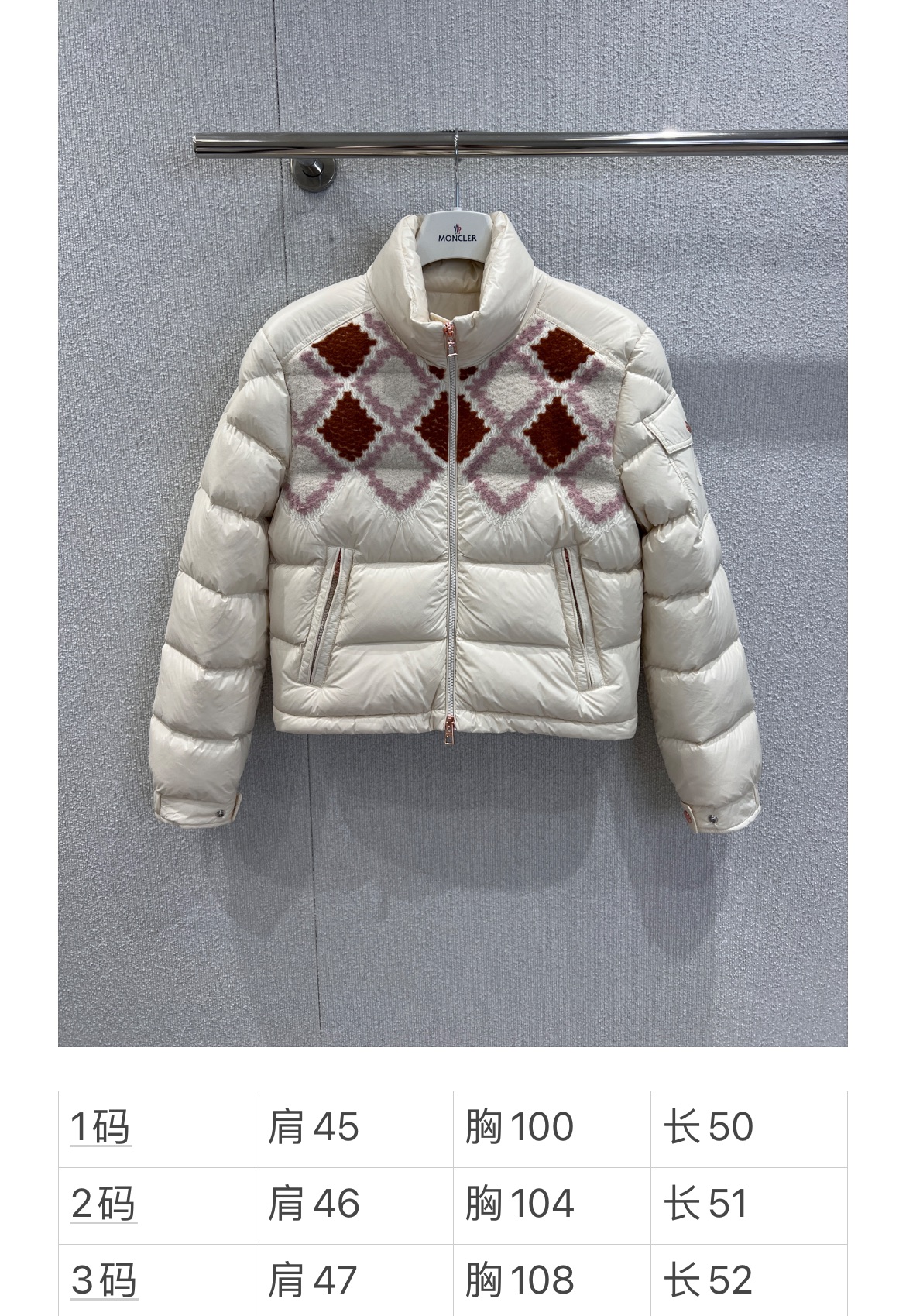 Moncl*r 25Fw秋冬新款 Megara毛线刺绣面包服短羽绒服丨⚠独家yb开发!高版出品!奶油白哑光羽绒面料塑造饱满面包服廓形,蓬松却不臃肿,短款剪裁轻松优化身材比例;胸前粉棕菱格毛线刺绣是点睛之笔,将复古学院风与法式浪漫感糅合,金属拉链与功能性口袋延续品牌实用美学,标志性徽标低调彰显身份。无论是搭配百褶裙打造甜酷学院风!