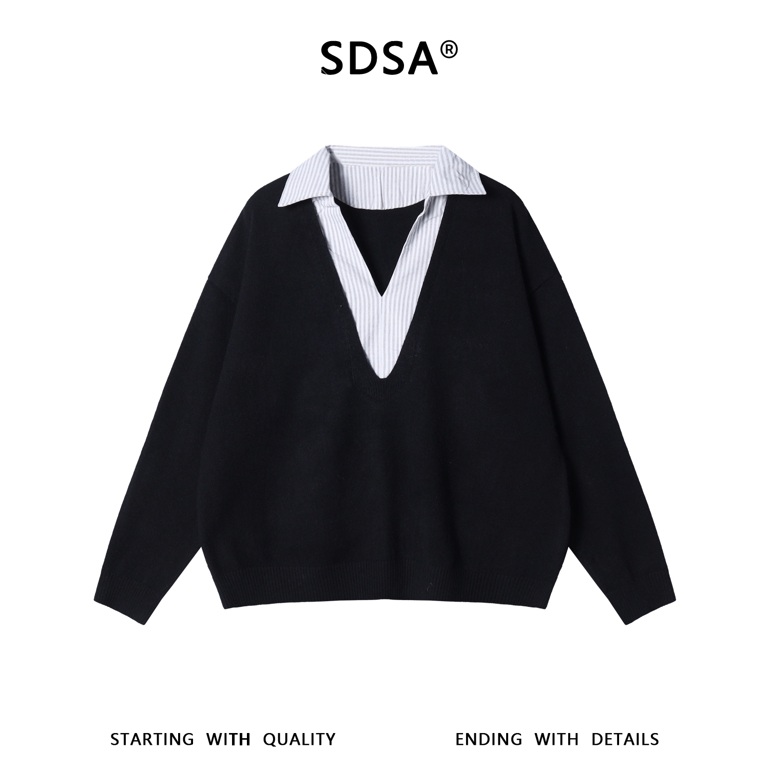 46763SDSA男士秋冬新款痞帅男装韩版拼接小V翻领毛衣百搭慵懒风上衣潮
