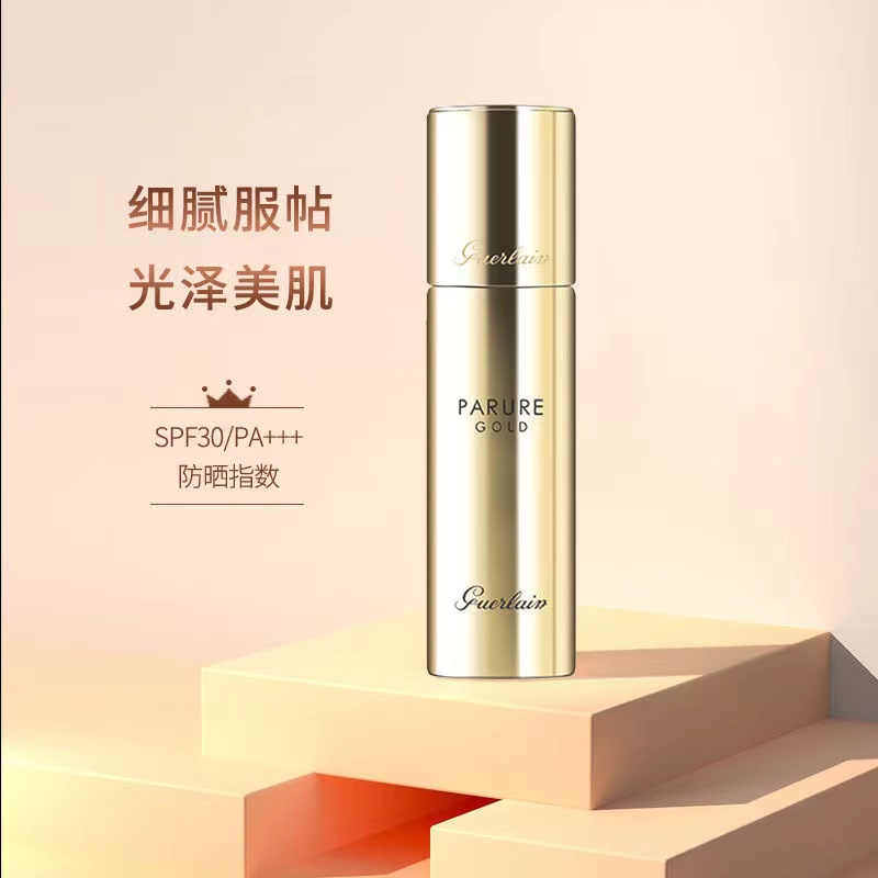 象征着永恒美的黄金, 启发Guerlain研发全新PARURE GOLD金钻修颜粉底液,致力提升金光亮采,缔造完美肤色,不受年龄限制,人皆艳羡。具备高度遮瑕新配方*,赋活肤色妆效24小时长效持妆及保湿功效**,隐没面容瑕疵,实属不可或缺的魔法妆品。粉底配方专为促进肌肤天然亮采而研创,蕴含多面金色色素、珍珠粒子,并渗入24K金,善于捕捉光线,照亮面容,焕发明媚辉采,突出肌肤天然美色的同时,淡化岁月痕迹。配方加上胶原蛋白促生***成分,为脸庞添注一重青春光芒。 PARURE GOLD金钻修颜粉底系列具防汗耐热配方,令您何时何地妆容依然散发活力好气色,显得精神奕奕,魅惑每一季。