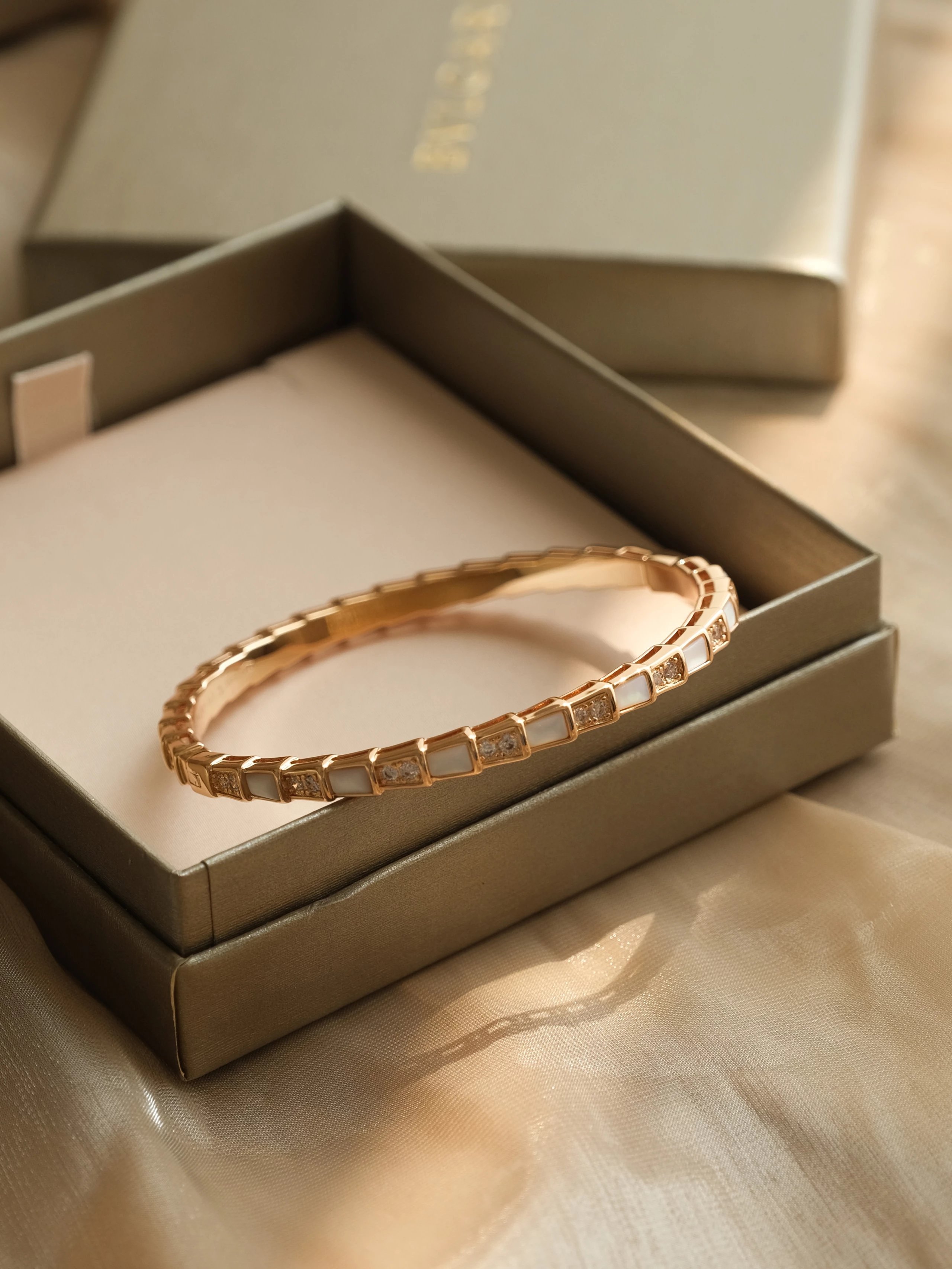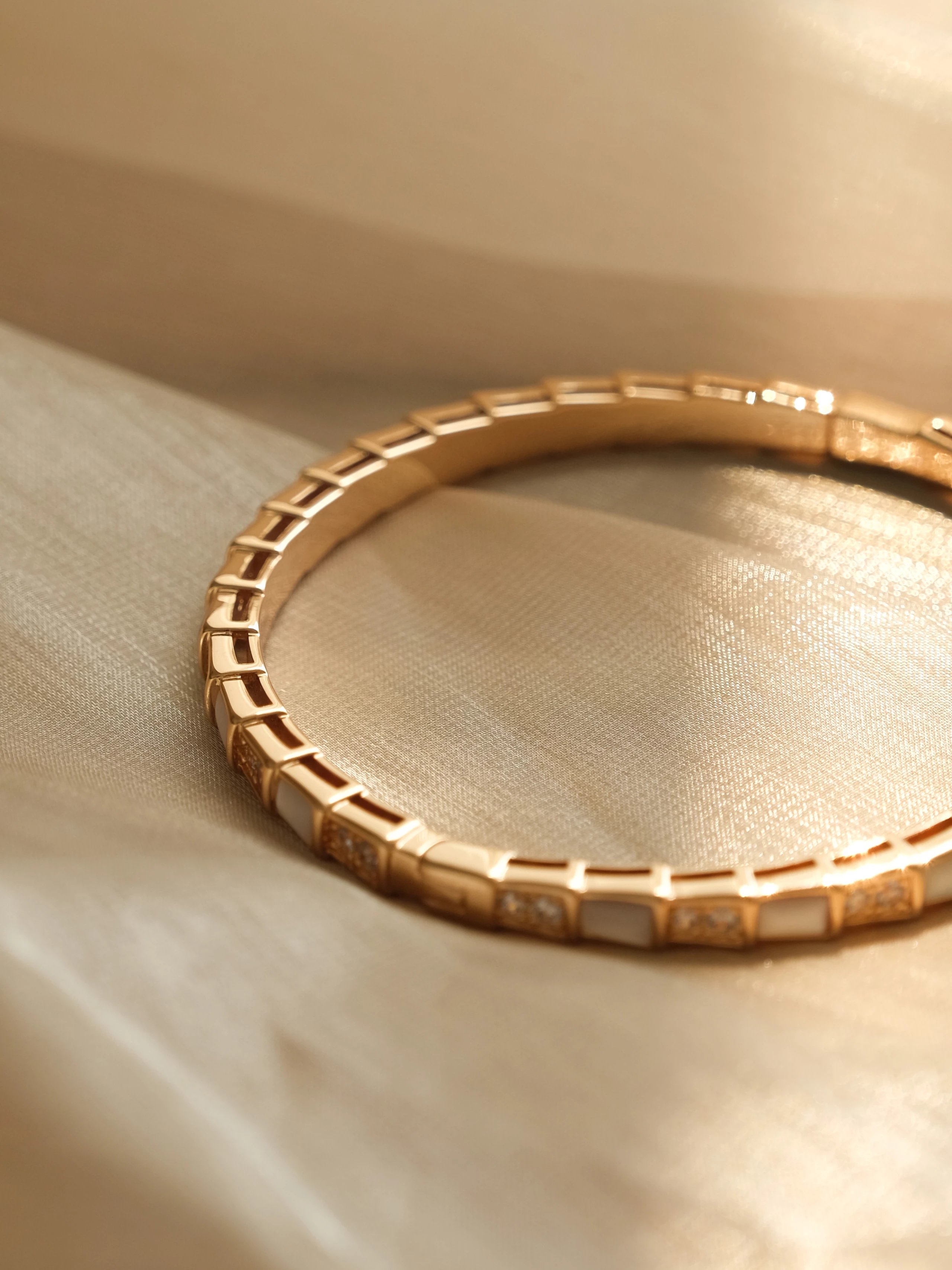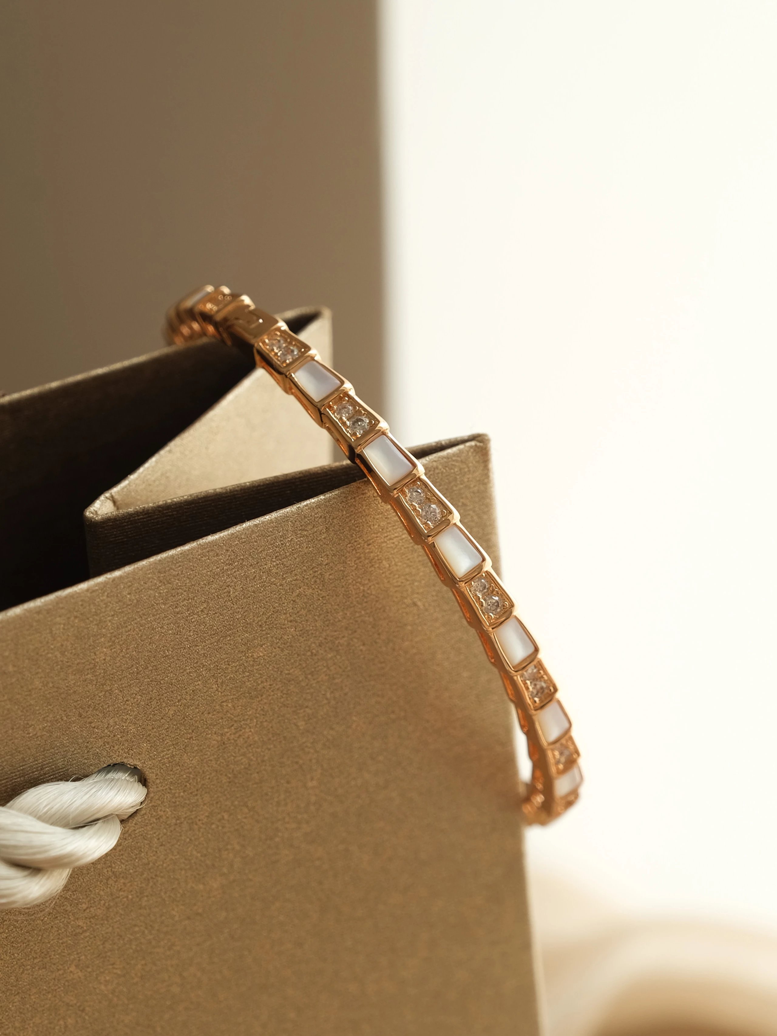 V金镀咪金 高级精工版 BVLGARI宝格丽天然灰贝母蛇手镯 宝格丽贝壳蛇手镯细腻妖娆的线条设计,饰以明亮钻石让霸气也可以有女人味!