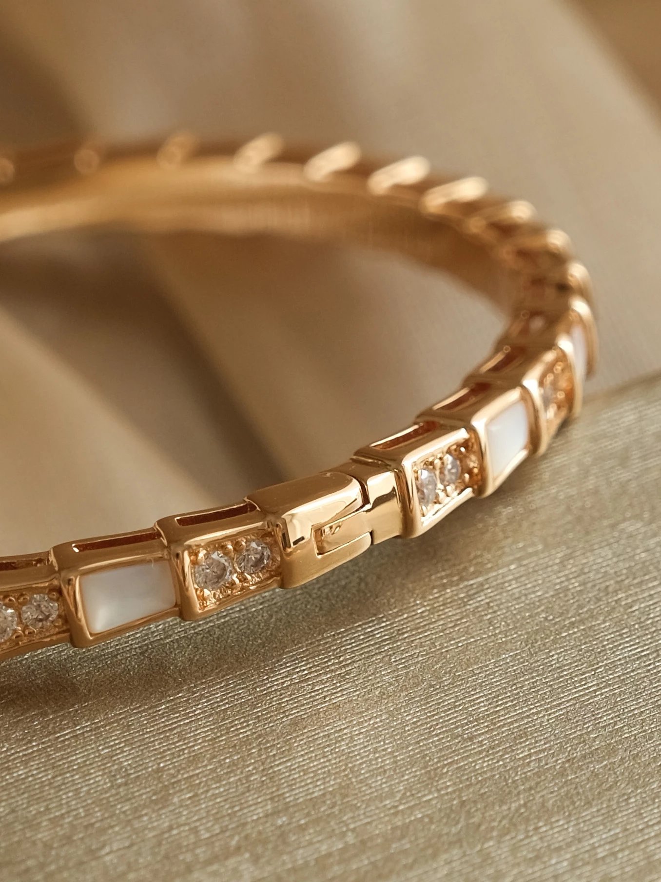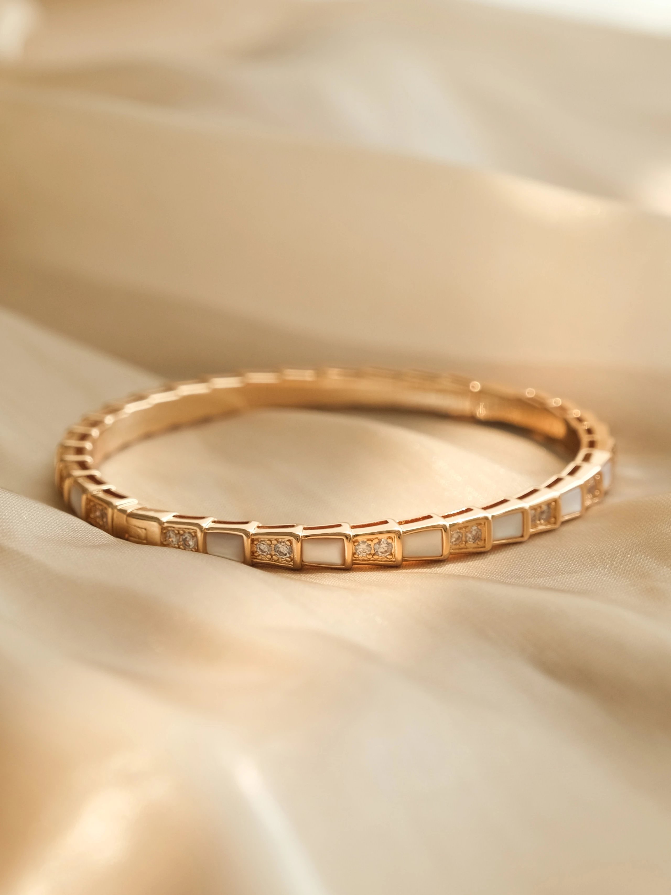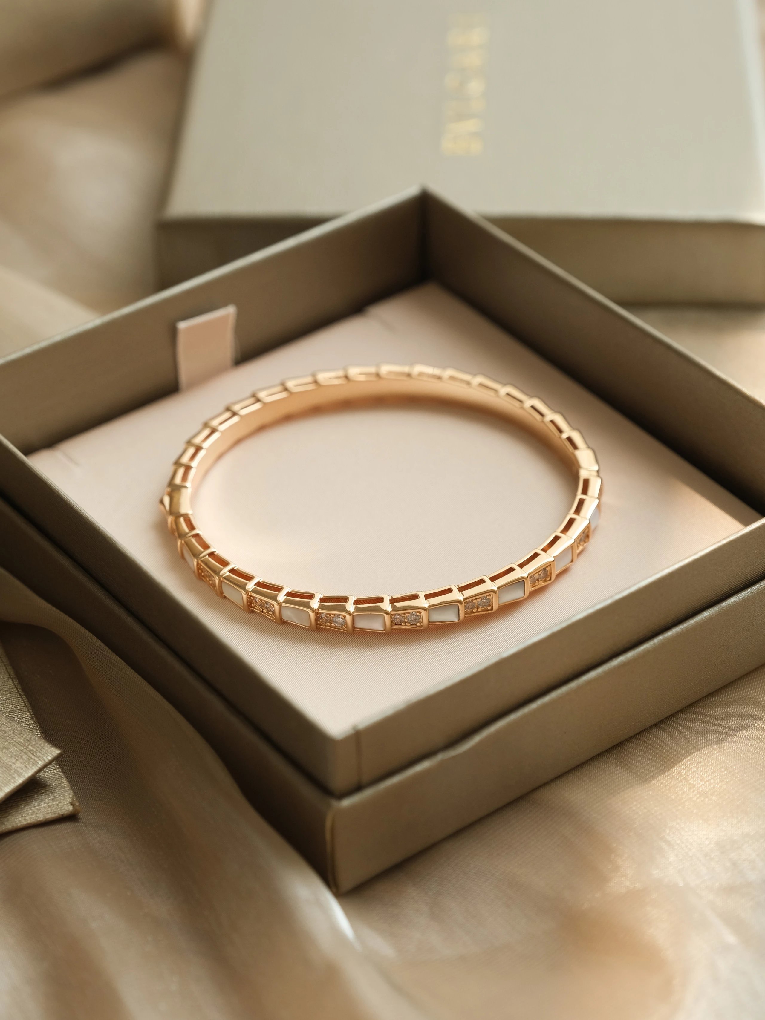 V金镀咪金 高级精工版 BVLGARI宝格丽天然灰贝母蛇手镯 宝格丽贝壳蛇手镯细腻妖娆的线条设计,饰以明亮钻石让霸气也可以有女人味!