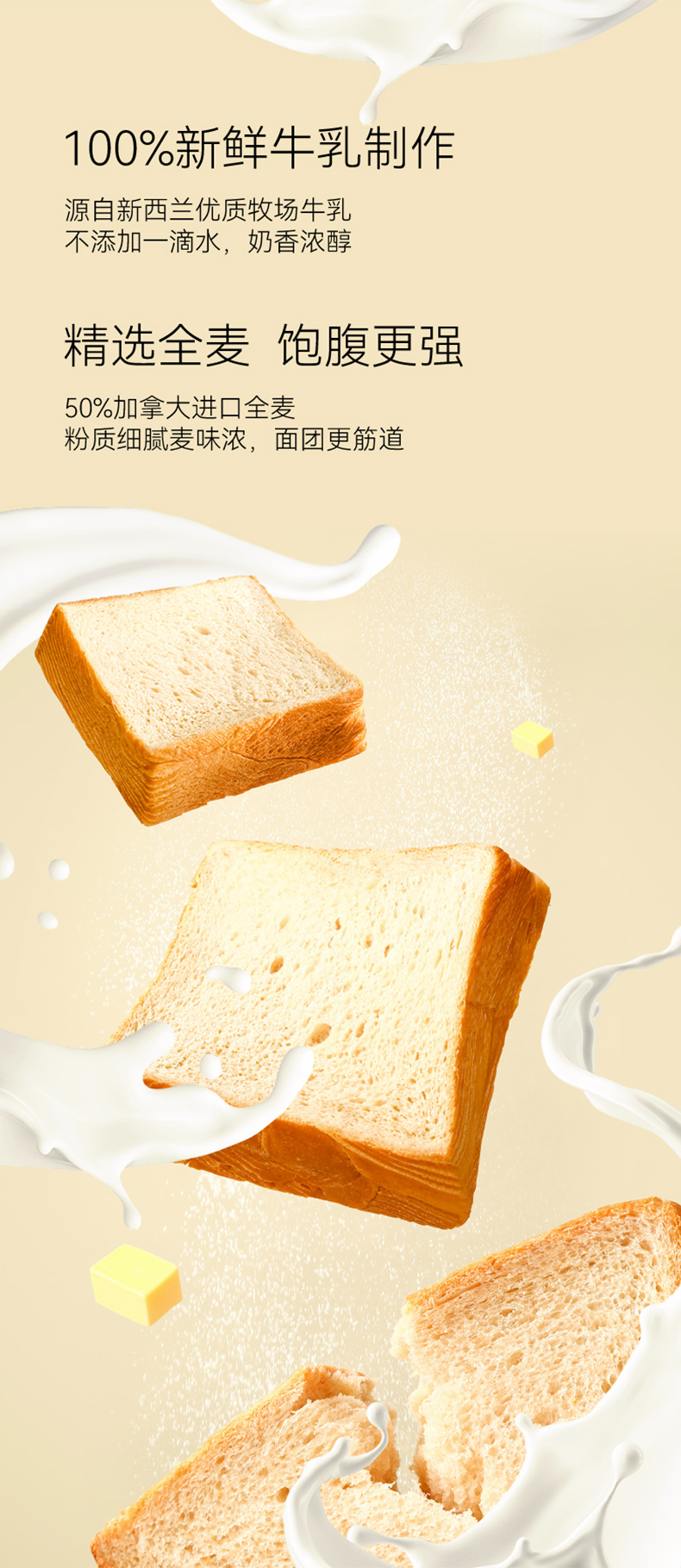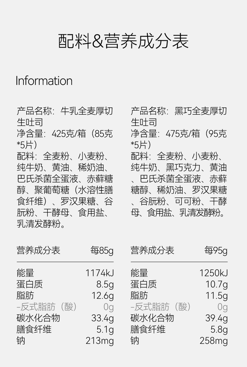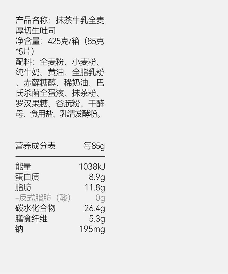 牛乳全麦厚切生吐司425g/箱(85g*5片)
