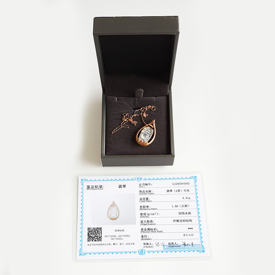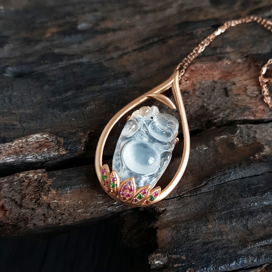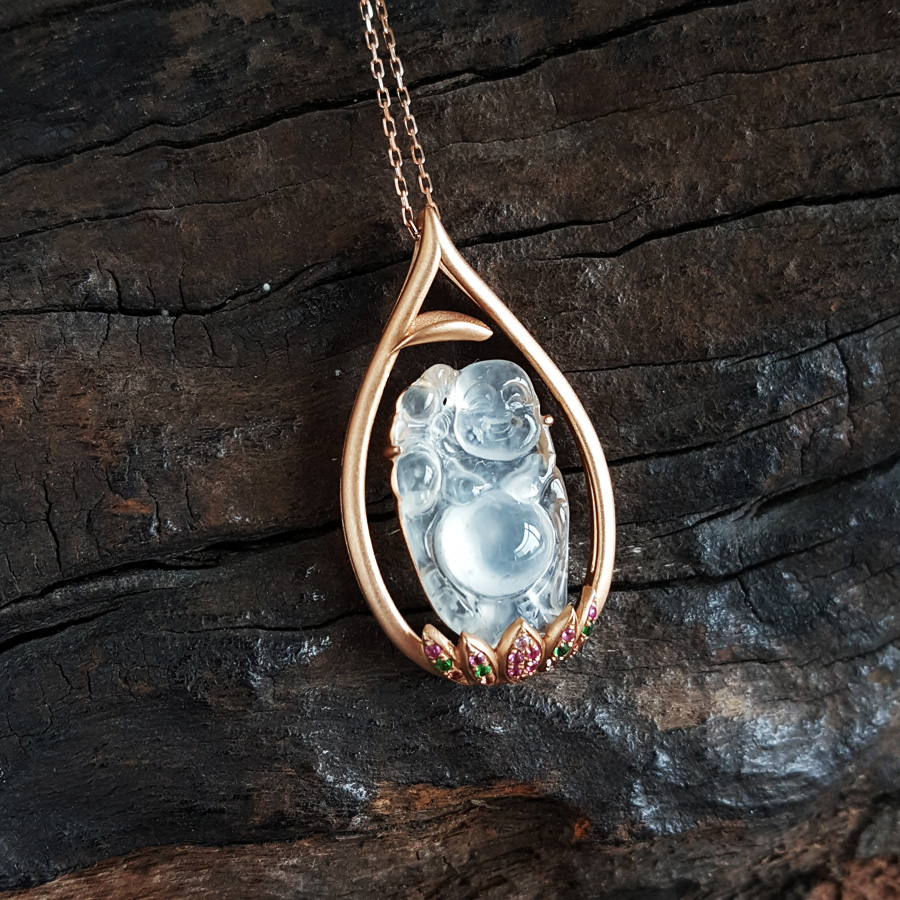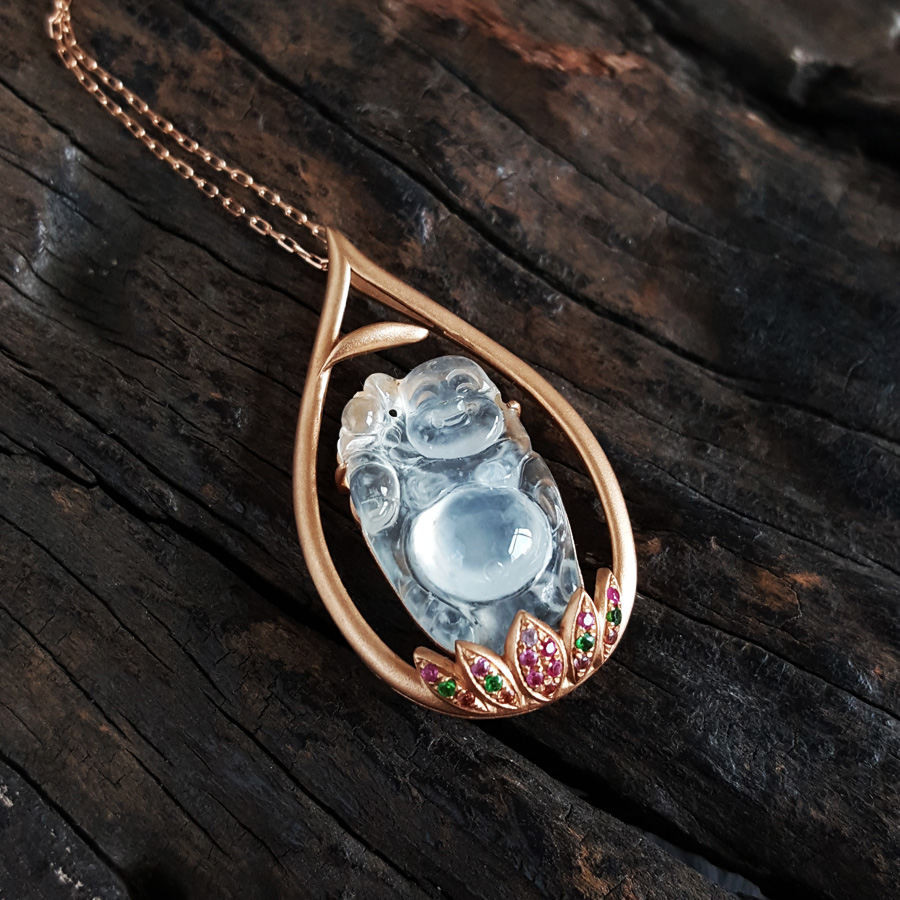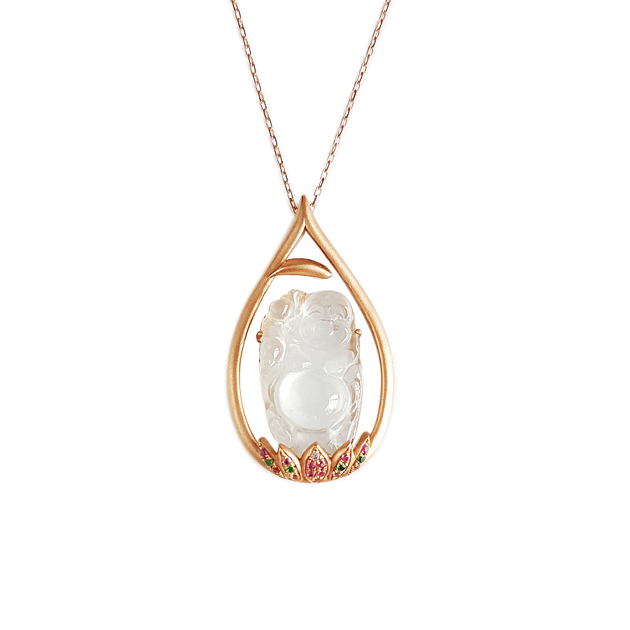 名称 | AU750玫瑰金镶天然高冰种佛公造型翡翠(平安、吉祥)吊坠项链 |