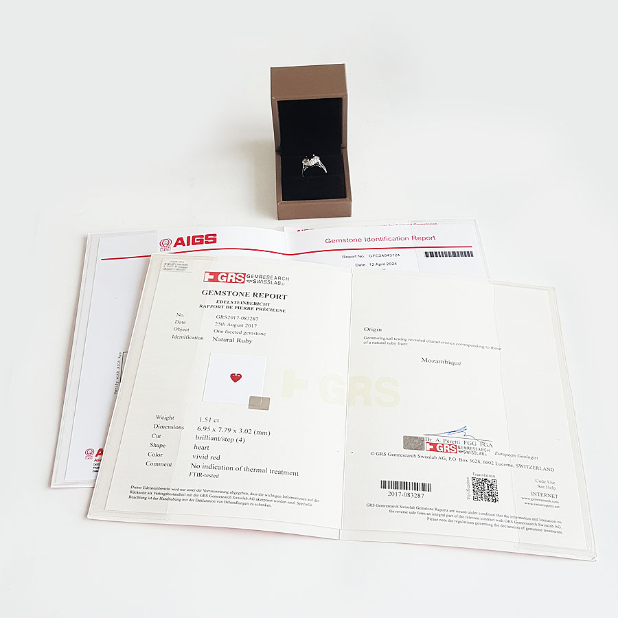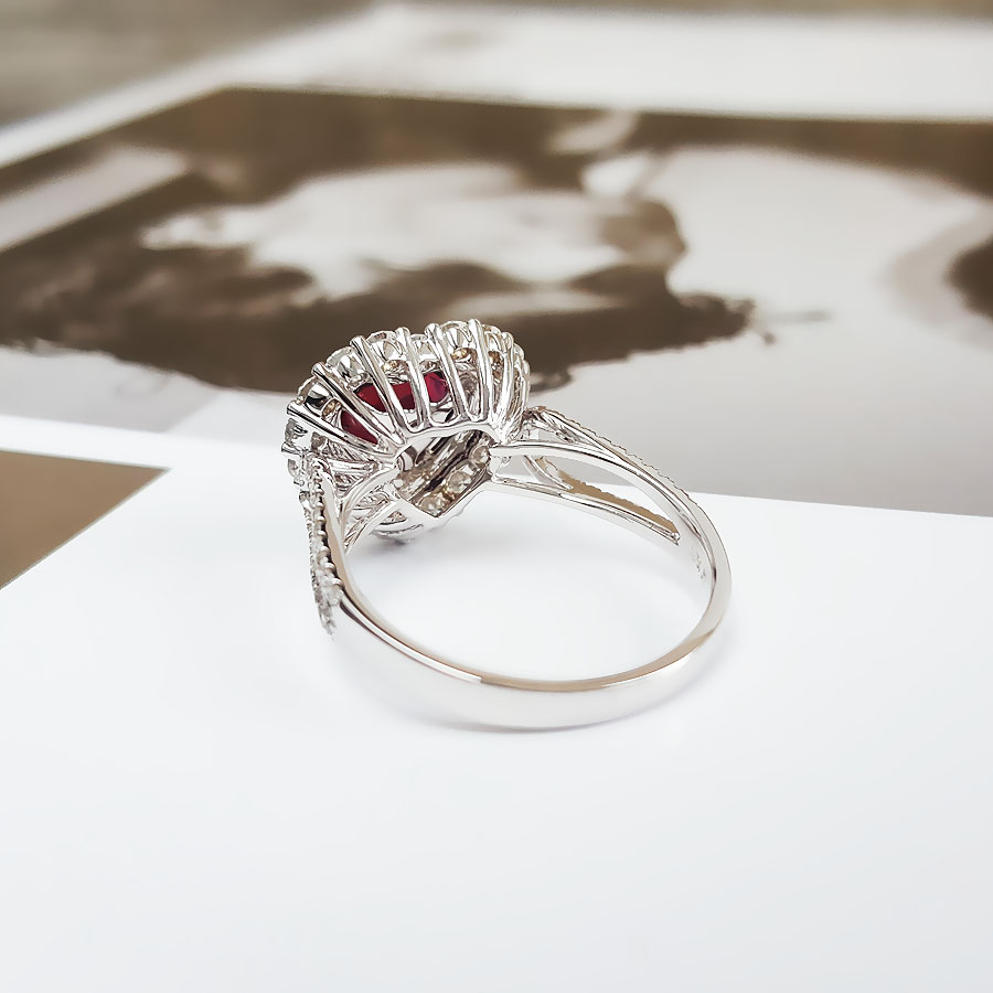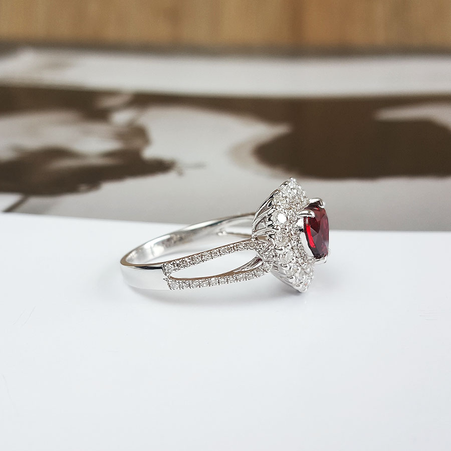 名称 | AU750收藏级白金镶钻镶天然1.51克拉无烧莫桑比克鸽血红红宝石戒指 |