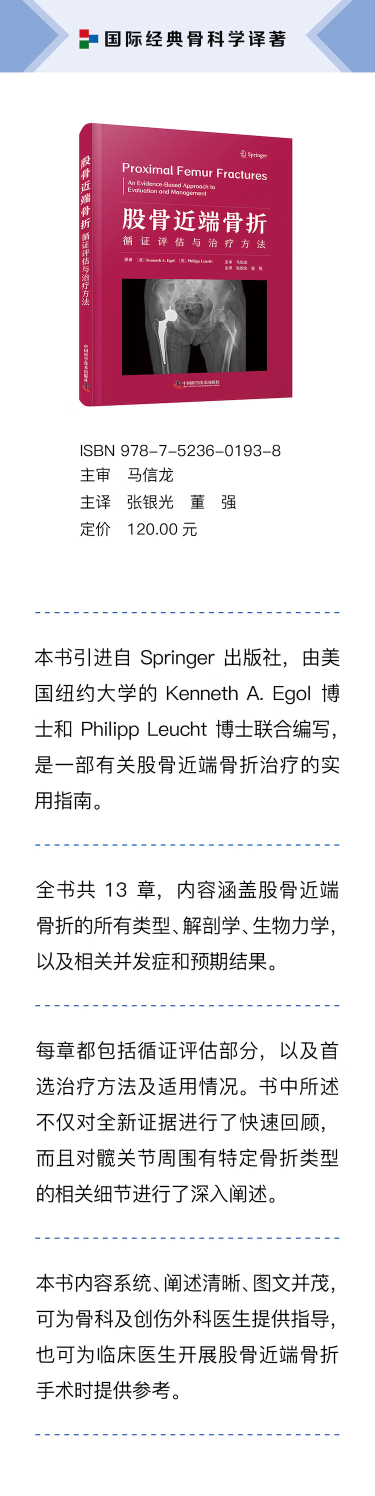 本书引进自 Springer 出版社,由来自美国纽约大学的 Kenneth A. Egol 博士和 Philipp Leucht 博士联合编写,是一部有关股骨近端骨折治疗的实用指南。本书共 13 章,系统阐述了股骨近端骨折各方面评估与治疗的最新信息,先讨论了股骨近端的基本原理,包括解剖学、生物力学和手术方法,然后针对不同骨折位置和类型进行了细致阐述,如股骨头和股骨颈骨折、转子间及转子下骨折、骨不连等,同时还介绍了最佳围术期医疗管理及质量与安全问题。每章都包括循证评估部分,以及首选的治疗方法及适用情况。书中所述不仅对最新证据进行了快速回顾,而且对髋关节周围有特定骨折类型的相关细节进行了深入阐述。本书内容系统、阐述清晰、图文并茂,可为骨科及创伤外科医生提供指导,也可为临床医师开展股骨近端骨折手术时提供参考。