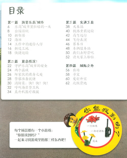 适读人群 :7-14岁 《乐高城市创意认知词典》为小读者营造了一个有趣的认知情境,在乐高城市中认识事物、学习词语、分别图形颜色、描绘故事情节,图书编辑还创造性的在本书的中文版改造成中英文双语,为小读者提供更丰富的阅读体验。 借助乐高积木搭建的城市场景,《乐高城市创意认知词典》更有助于激发小读者学习语言和词汇。并且,全书拥有超过500个单词,分布在书中已有的乐高城市场景中,乐高城市的繁忙生活与认知词语完美结合,对车辆、建筑物、工作和人物、动物、植物等尽情展示,全书还有一个简单的故事贯穿始终,对于小读者来说十分生动有趣。 经过精心的编排,《乐高城市创意认知词典》将五颜六色的乐高场景与真实的城市生活紧密联系,为小读者搭建了一个又一个生动的场景:警察抓骗子、消防员在消防站培训、公园里叫卖的餐车、建筑工地上工作的人事物……图文结合,与小读者金木互动。 如果发现书中有重复出现的词语和物品,还能激发书中另一个隐藏的所用——不断鼓励孩子参与阅读,同时通过一次又一次多样地重复,让孩子掌握词语的同时更能在生活中灵活使用。