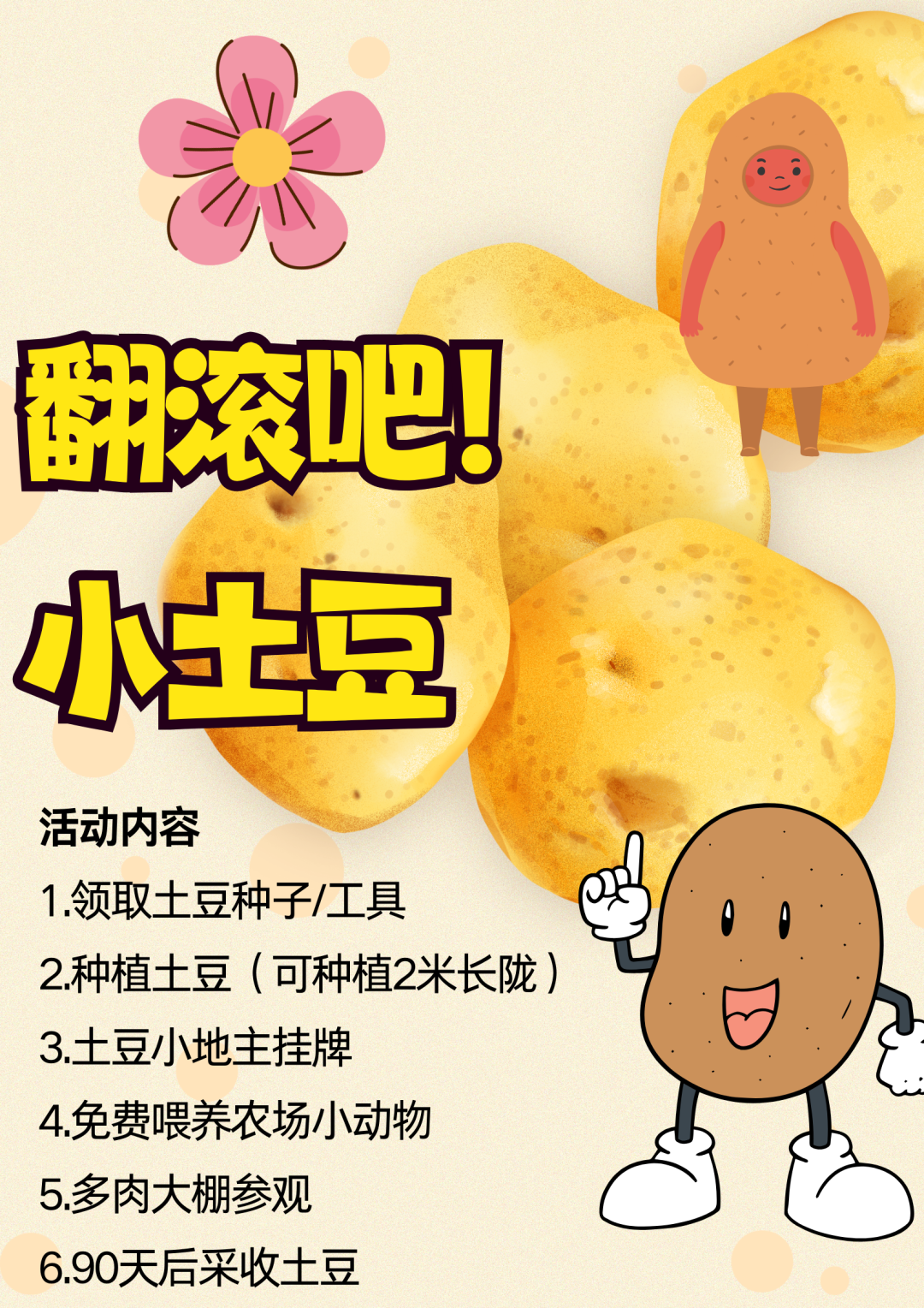 土豆是大多数小朋友的最爱,但你知道土豆是怎样播种长大的吗?农场已经准备好了土豆种子,等着小朋友们帮土豆宝宝回家。春天,家长们带着孩子走进田间地头,通过种植孩子们喜欢吃的土豆,培养孩子热爱生活,热爱劳动的优秀品格。