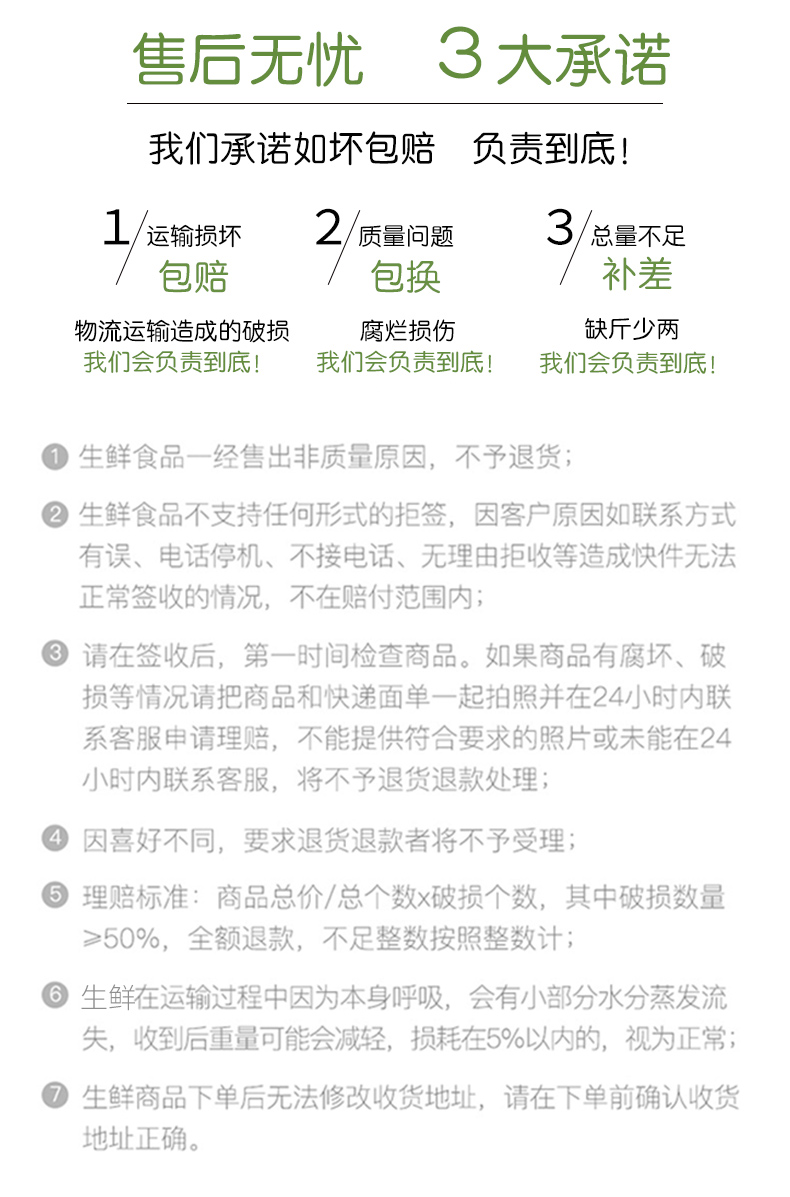 5、 因买家地址不详/有误/地址太偏/快递超区/需自提不及时自提、电话联系不上等原因造成水果送货延迟导致水果变质腐烂,不予赔偿,偏远地区的顾客,请慎重购买。