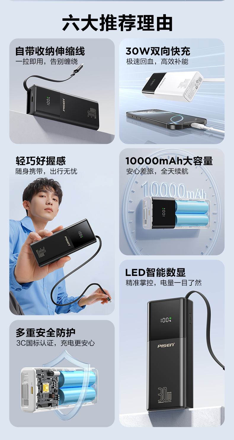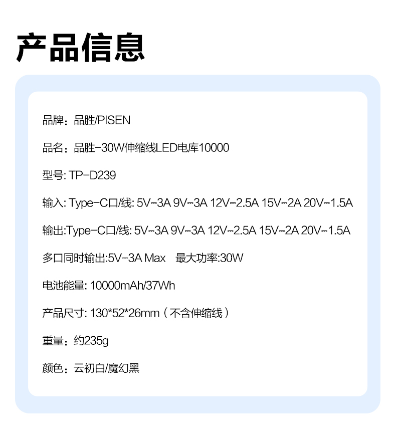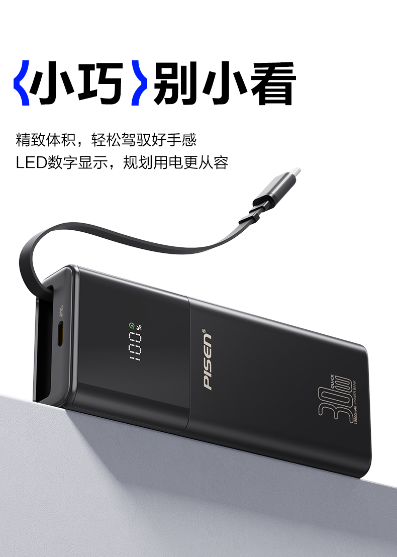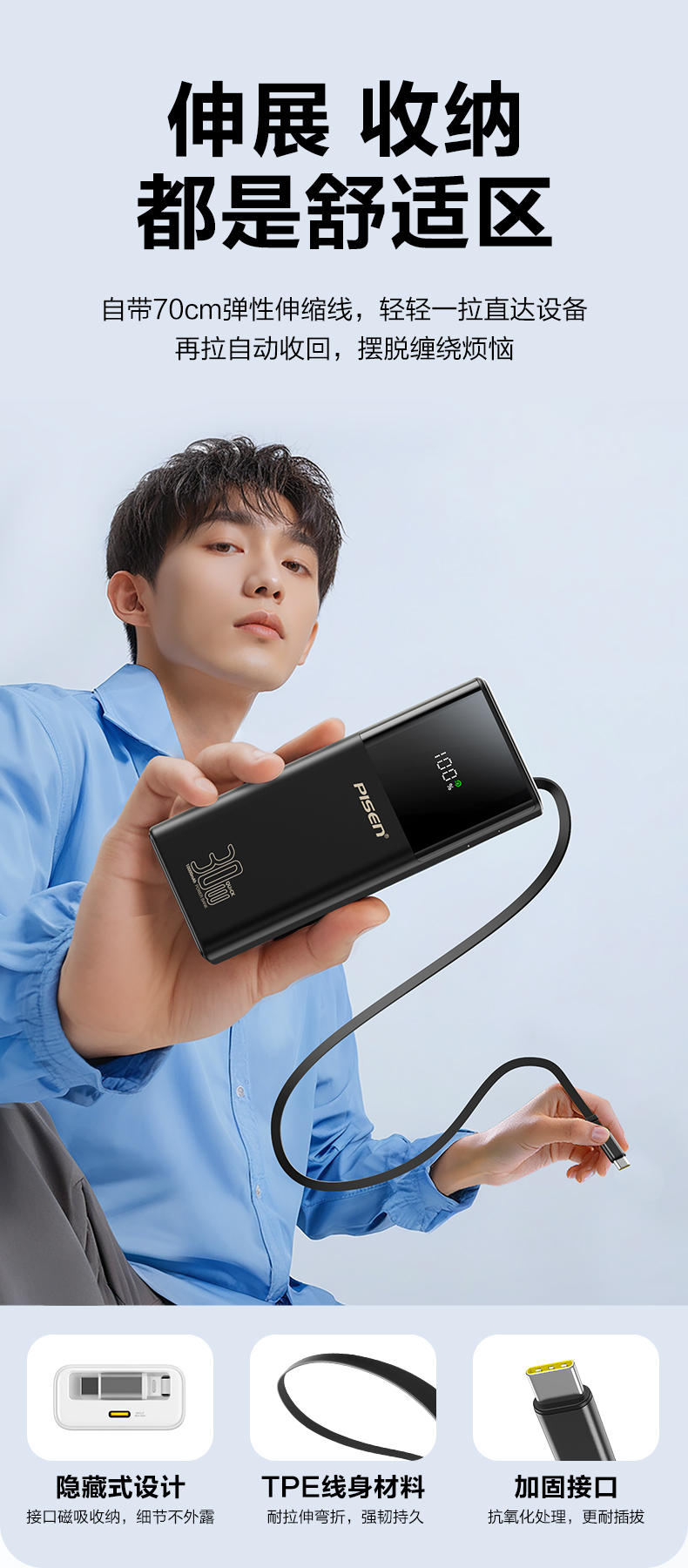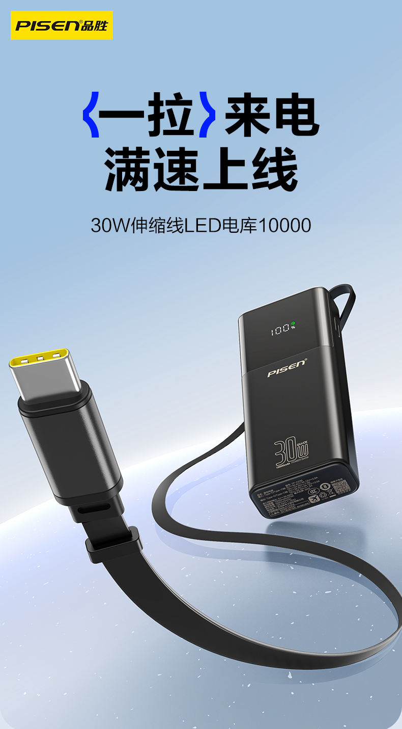 品胜 30W伸缩线LED电库10000毫安 移动电源支持华为小米苹果15自带Type-c线充电宝