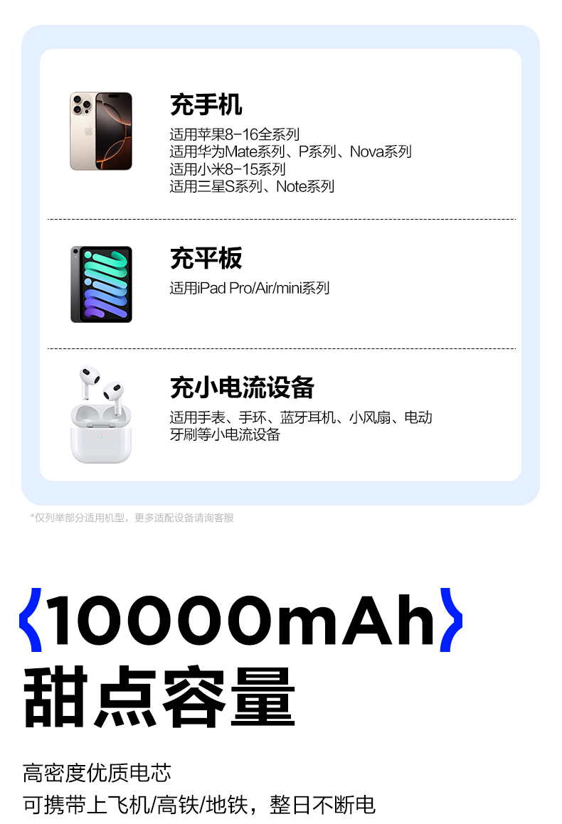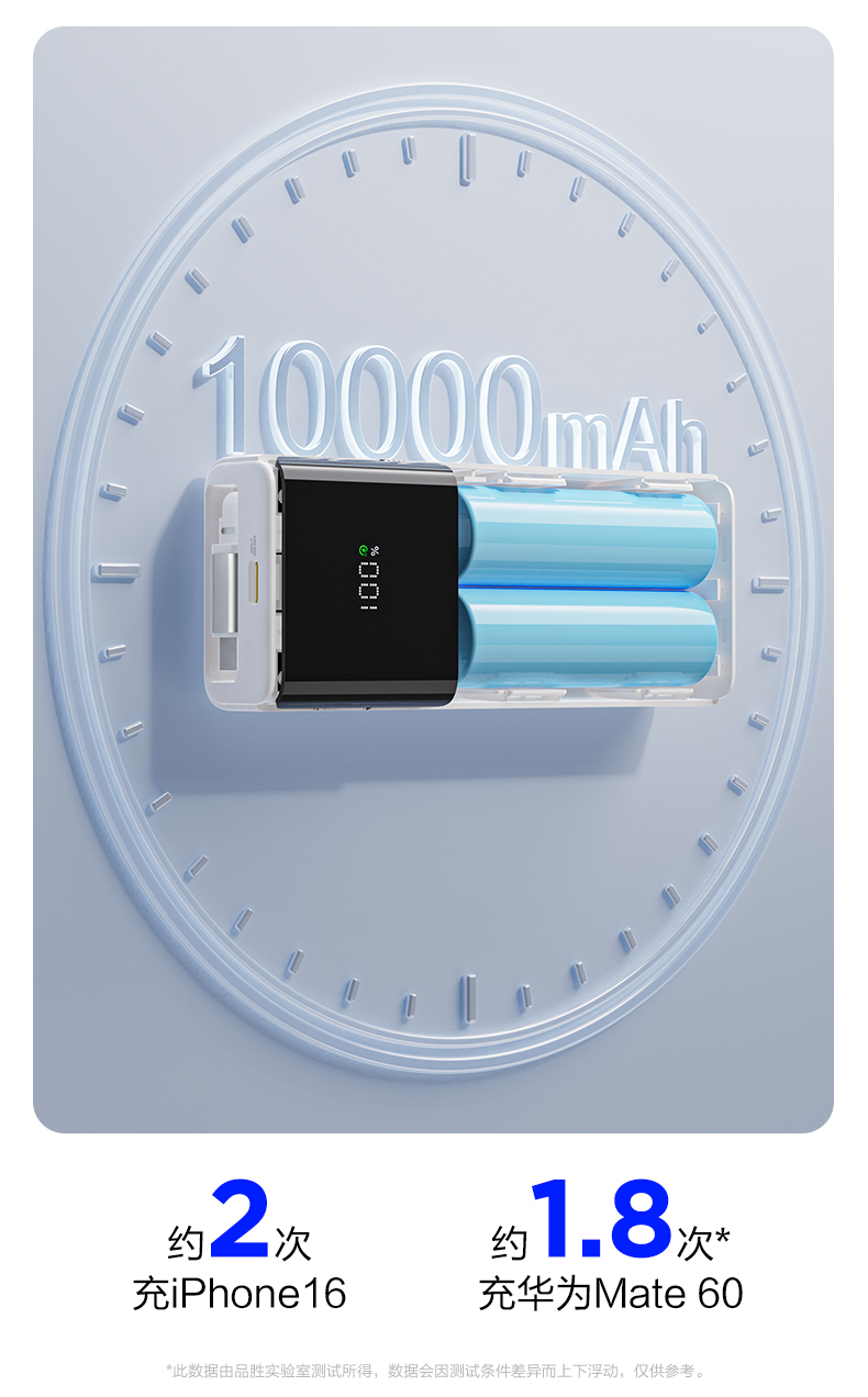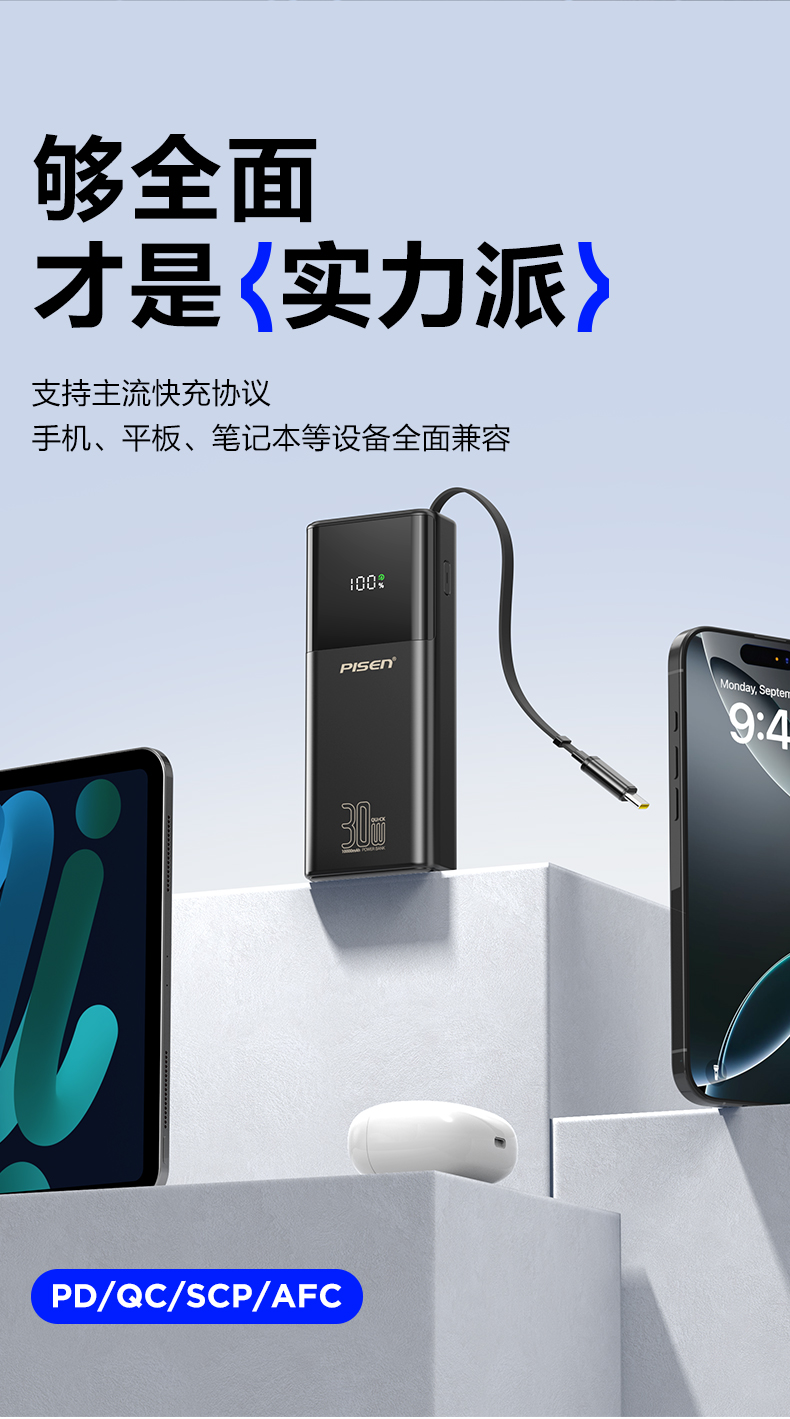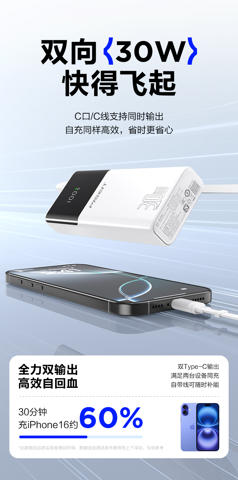 品胜 30W伸缩线LED电库10000毫安 移动电源支持华为小米苹果15自带Type-c线充电宝