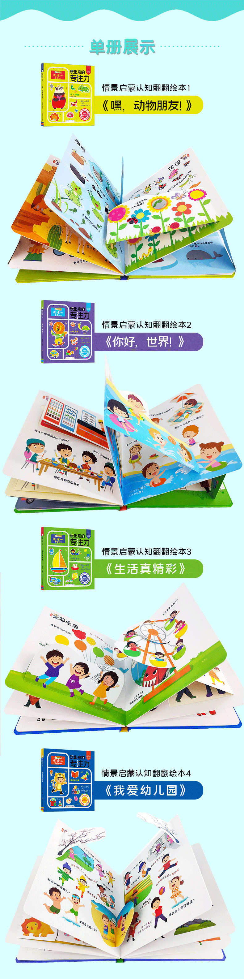 玩出来的专注力(全4册)赠 音频 3岁+ 4大主题40个生活场景300个互动问答50+翻翻洞洞机关动物/生活/幼儿园/你好
