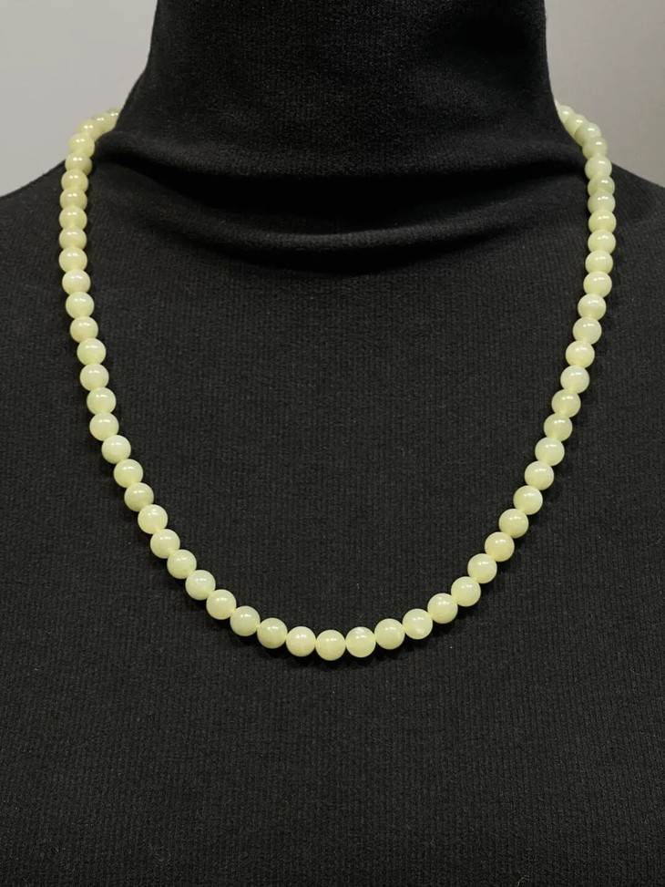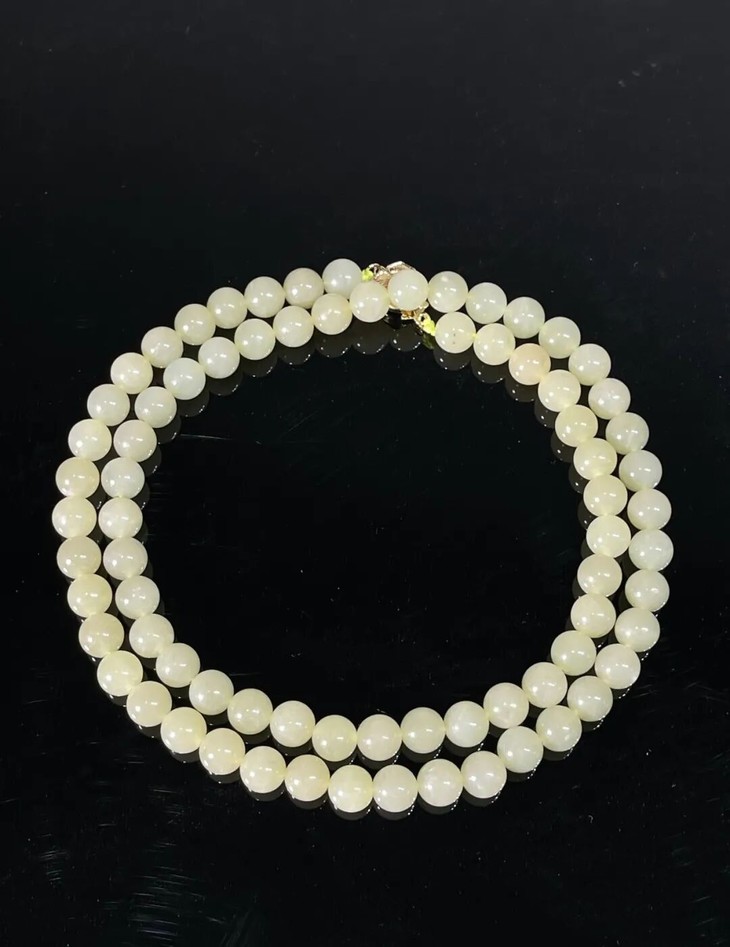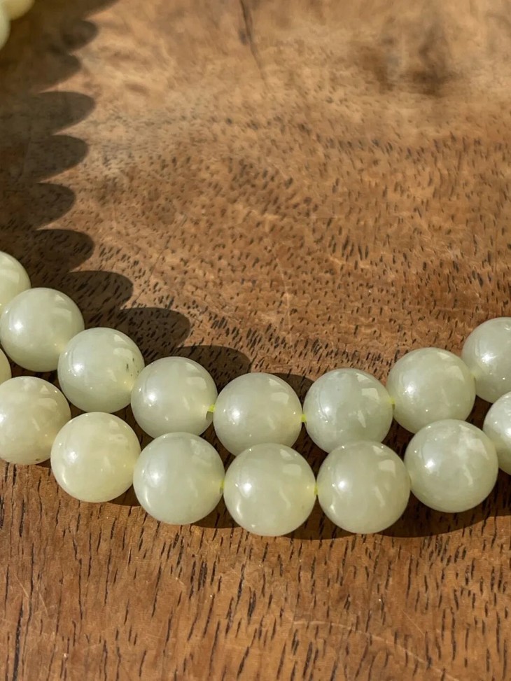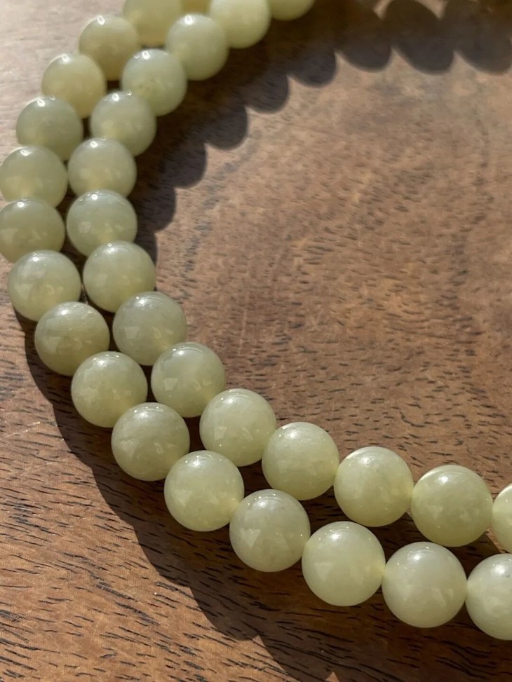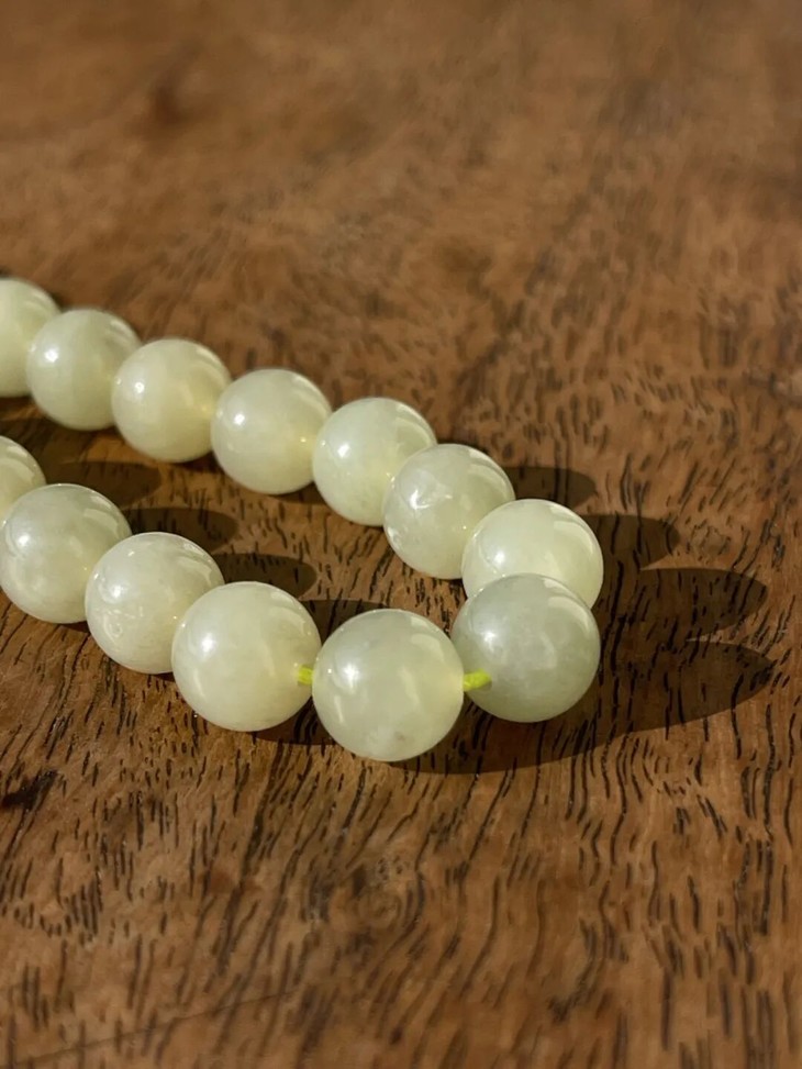 这是一组产于新疆若羌地区的淡青黄色白玉,此种淡青黄色玉俗称和田黄口料,此组黄口料白玉珠共108颗圆珠,设计成淑女项链、银钩耳坠以及手链三件首饰套组。