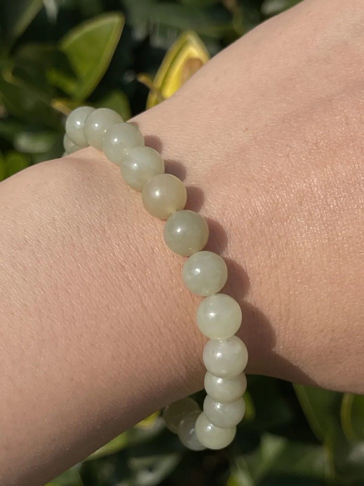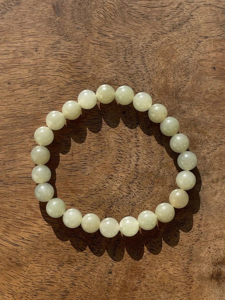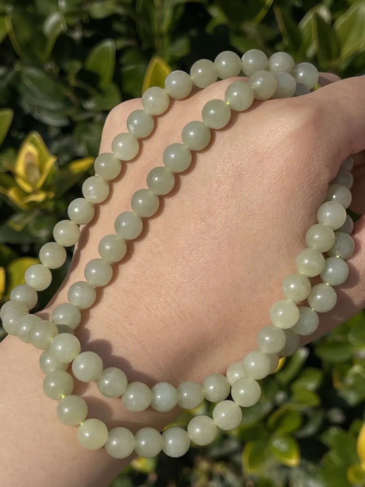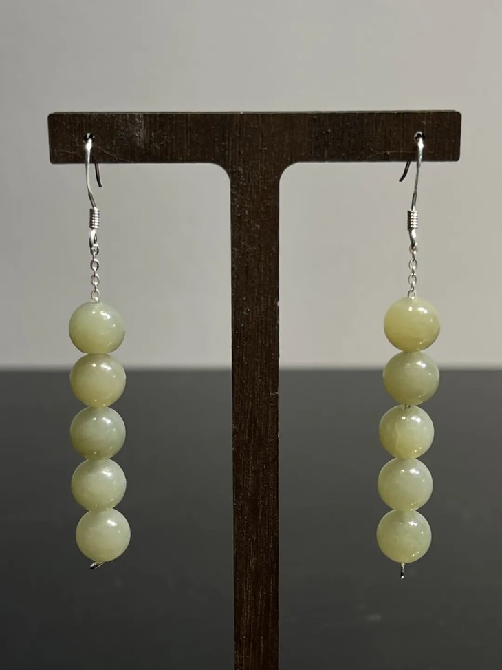 这是一组产于新疆若羌地区的淡青黄色白玉,此种淡青黄色玉俗称和田黄口料,此组黄口料白玉珠共108颗圆珠,设计成淑女项链、银钩耳坠以及手链三件首饰套组。