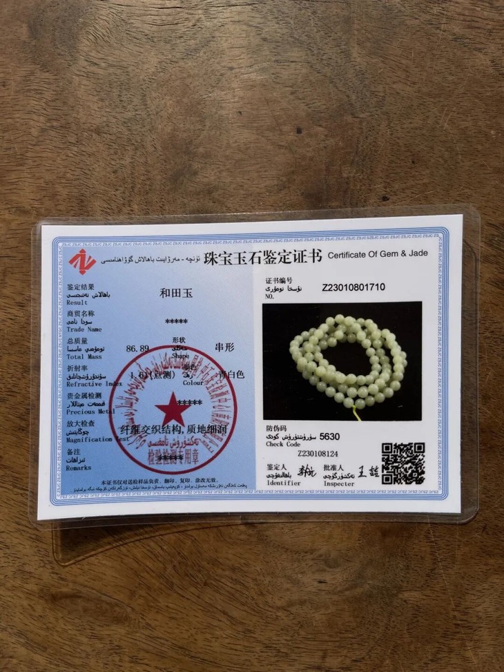 此组和田若羌黄口料白玉珠首饰三件套组,整组淡黄豆绿色,质地半通透纯度高,油润度高。虽然是山料,质量却类似籽料白玉。共108粒,其中75粒穿线搭配金属扣环串成淑女项链,23粒以弹性伸缩线串成手链,以及10粒搭配925银耳钩设计成一对耳坠,设计成一套首饰三件套组,和田若羌黄口料白玉珠色泽柔美质地貴气,可搭配时尚服饰。保存完好。或可善加利用,利用此组青黄色圆珠加些其它配件,依个人喜好设计出品味独特的时尚首饰。.附专业机构鉴定证书。