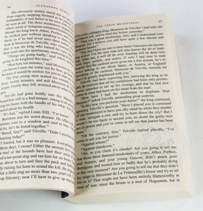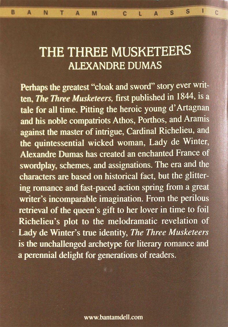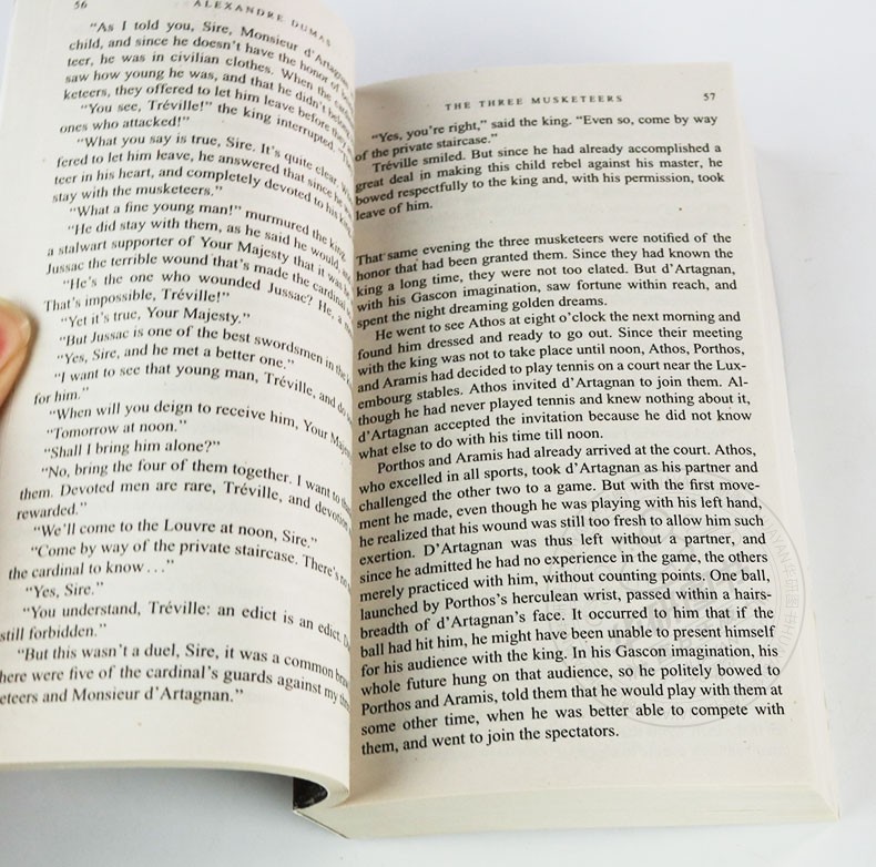 The Three Musketeers《三个火枪手》是法国浪漫主义作家大仲马于1844年出版的长篇小说,又译作《三剑客》或《侠隐记》,其以法国国王路易十三和手握重兵权倾朝野的首相黎塞留红衣主教的矛盾为背景,穿插群臣派系的明争暗斗,围绕宫廷里的秘史轶闻,展开了极饶趣味的故事。书中的主人公为达达尼昂(d'Artagnan),三个火枪手分别是阿多斯(Athos),波尔多斯(Porthos),和阿拉密斯(Aramis)。小说中的情节曲折惊险,对话有趣,并设置众多悬念,故事紧扣,通俗易懂,是大仲马的特色代表作之一,非常值得外国文学爱好者阅读。