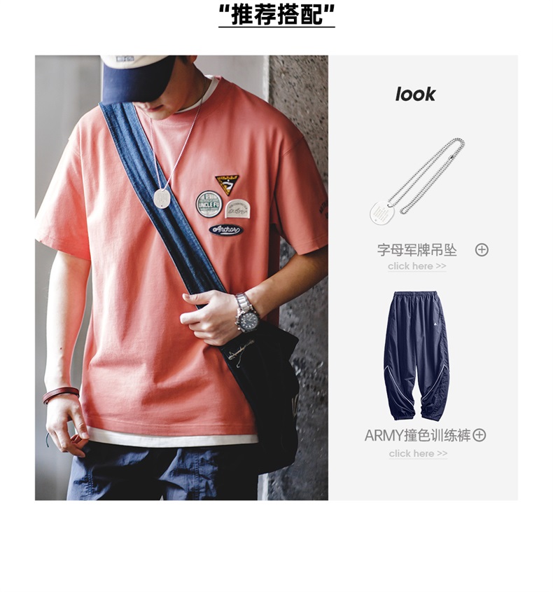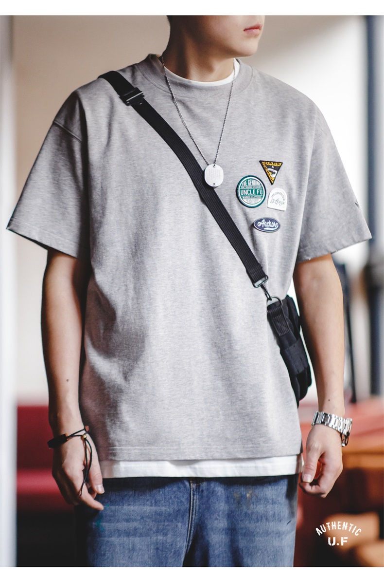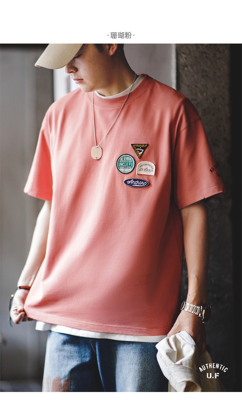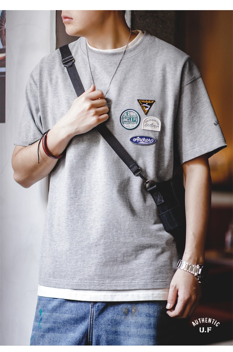 工装优选美式休闲刺绣徽章短袖t恤设计感纯棉圆领五分袖Tee男夏季