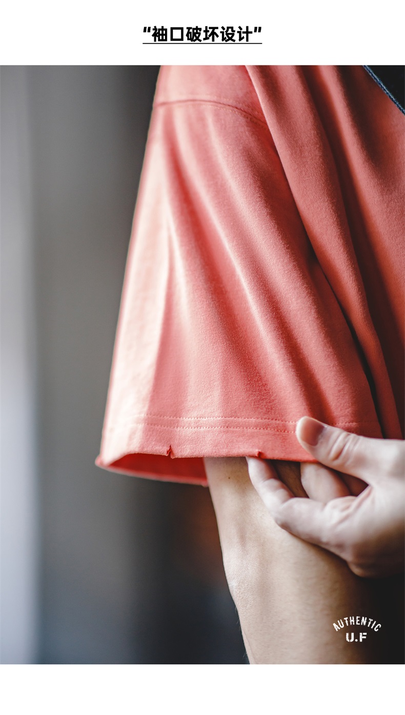 工装优选美式复古字母贴布卫衣渐变色水洗做旧宽松圆领T恤男春季