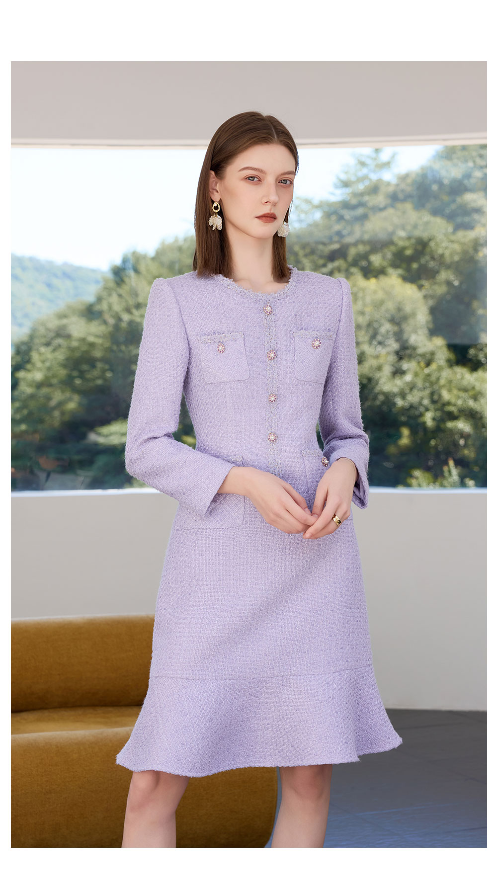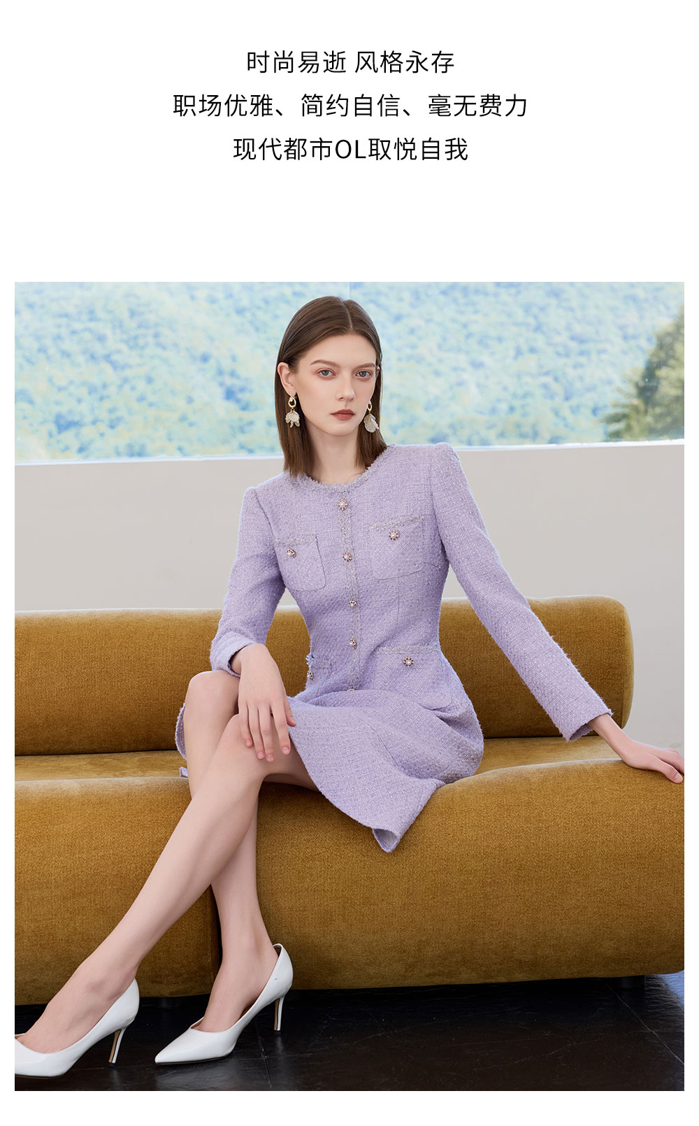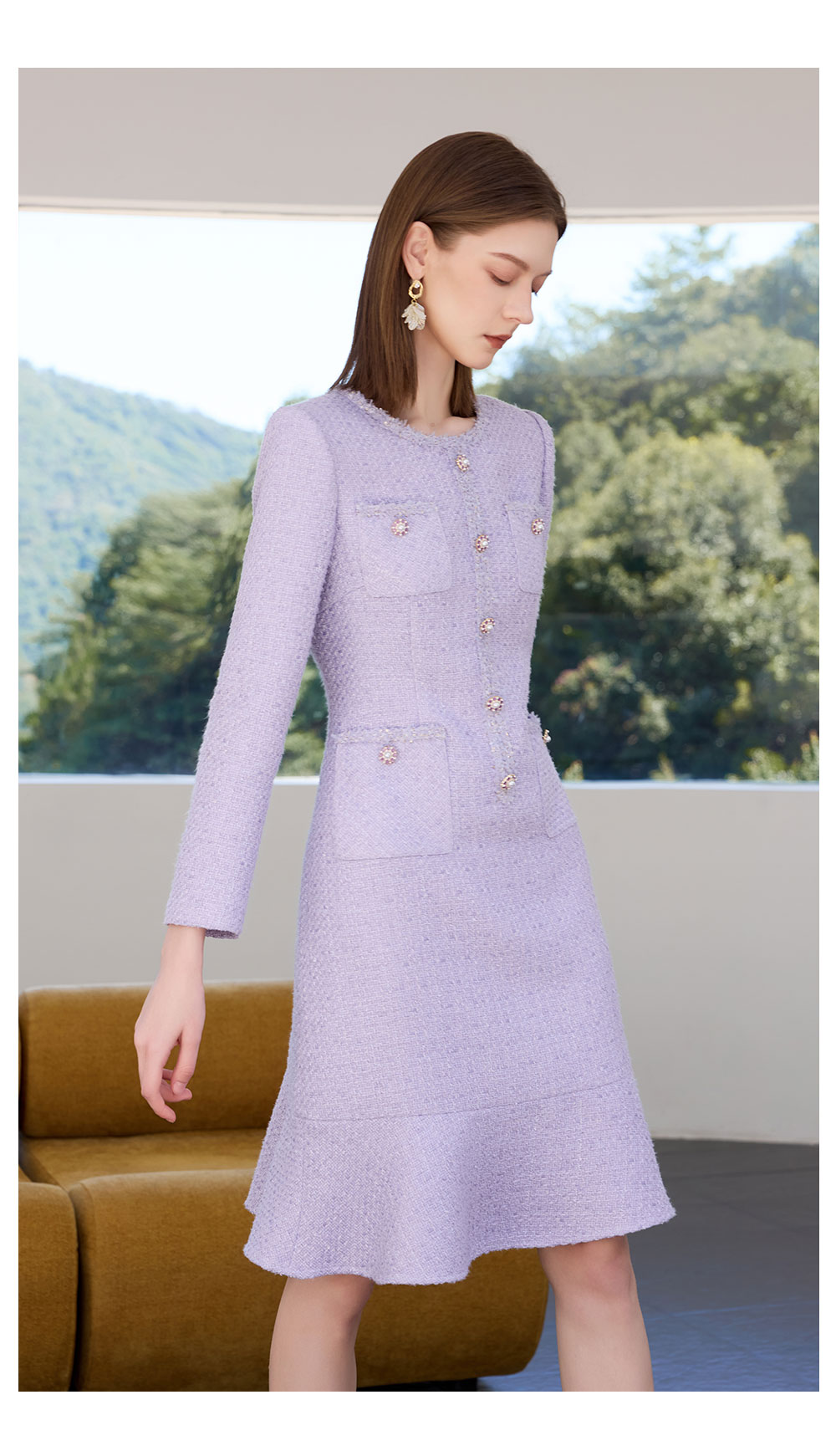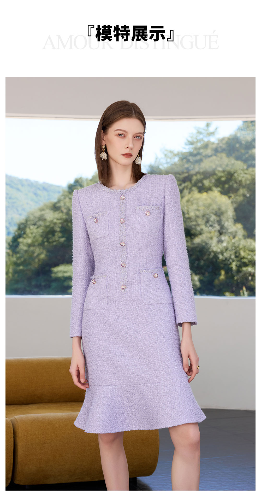 AD冬季新款气质优雅名媛女装圆领长袖修身中长款荷叶边毛呢连衣裙