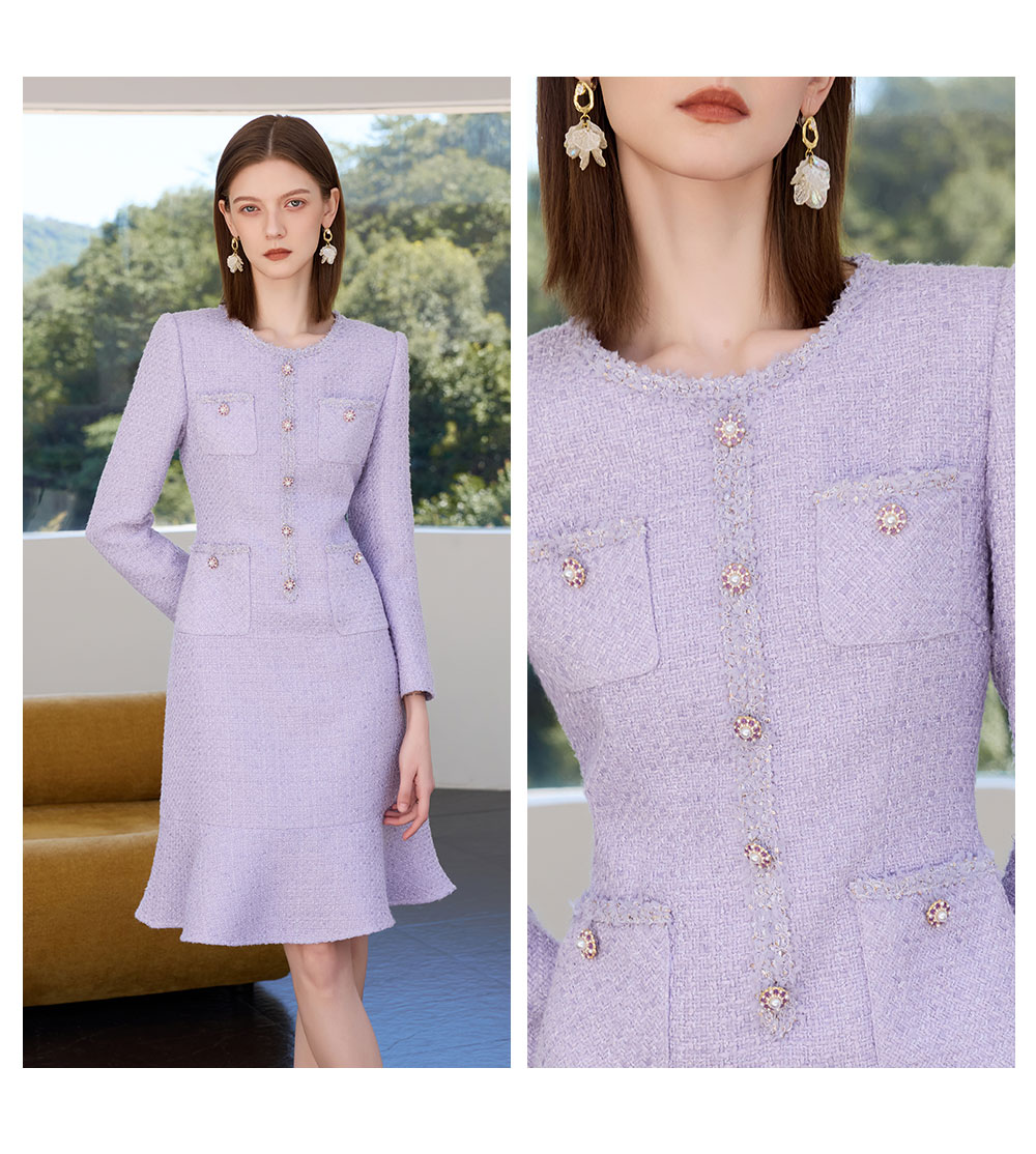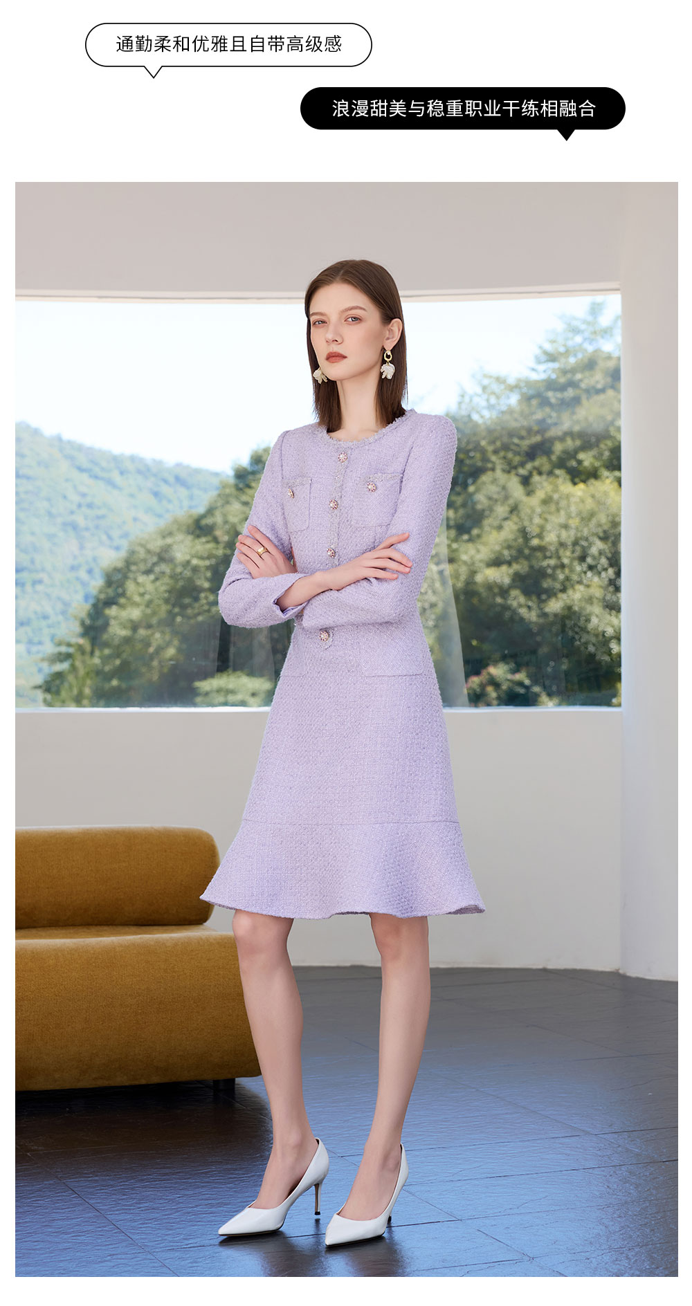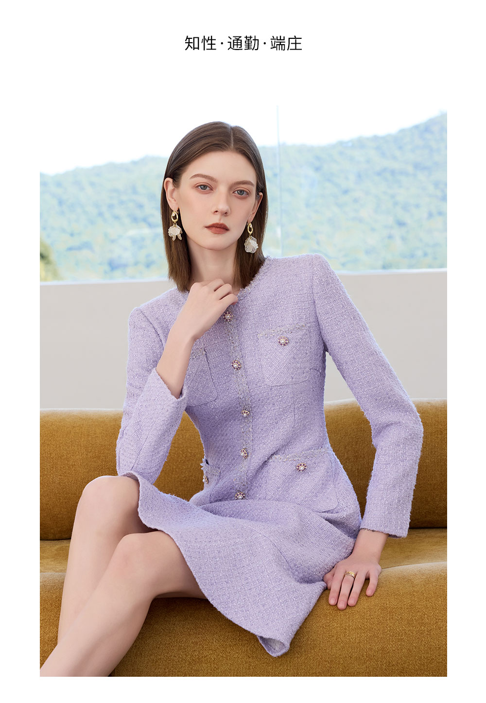 AD冬季新款气质优雅名媛女装圆领长袖修身中长款荷叶边毛呢连衣裙