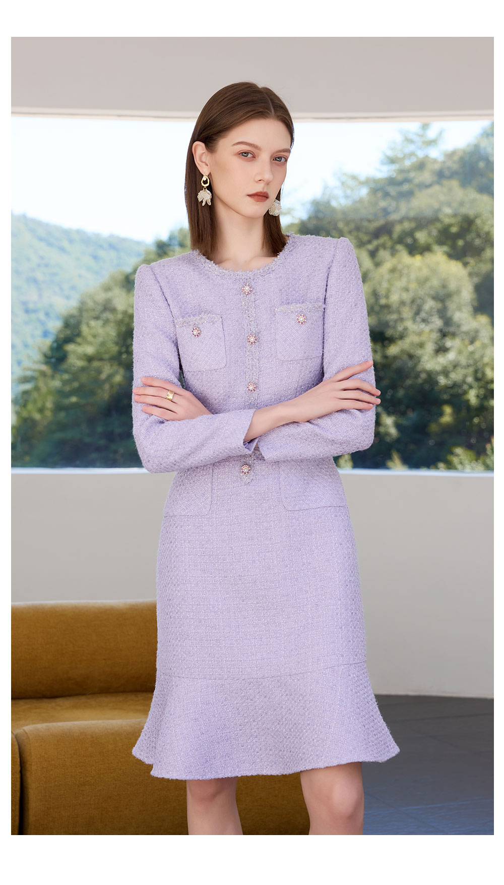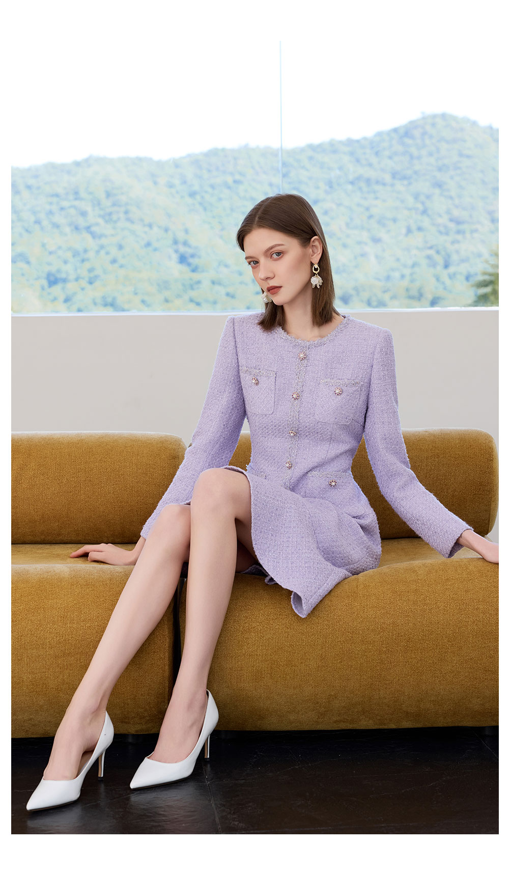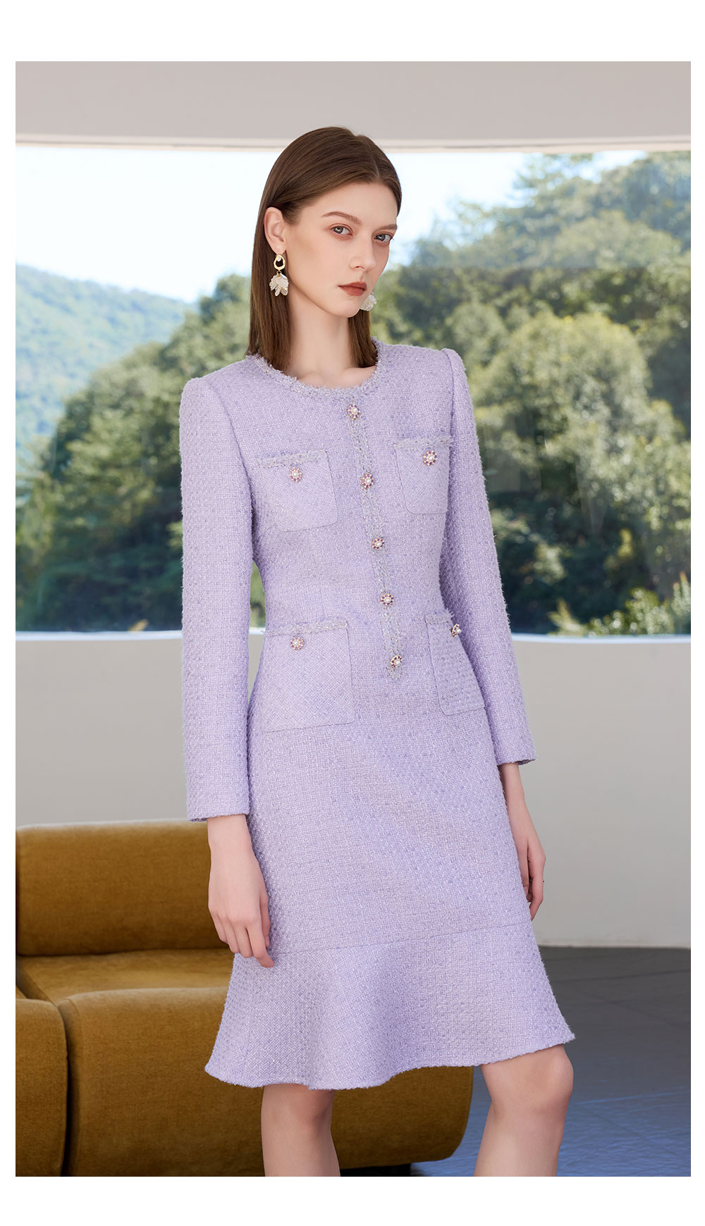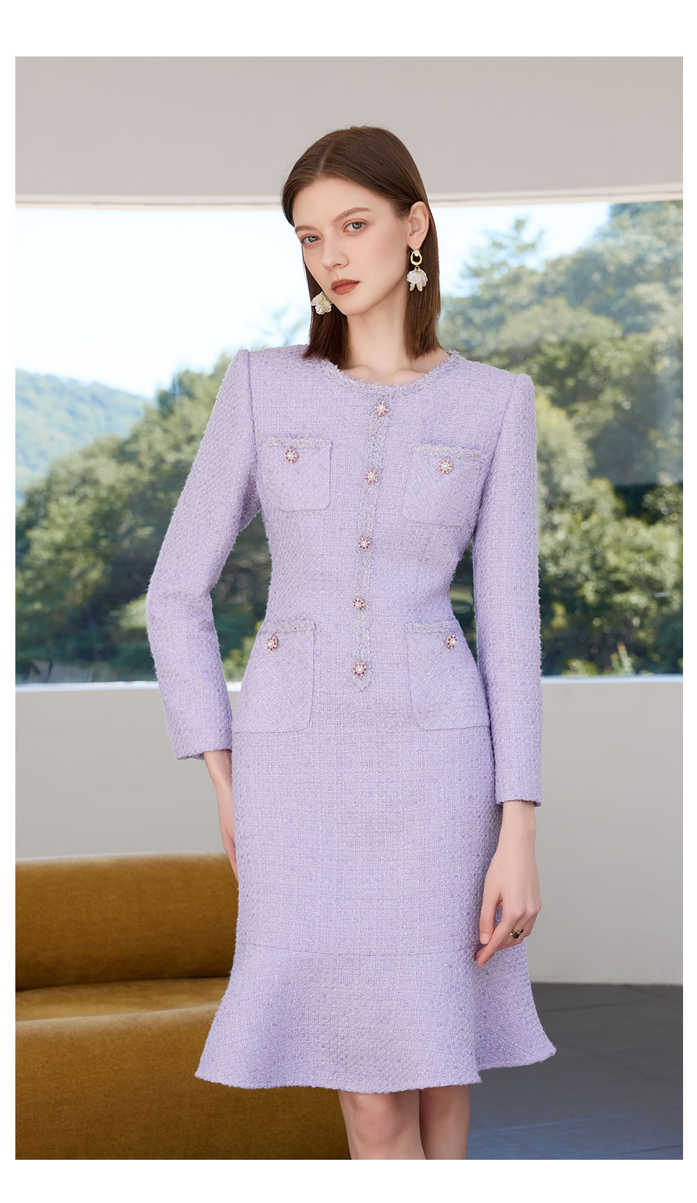 AD冬季新款气质优雅名媛女装圆领长袖修身中长款荷叶边毛呢连衣裙