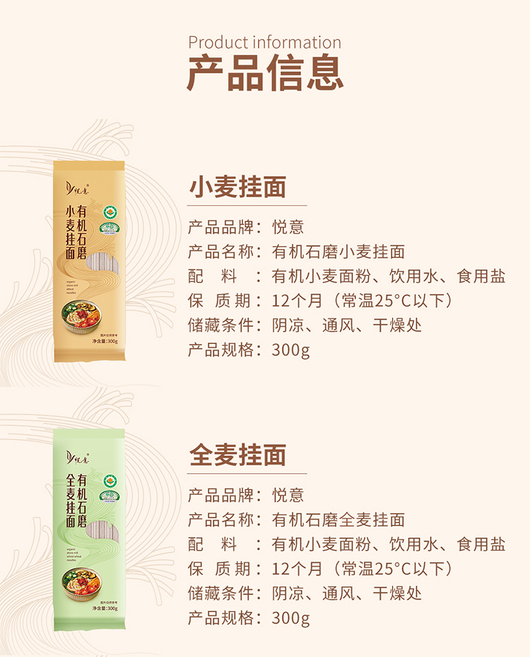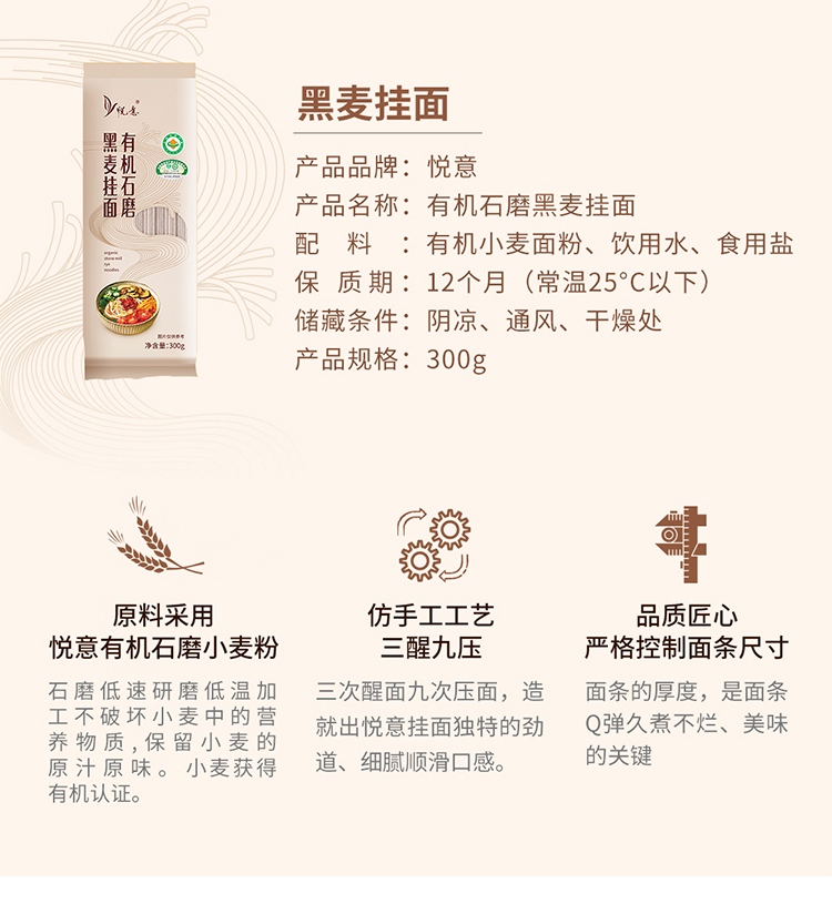 悦意有机石磨全麦黑麦小麦挂面无添加面条外滑内筋浓郁主食300g
