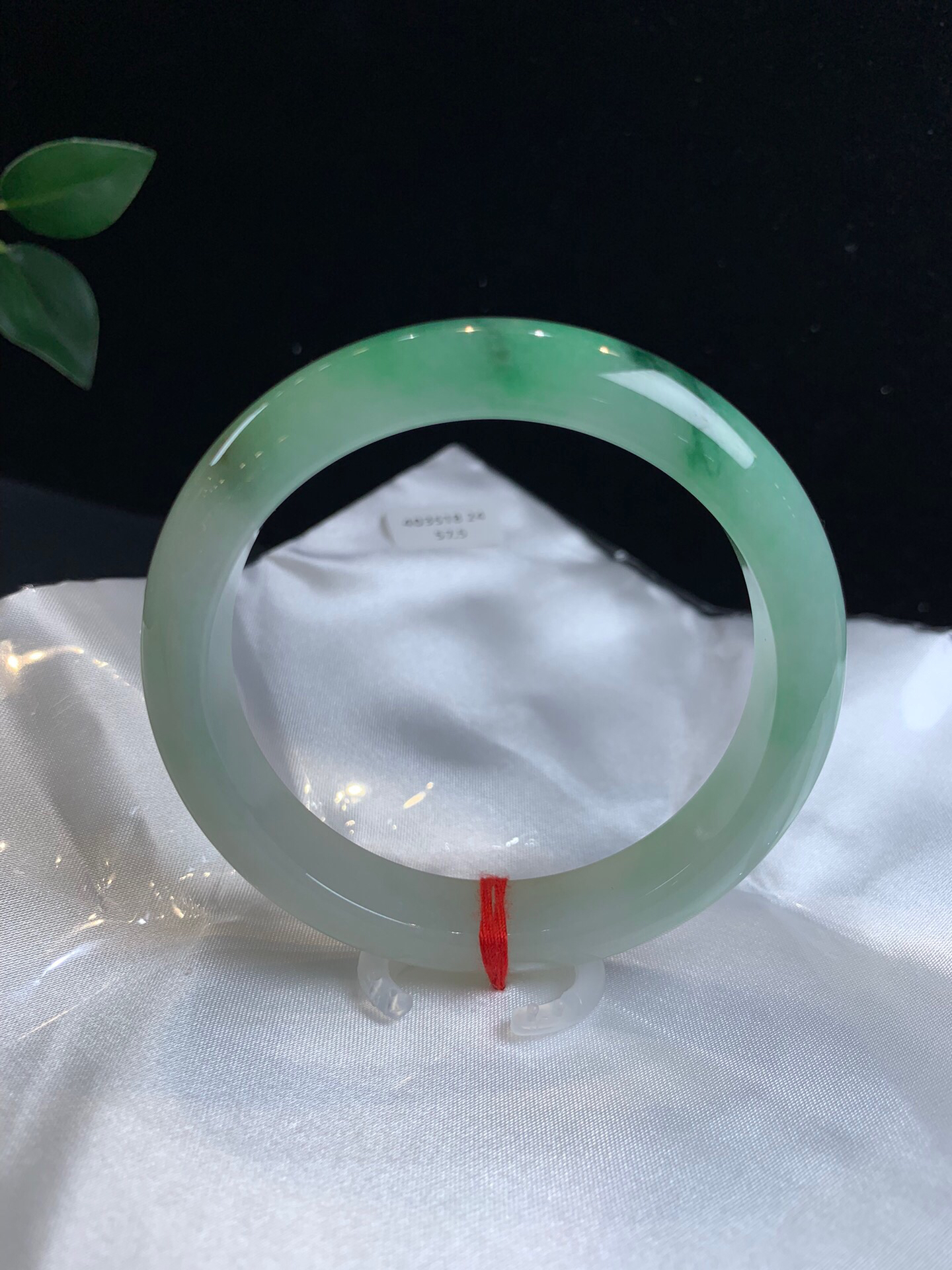620566,57.5带绿正圈手镯,种水不错,清新细条,一截带色